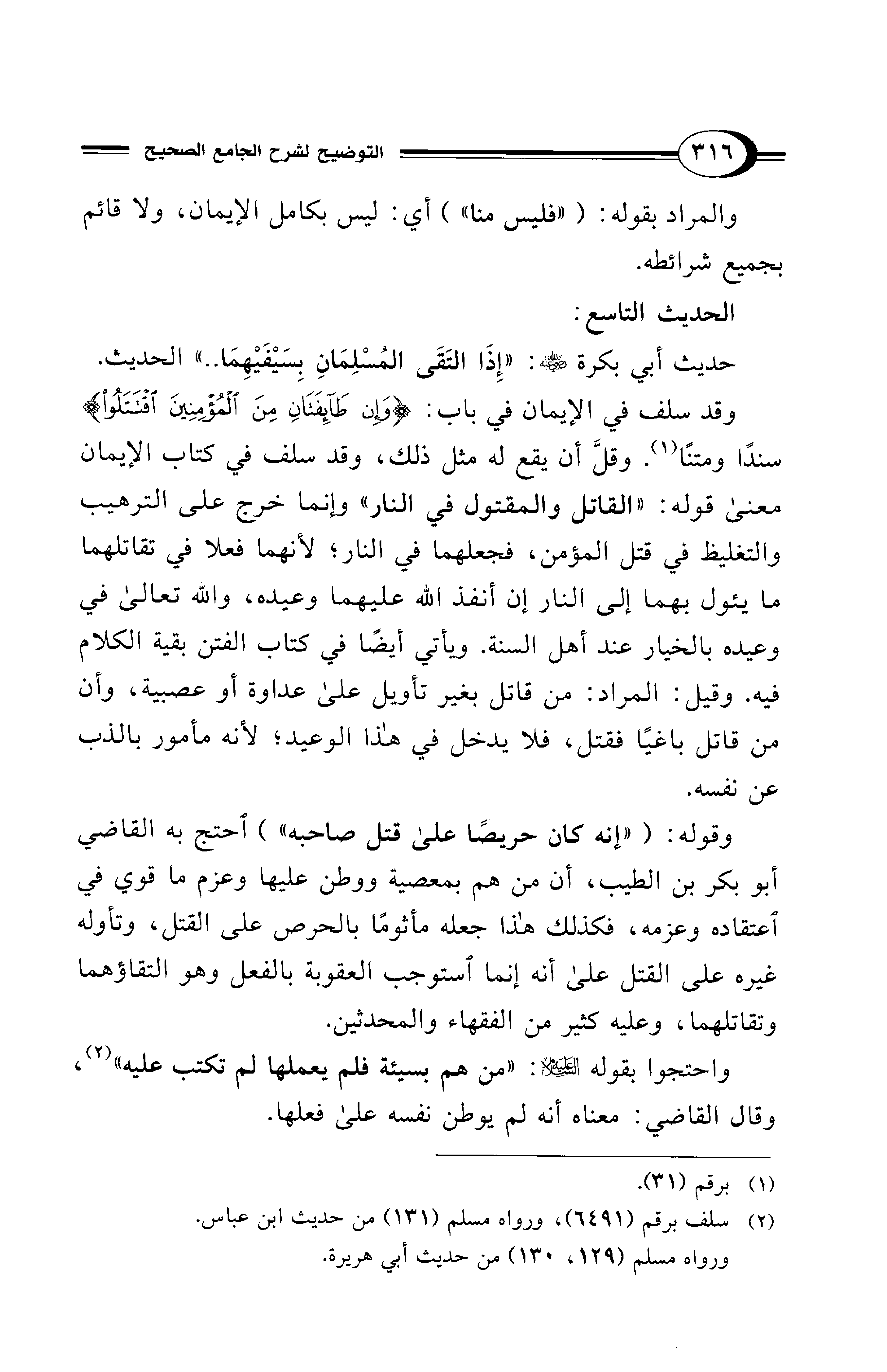حديث أبي بكرة - رضي الله عنه -: "إِذَا التَقَى المُسْلِمَانِ بِسَيْفَيْهِمَا .. " الحديث.