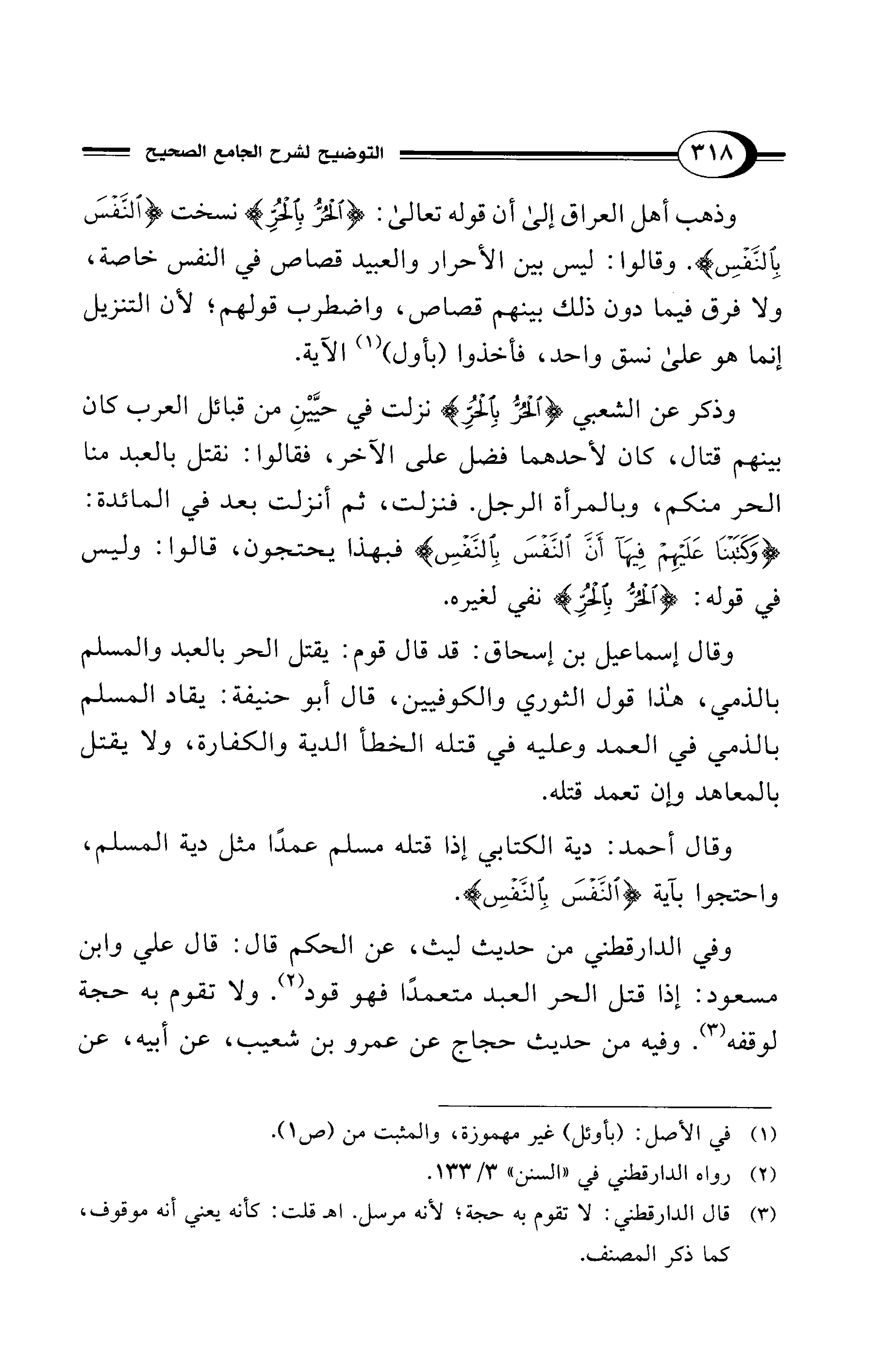 وذهب أهل العراق إلى أن قوله تعالى: {الْحُرُّ بِالْحُرِّ} نسخت {النَّفْسَ بِالنَّفْسِ} وقالوا: ليس بين الأحرار والعبيد قصاص في النفس خاصة، ولا فرق فيما دون ذلك بينهم قصاص، واضطرب قولهم؛ لأن التنزيل إنما هو على نسق واحد، فأخذوا (بأول) (¬1) الآية.