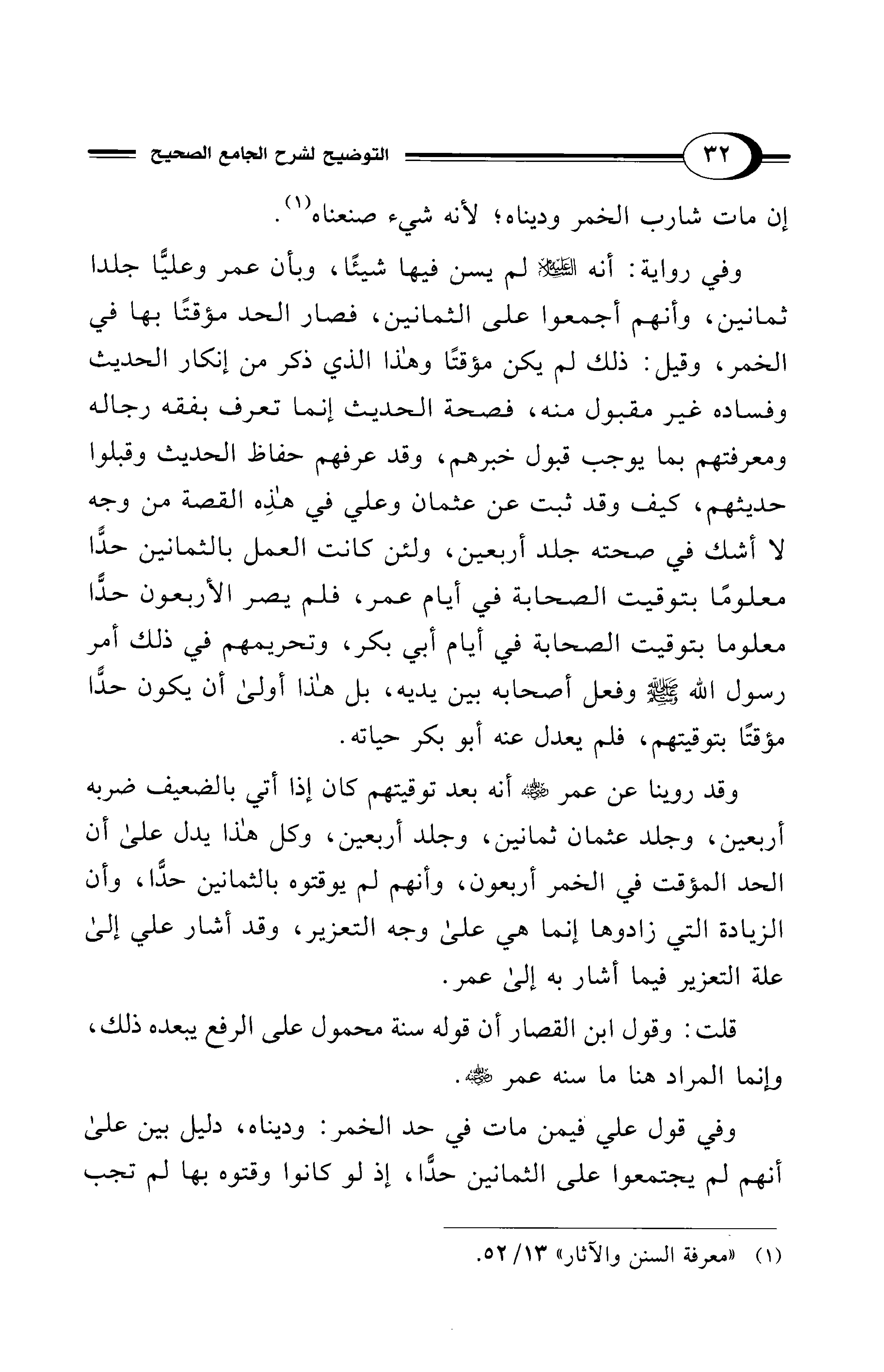وفي رواية: أنه - عليه السلام - لم يسن فيها شيئًا، وبأن عمر وعليًّا جلدا ثمانين، وأنهم أجمعوا على الثمانين، فصار الحد مؤقتًا بها في الخمر، وقيل: ذلك لم يكن مؤقتًا وهذا الذي ذكر من إنكار الحديث وفساده غير مقبول منه، فصحة الحديث إنما تعرف بفقه رجاله ومعرفتهم بما يوجب قبول خبرهم، وقد عرفهم حفاظ الحديث وقبلوا حديثهم، كيف وقد ثبت عن عثمان وعلي في هذِه القصة من وجه لا أشك في صحته جلد أربعين، ولئن كانت العمل بالثمانين حدًّا معلومًا بتوقيت الصحابة في أيام عمر، فلم يصر الأربعون حدًّا معلوما بتوقيت الصحابة في أيام أبي بكر، وتحريمهم في ذلك أمر رسول الله - صلى الله عليه وسلم - وفعل أصحابه بين يديه، بل هذا أولى أن يكون حدًّا مؤقتًا بتوقيتهم، فلم يعدل عنه أبو بكر حياته.