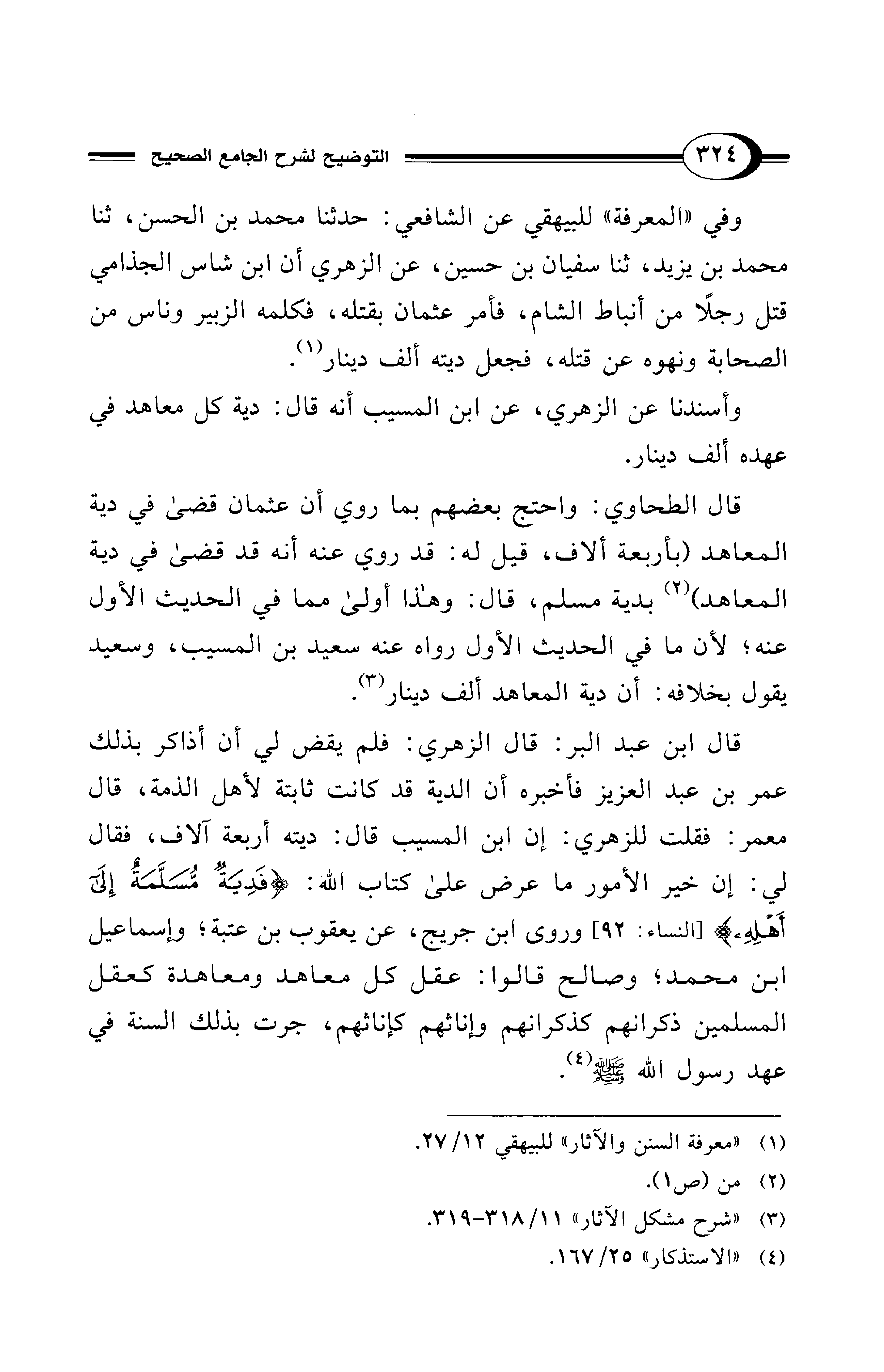 قال ابن عبد البر: قال الزهري: فلم يقض لي أن أذاكر بذلك عمر بن عبد العزيز فأخبره أن الدية قد كانت ثابتة لأهل الذمة، قال معمر: فقلت للزهري: إن ابن المسيب قال: ديته أربعة آلاف، فقال لي: إن خير الأمور ما عرض على كتاب الله: {فَدِيَةٌ مُسَلَّمَةٌ إِلَى أَهْلِهِ} [النساء: 92] وروى ابن جريج، عن يعقوب بن عتبة؛ وإسماعيل ابن محمد؛ وصالح قالوا: عقل كل معاهد ومعاهدة كعقل المسلمين ذكرانهم كذكرانهم وإناثهم كإناثهم، جرت بذلك السنة في عهد رسول الله - صلى الله عليه وسلم - (¬4).