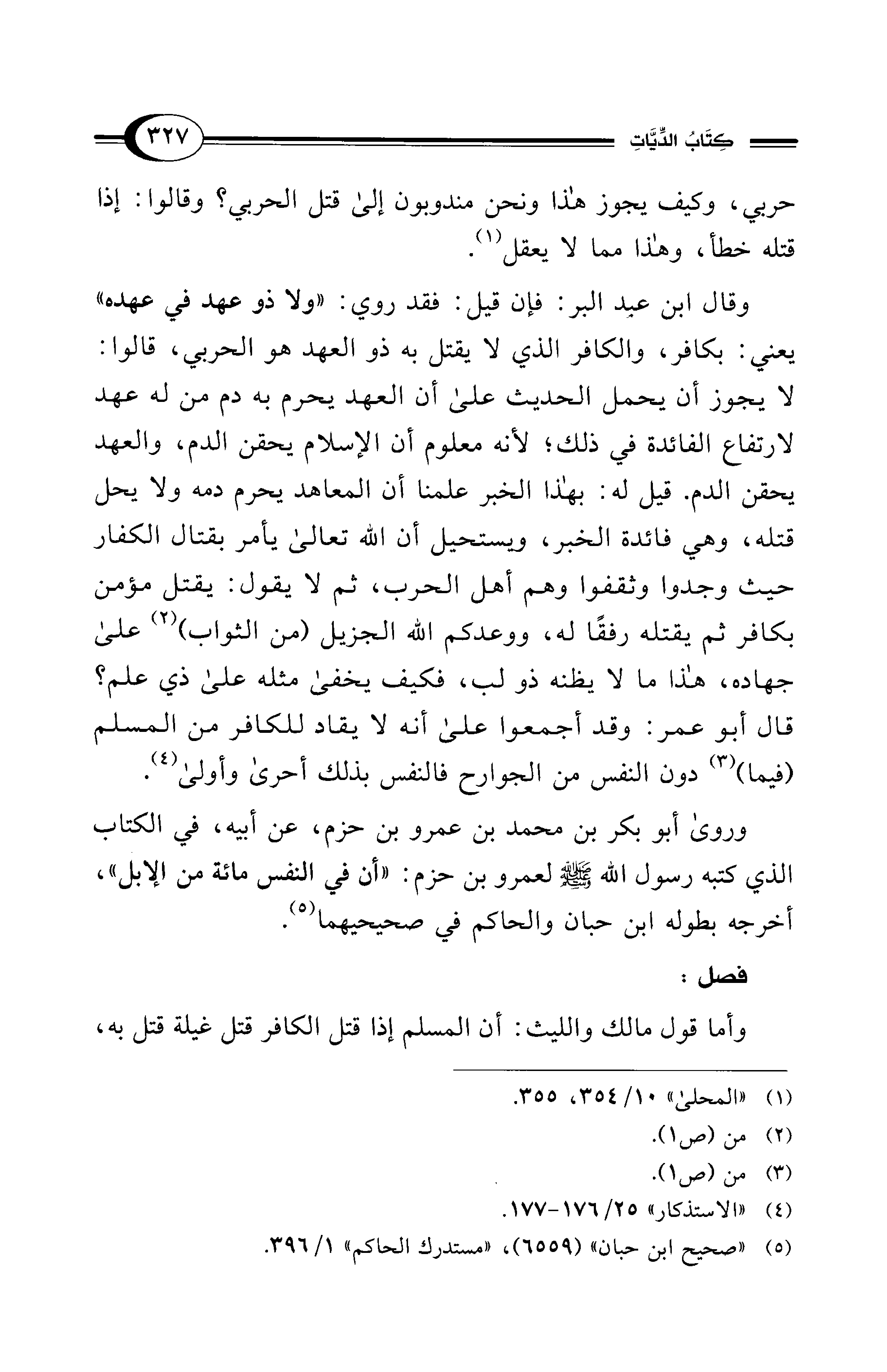 وروى أبو بكر بن محمد بن عمرو بن حزم، عن أبيه، في الكتاب الذي كتبه رسول الله - صلى الله عليه وسلم - لعمرو بن حزم: "أن في النفس مائة من الإبل"، أخرجه بطوله ابن حبان والحاكم في صحيحيهما (¬5).