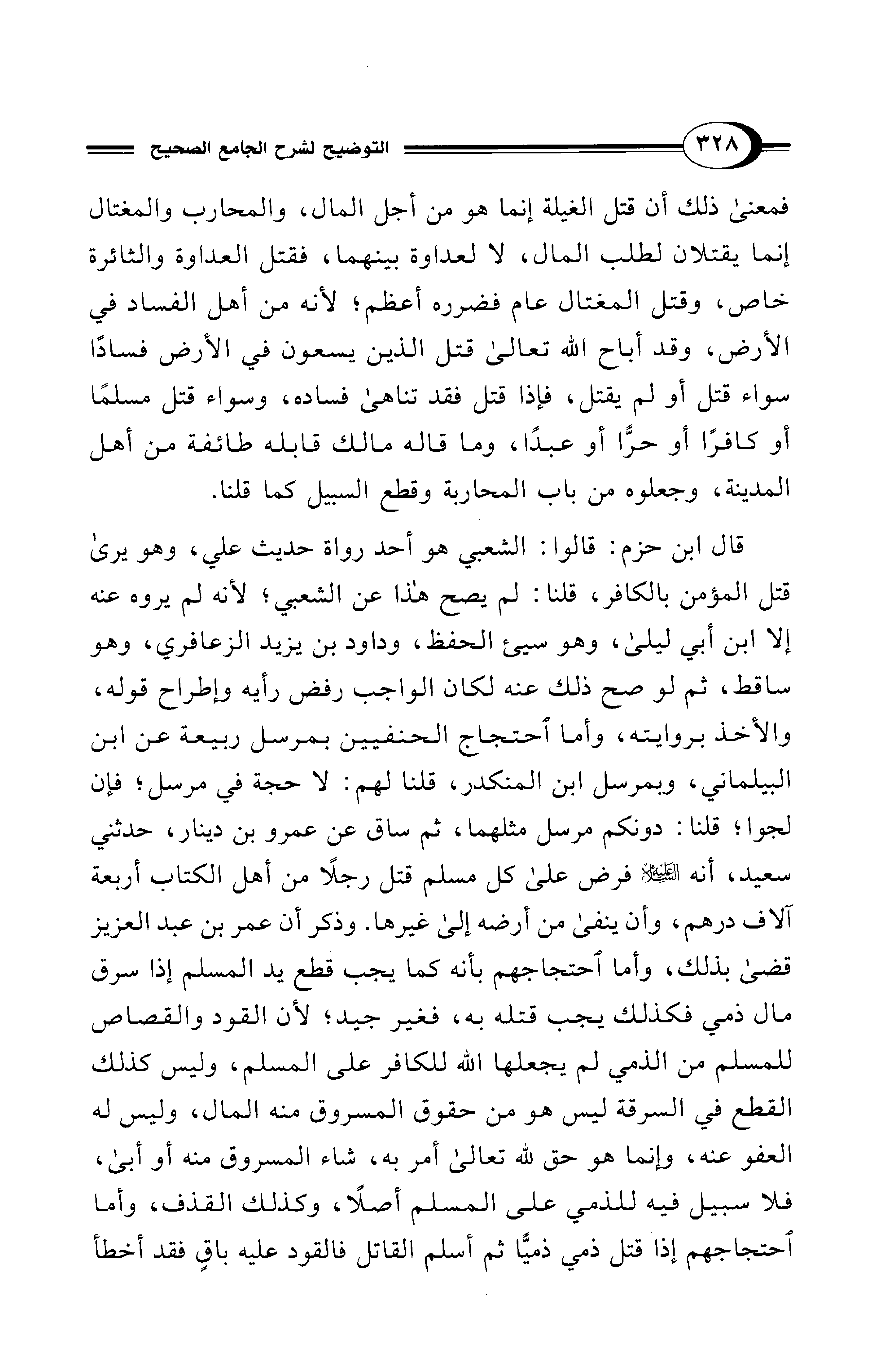 قال ابن حزم: قالوا: الشعبي هو أحد رواة حديث علي، وهو يرى قتل المؤمن بالكافر، قلنا: لم يصح هذا عن الشعبي؛ لأنه لم يروه عنه إلا ابن أبي ليلى، وهو سيئ الحفظ، وداود بن يزيد الزعافري، وهو ساقط، ثم لو صح ذلك عنه لكان الواجب رفض رأيه وإطراح قوله، والأخذ بروايته، وأما احتجاج الحنفيين بمرسل ربيعة عن ابن البيلماني، وبمرسل ابن المنكدر، قلنا لهم: لا حجة في مرسل؛ فإن لجوا؛ قلنا: دونكم مرسل مثلهما، ثم ساق عن عمرو بن دينار، حدثني سعيد، أنه - عليه السلام - فرض على كل مسلم قتل رجلاً من أهل الكتاب أربعة آلاف درهم، وأن ينفى من أرضه إلى غيرها. وذكر أن عمر بن عبد العزيز قضى بذلك، وأما احتجاجهم بأنه كما يجب قطع يد المسلم إذا سرق مال ذمي فكذلك يجب قتله به، فغير جيد؛ لأن القود والقصاص للمسلم من الذمي لم يجعلها الله للكافر على المسلم، وليس كذلك القطع في السرقة ليس هو من حقوق المسروق منه المال، وليس له العفو عنه، وإنما هو حق لله تعالى أمر به، شاء المسروق منه أو أبى، فلا سبيل فيه للذمي على المسلم أصلاً، وكذلك القذف، وأما احتجاجهم إذا قتل ذمي ذميًّا ثم أسلم القاتل فالقود عليه باقٍ فقد أخطأ