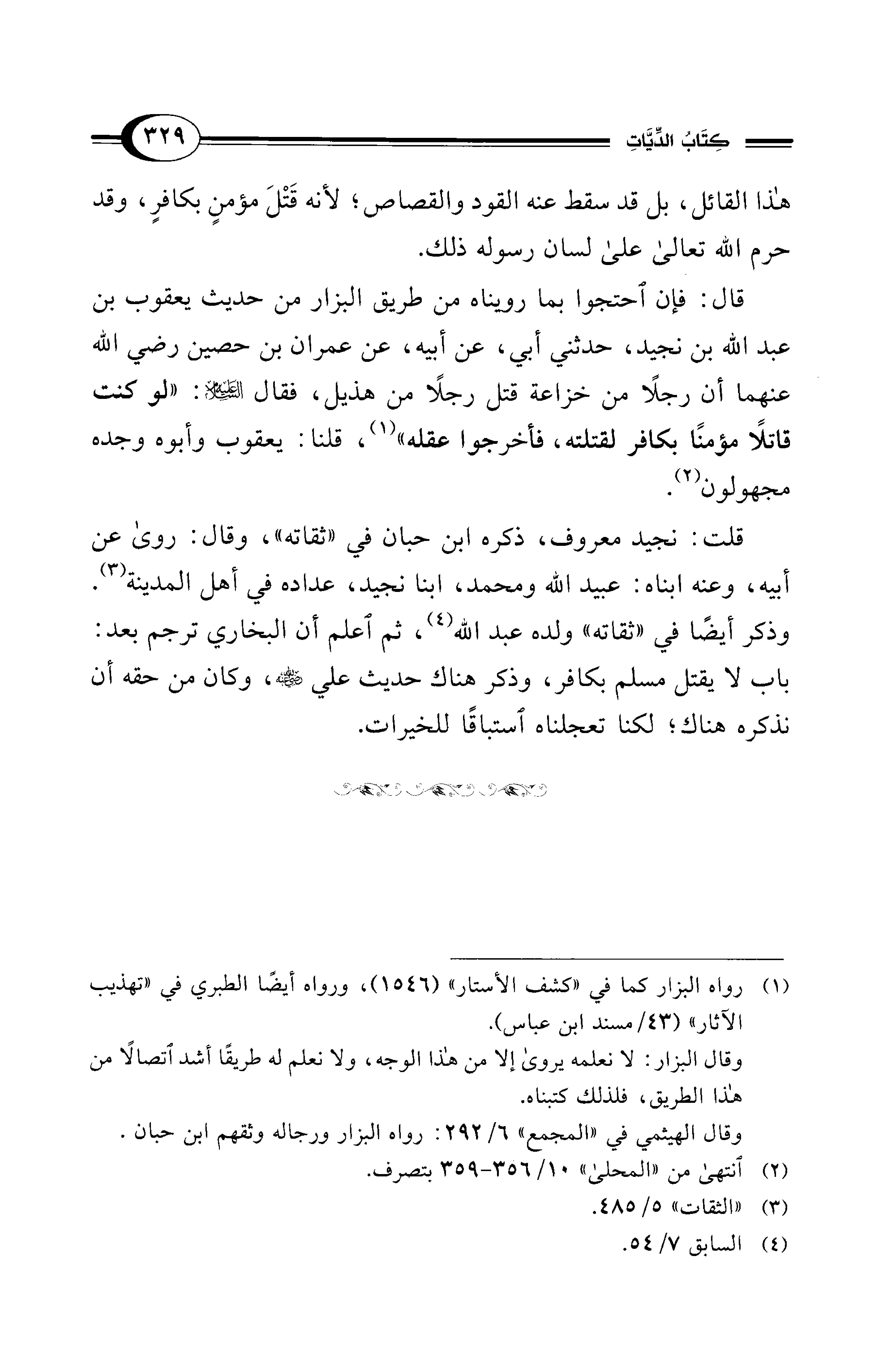 قال: فإن احتجوا بما رويناه من طريق البزار من حديث يعقوب بن عبد الله بن نجيد، حدثني أبي، عن أبيه، عن عمران بن حصين - رضي الله عنهما - أن رجلاً من خزاعة قتل رجلاً من هذيل، فقال - عليه السلام -: "لو كنت قاتلًا مؤمنًا بكافر لقتلته، فأخرجوا عقله" (¬1)، قلنا: يعقوب وأبوه وجده مجهولون (¬2).