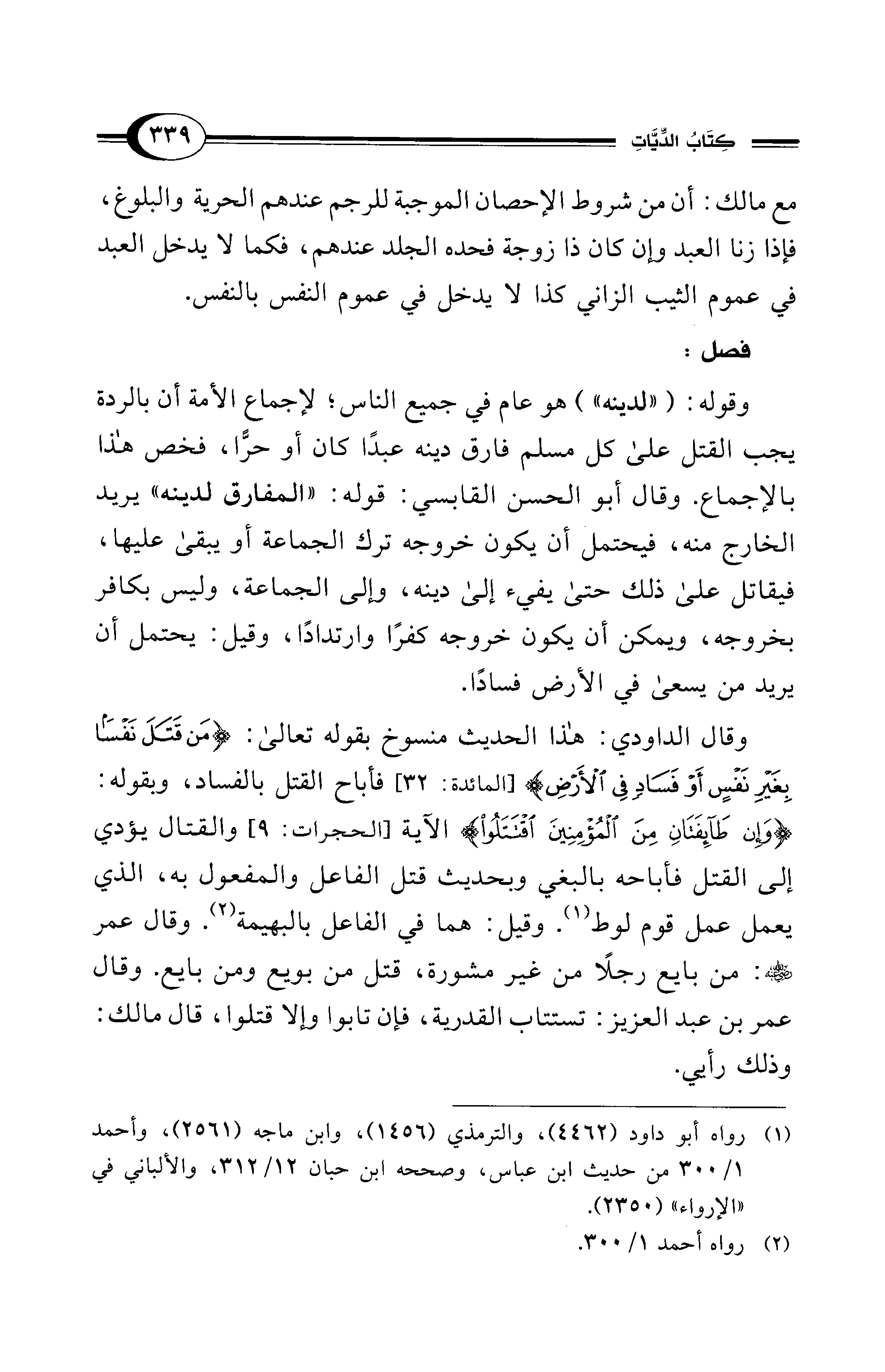 وقال الداودي: هذا الحديث منسوخ بقوله تعالى: {مَنْ قَتَلَ نَفْسًا بِغَيْرِ نَفْسٍ أَوْ فَسَادٍ فِي الْأَرْضِ} [المائدة: 32] فأباح القتل بالفساد، وبقوله: {وَإِنْ طَائِفَتَانِ مِنَ الْمُؤْمِنِينَ اقْتَتَلُوا} الآية [الحجرات: 9] والقتال يؤدي إلى القتل فأباحه بالبغي وبحديث قتل الفاعل والمفعول به، الذي يعمل عمل قوم لوط (¬1). وقيل: هما في الفاعل بالبهيمة (¬2). وقال عمر - رضي الله عنه -: من بايع رجلاً من غير مشورة، قتل من بويع ومن بايع. وقال عمر بن عبد العزيز: تستتاب القدرية، فإن تابوا وإلا قتلوا، قال مالك: وذلك رأيي.