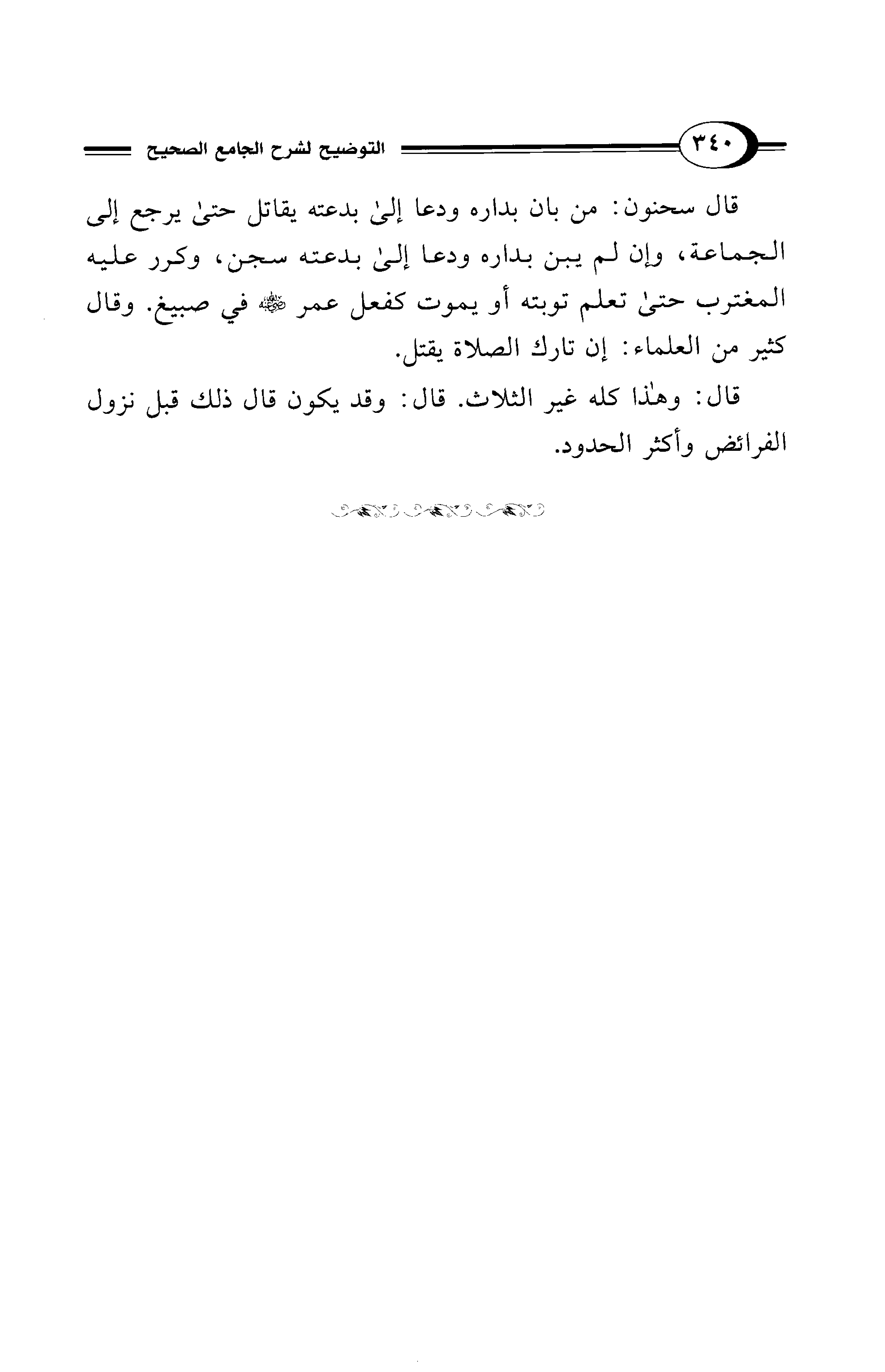 قال سحنون: من بأن بداره ودعا إلى بدعته يقاتل حتى يرجع إلى الجماعة، وإن لم يبن بداره ودعا إلى بدعته سجن، وكرر عليه المغترب حتى تعلم توبته أو يموت كفعل عمر - رضي الله عنه - في صبيع. وقال كثير من العلماء: إن تارك الصلاة يقتل.
