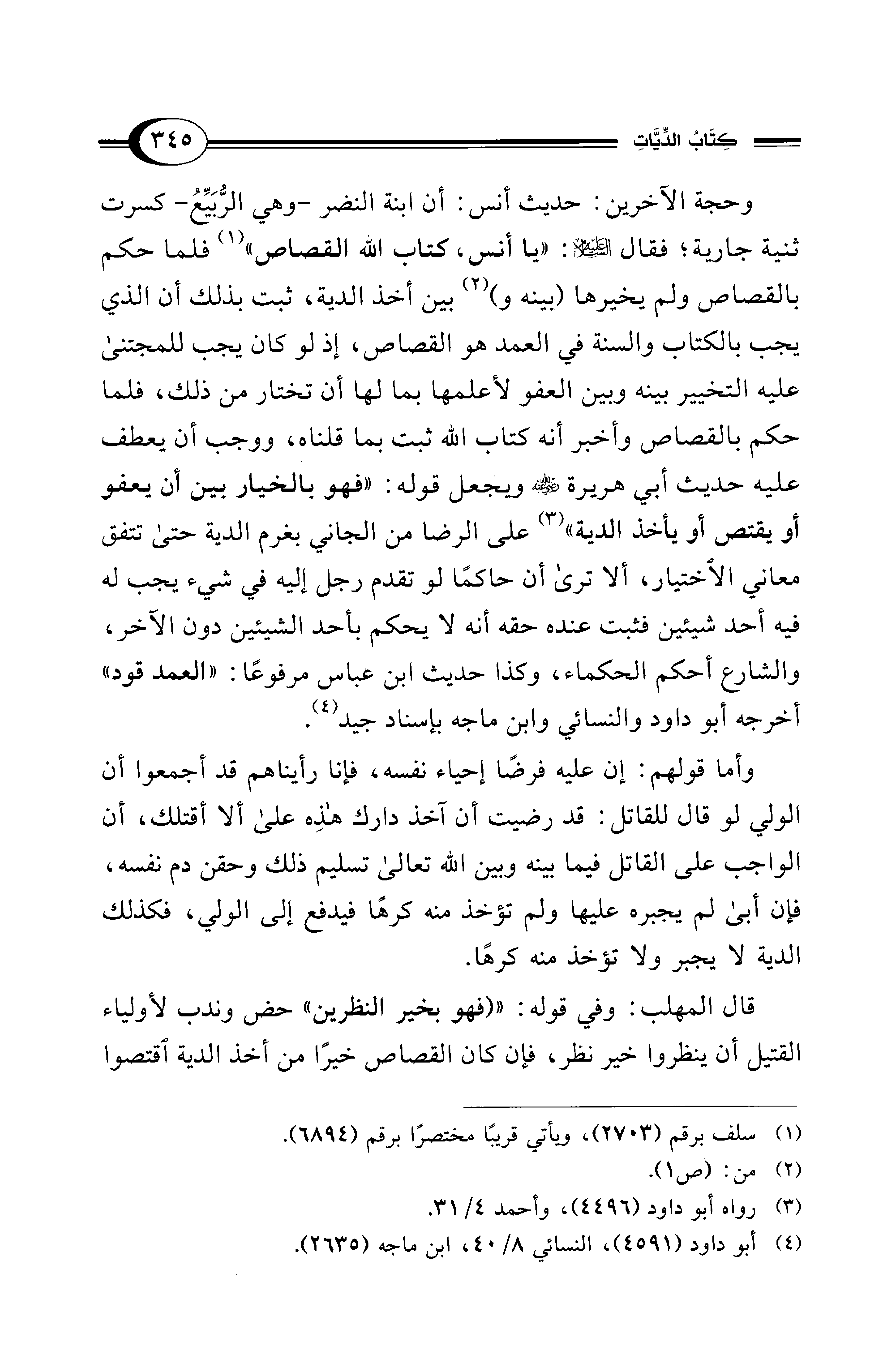 وحجة الآخرين: حديث أنس: أن ابنة النضر -وهي الرُّبَيِّعُ- كسرت ثنية جارية؛ فقال - عليه السلام -: "يا أنس، كتاب الله القصاص" (¬1) فلما حكم بالقصاص ولم يخيرها (يينه و) (¬2) بين أخذ الدية، ثبت بذلك أن الذي يجب بالكتاب والسنة في العمد هو القصاص، إذ لو كان يجب للمجتنى عليه التخيير بينه وبين العفو لأعلمها بما لها أن تختار من ذلك، فلما حكم بالقصاص وأخبر أنه كتاب الله ثبت بما قلناه، ووجب أن يعطف عليه حديث أبي هريرة - رضي الله عنه - ويجعل قوله: "فهو يالخيار بين أن يعفو أو يقتص أو يأخذ الدية" (¬3) على الرضا من الجاني بغرم الدية حتى تتفق معاني الاختيار، ألا ترى أن حاكمًا لو تقدم رجل إليه في شيء يجب له فيه أحد شيئين فثبت عنده حقه أنه لا يحكم بأحد الشيئين دون الآخر، والشارع أحكم الحكماء، وكذا حديث ابن عباس مرفوعًا: "العمد قود" أخرجه أبو داود والنسائي وابن ماجه بإسناد جيد (¬4).