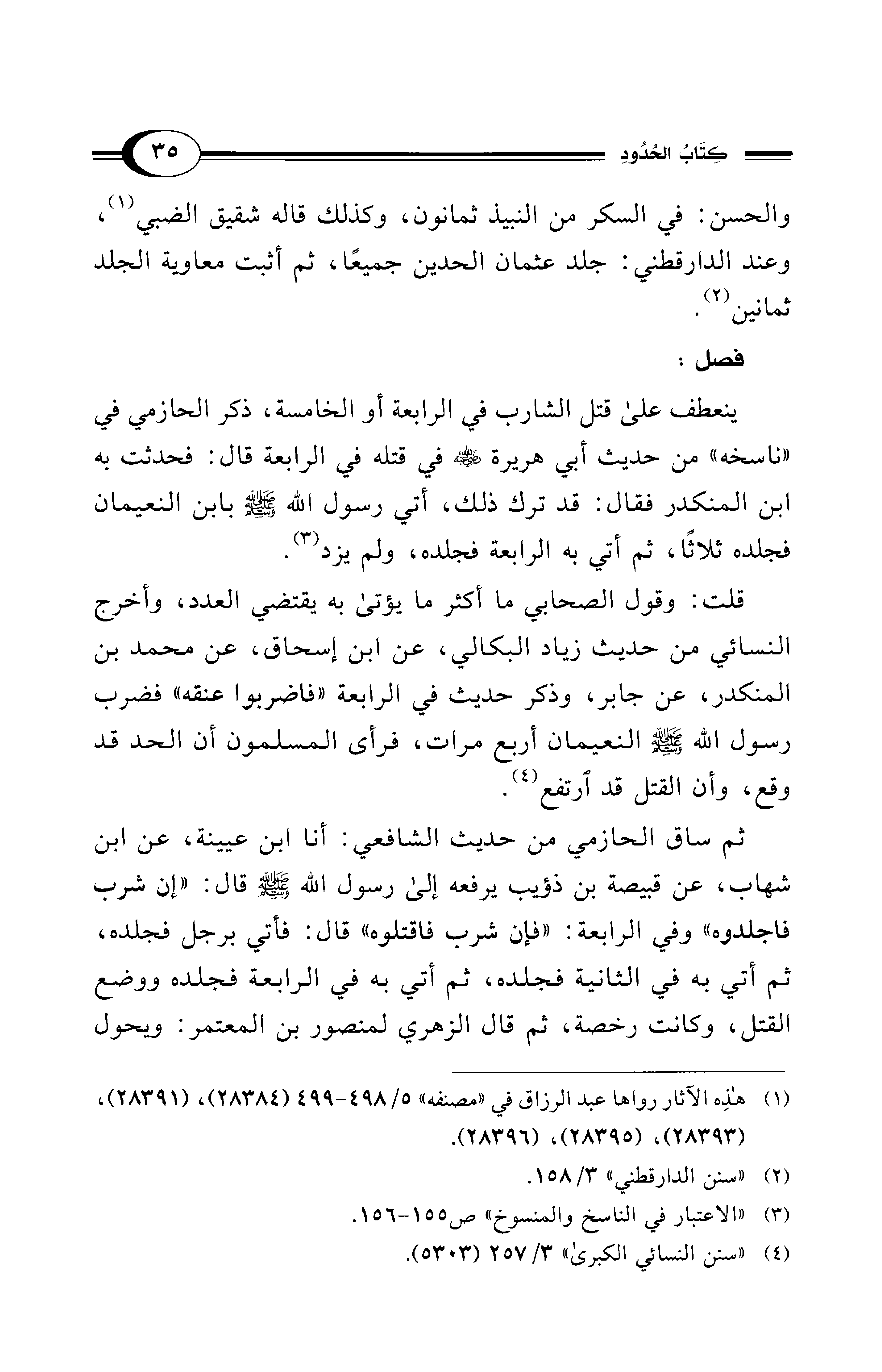 ينعطف على قتل الشارب في الرابعة أو الخامسة، ذكر الحازمي في "ناسخه" من حديث أبي هريرة - رضي الله عنه - في قتله في الرابعة قال: فحدثت به ابن المنكدر فقال: قد ترك ذلك، أتي رسول الله - صلى الله عليه وسلم - بابن النعيمان فجلده ثلاثًا، ثم أتي به الرابعة فجلده، ولم يزد (¬3).