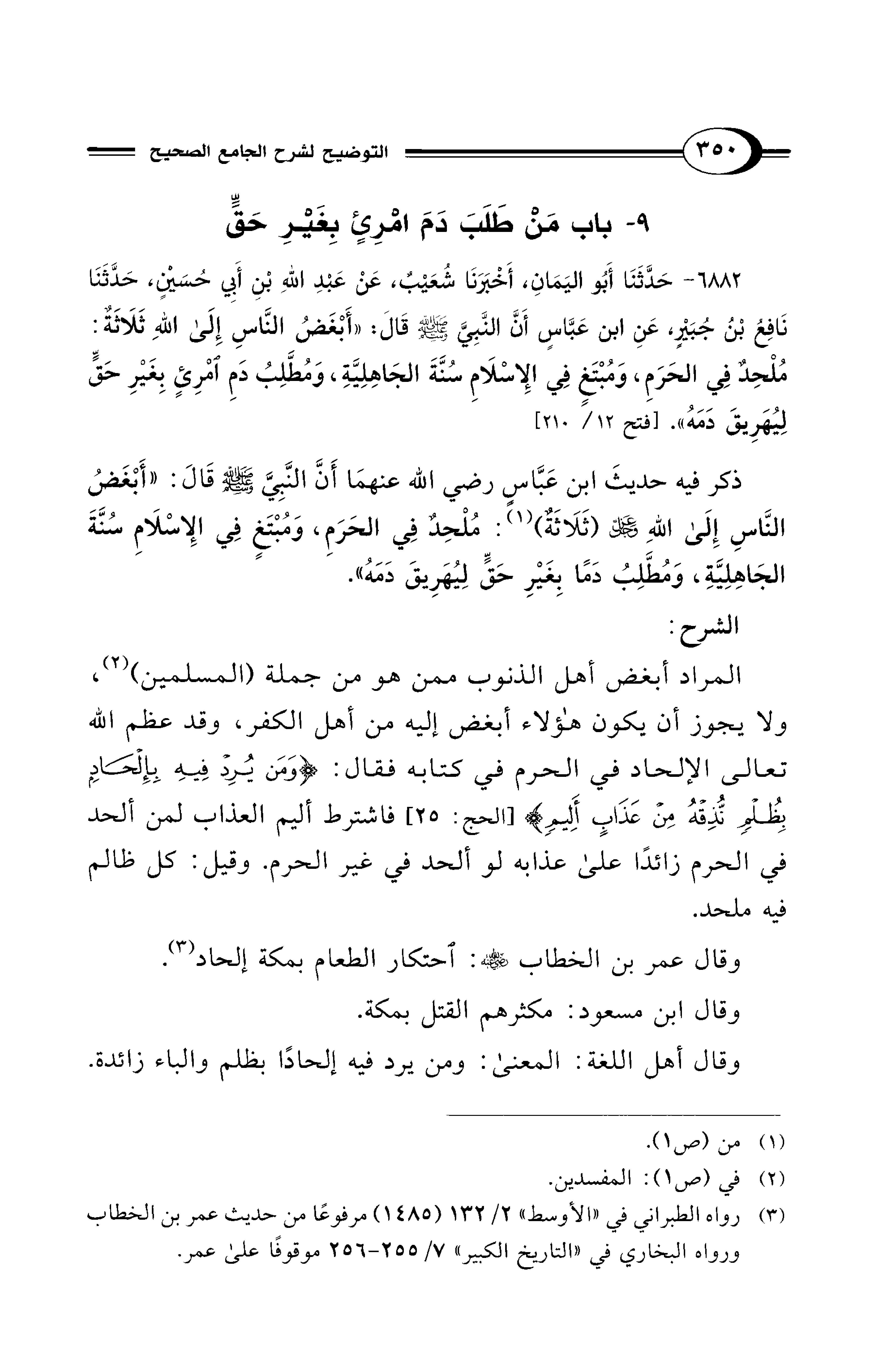 ذكر فيه حديثَ ابن عَبَّاسٍ - رضي الله عنهمَا - أَنَّ النَّبِي - صلى الله عليه وسلم - قَالَ: "أَبْغَضُ النَّاسِ إِلَى اللهِ -عَزَّ وَجَلَّ- (ثَلَاثَةٌ) (¬1): مُلْحِدٌ فِي الحَرَمِ، وَمُبْتَغٍ فِي الاسْلَامِ سُنَّةَ الجَاهِلِيَّةِ، وَمُطَّلِبُ دَمًا بِغَيْرِ حَقٍّ لِيُهَرِيقَ دَمَهُ".