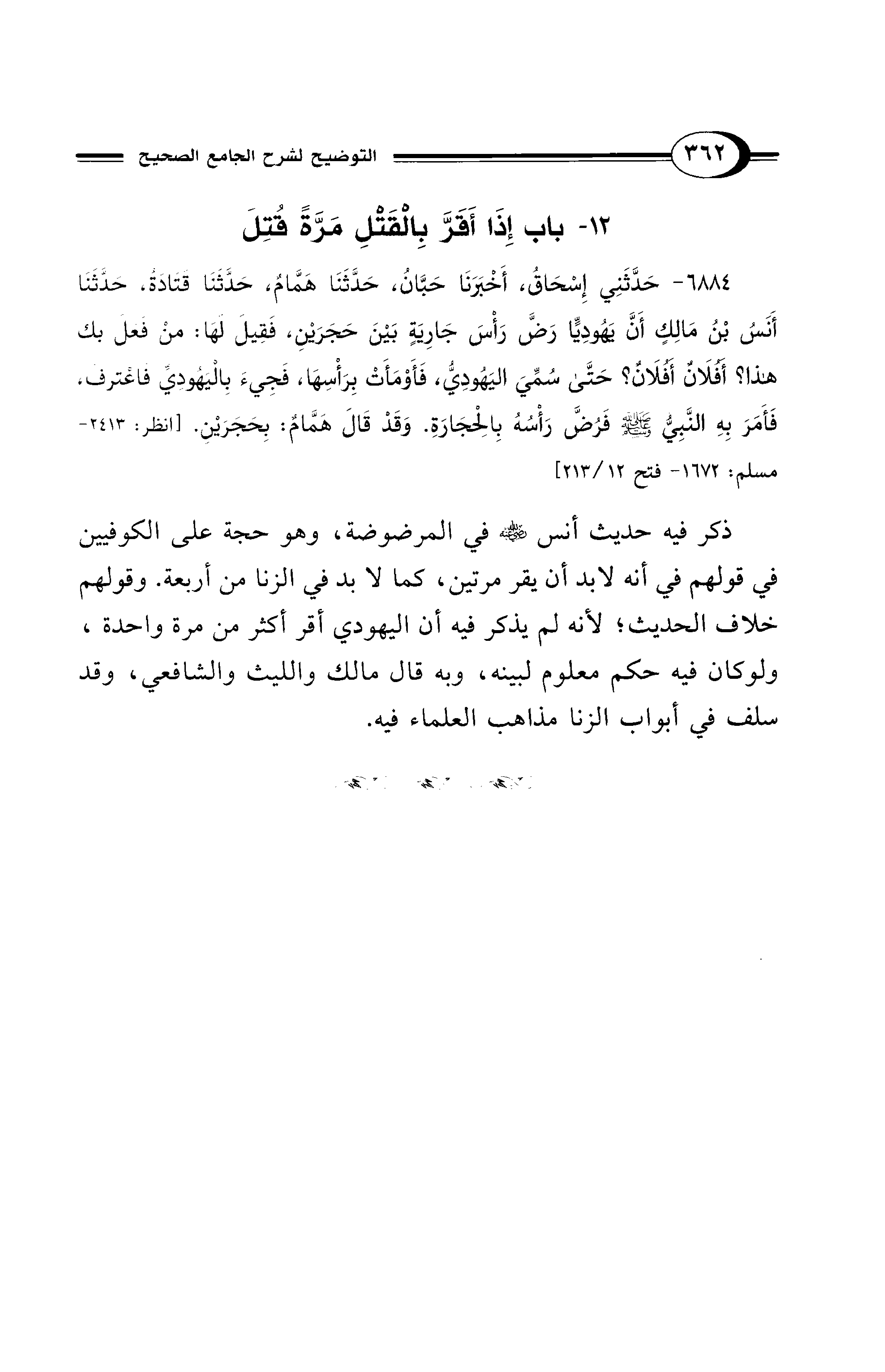 ذكر فيه حديث أنس - رضي الله عنه - في المرضوضة، وهو حجة على الكوفيين في قولهم في أنه لا بد أن يقر مرتين، كما لا بد في الزنا من أربعة. وقولهم خلاف الحديث؛ لأنه لم يذكر فيه أن اليهودي أقر أكثر من مرة واحدة، ولو كان فيه حكم معلوم لبينه، وبه قال مالك والليث والشافعي، وقد سلف في أبواب الزنا مذاهب العلماء فيه.