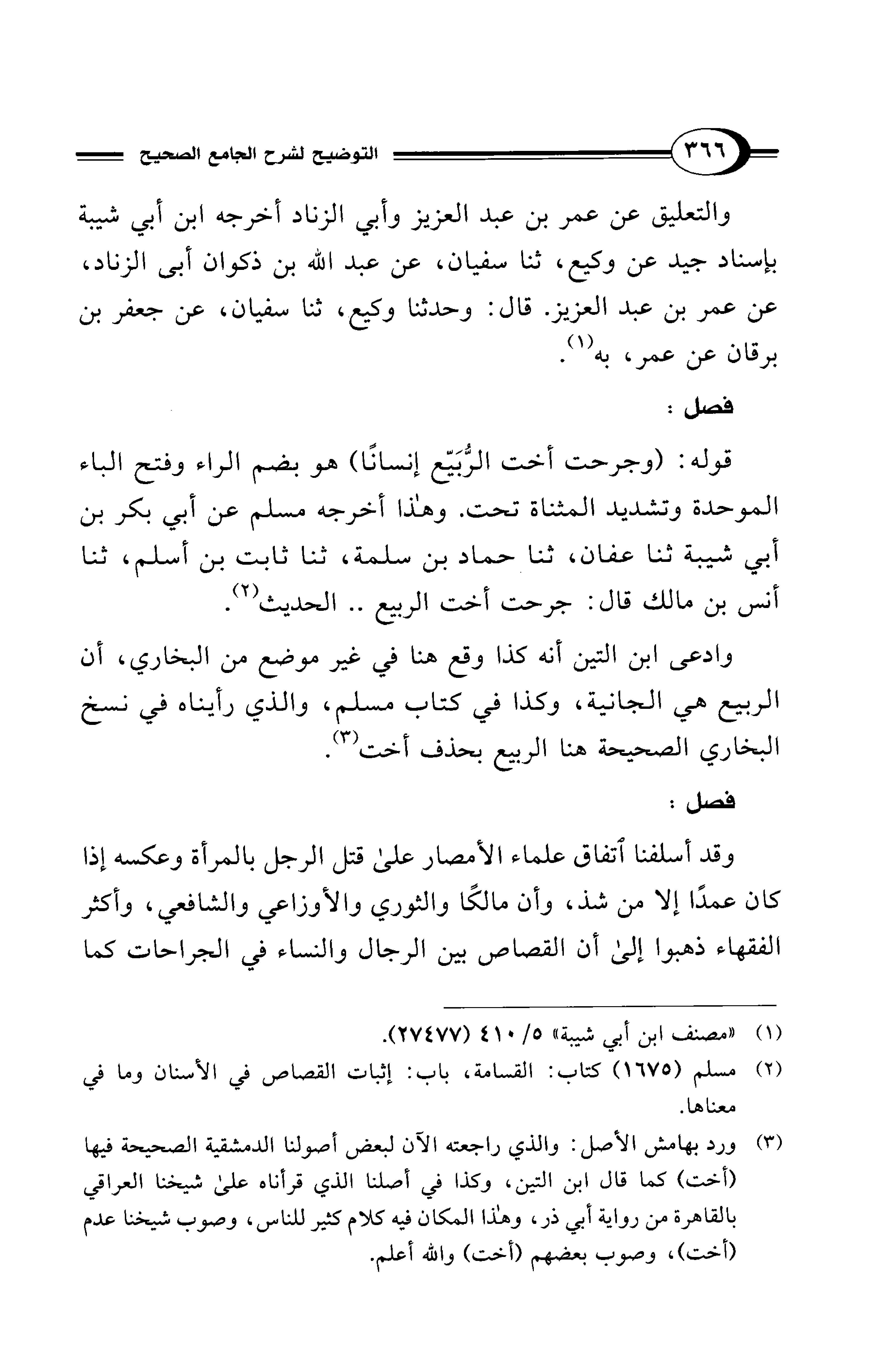 وادعى ابن التين أنه كذا وقع هنا في غير موضع من البخاري، أن الربيع هي الجانية، وكذا في كتاب مسلم، والذي رأيناه في نسخ البخاري الصحيحة هنا الربيع بحذف أخت (¬3).