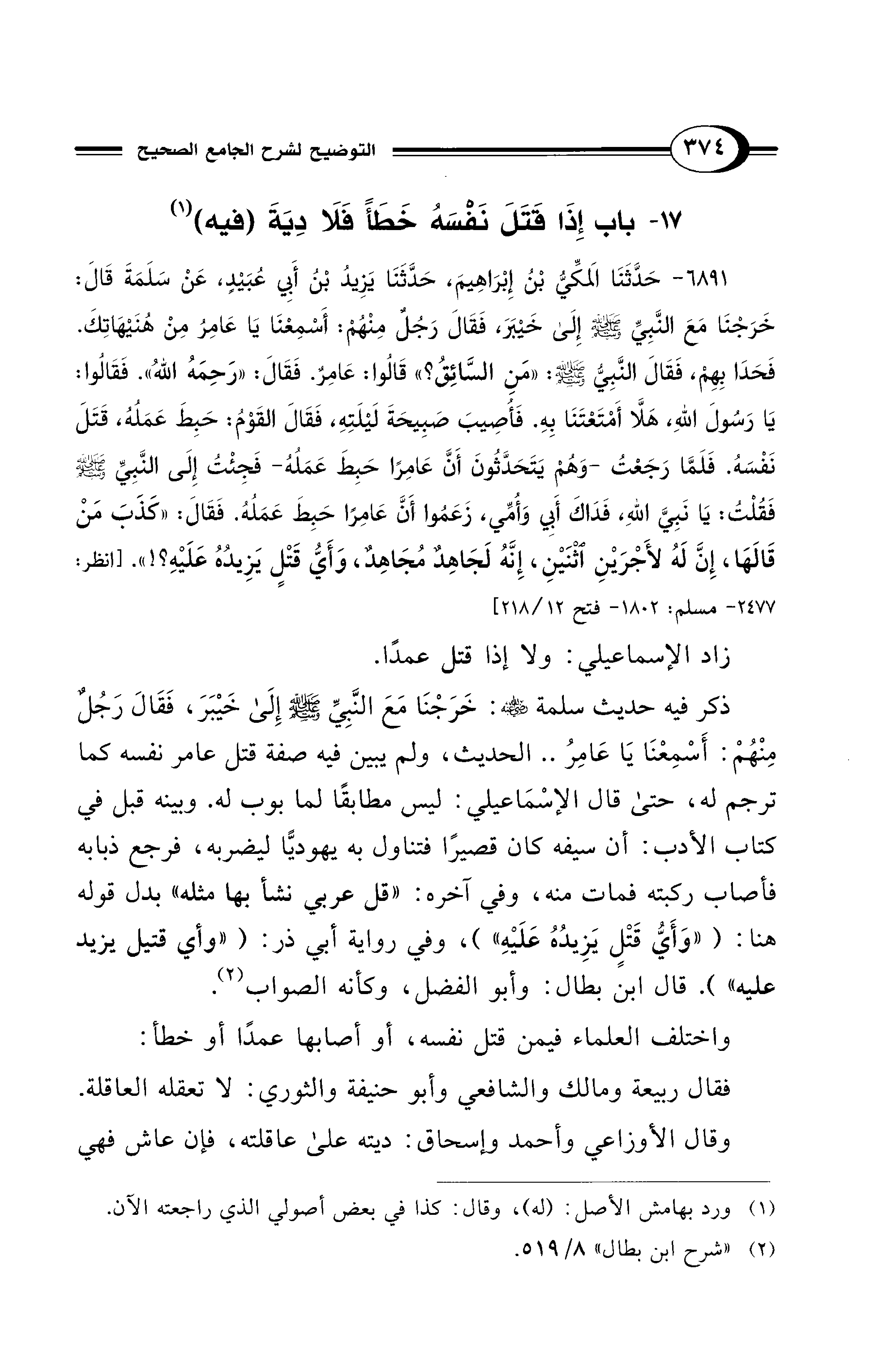 ذكر فيه حديث سلمة - رضي الله عنه -: خَرَجْنَا مَعَ النَّبِيِّ - صلى الله عليه وسلم - إلَي خَيْبَرَ، فَقَالَ رَجُلٌ مِنْهُمْ: أَسْمِعْنَا يَا عَامِرُ .. الحديث، ولم يبين فيه صفة قتل عامر نفسه كما ترجم له، حتى قال الإسْمَاعيلي: ليس مطابقًا لما بوب له. وبينه قبل في كتاب الأدب: أن سيفه كان قصيرًا فتناول به يهوديًّا ليضربه، فرجع ذبابه فأصاب ركبته فمات منه، وفي آخره: "قل عربي نشأ بها مثله" بدل قوله هنا: ("وَأَيُّ قَتْلٍ يَزِيدُهُ عَلَيْهِ")، وفي رواية أبي ذر: ("وأي قتيل يزيد عليه"). قال ابن بطال: وأبو الفضل، وكأنه الصواب (¬2).