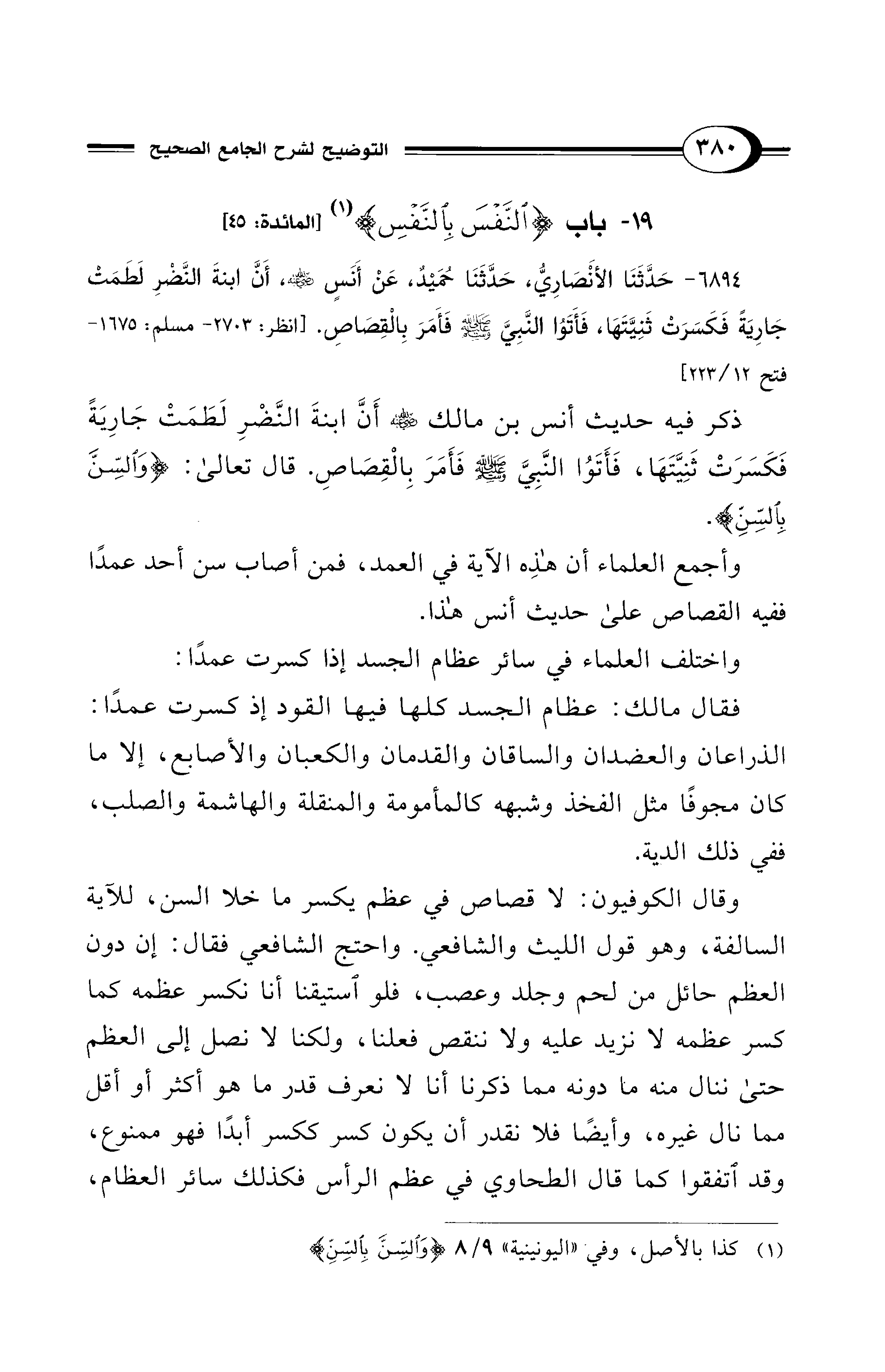 ذكر فيه حديث أنس بن مالك - رضي الله عنه - أَنَّ ابنةَ النَّضرِ لَطَمَتْ جَارِيَةً فَكَسَرَتْ ثَنِيَّتَهَا، فَأَتَوُا النَّبِيَّ - صلى الله عليه وسلم - فَأَمَرَ بِالْقِصَاصِ. قال تعالى: {وَالسِّنَّ بِالسِّنِّ}.