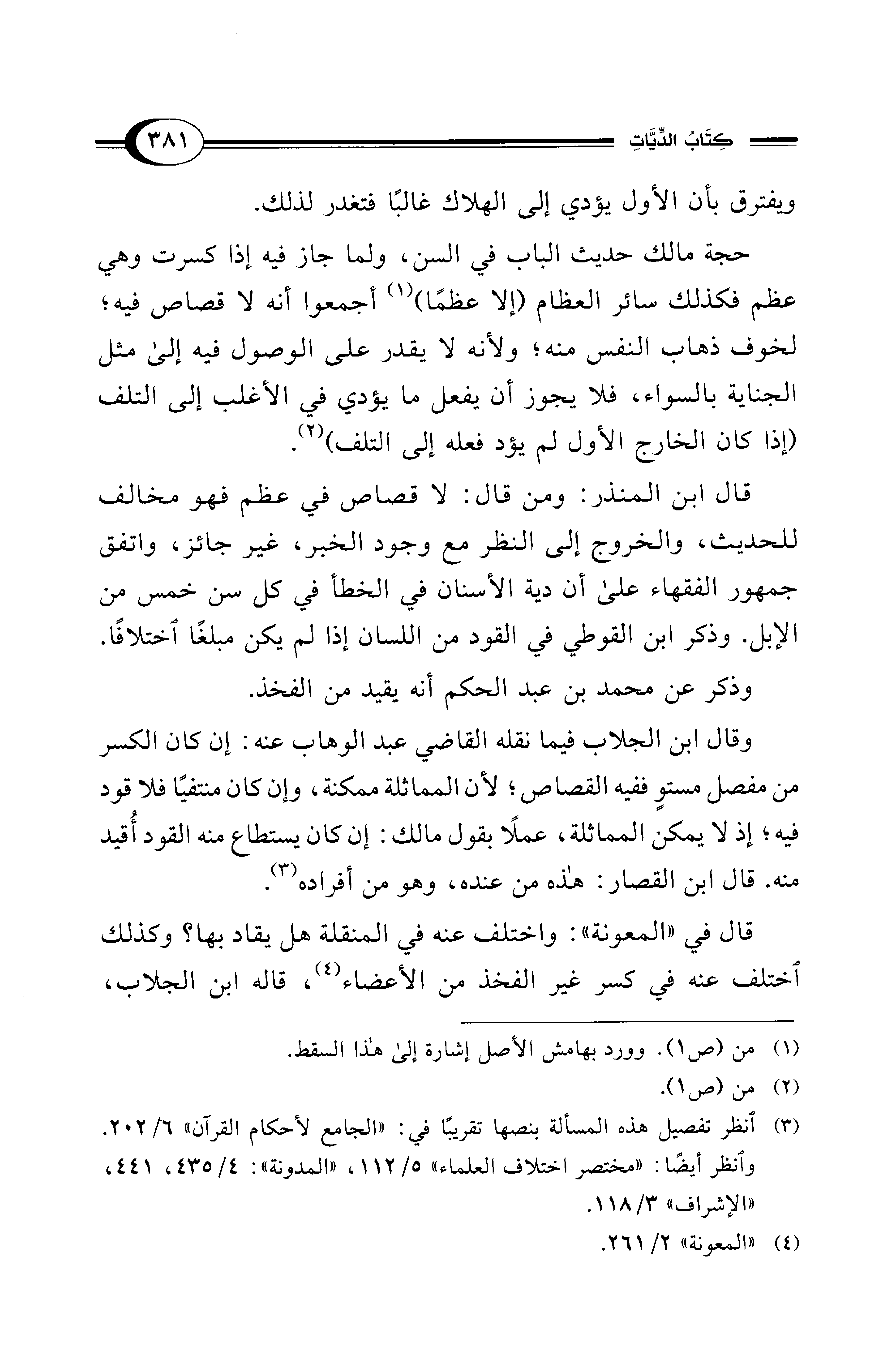 وقال ابن الجلاب فيما نقله القاضي عبد الوهاب عنه: إن كان الكسر من مفصل مستوٍ ففيه القصاص؛ لأن المماثلة ممكنة، وإن كان منتفيًا فلا قود فيه؛ إذ لا يمكن المماثلة، عملًا بقول مالك: إن كان يستطاع منه القود أُقيد منه. قال ابن القصار: هذه من عنده، وهو من أفراده (¬3).