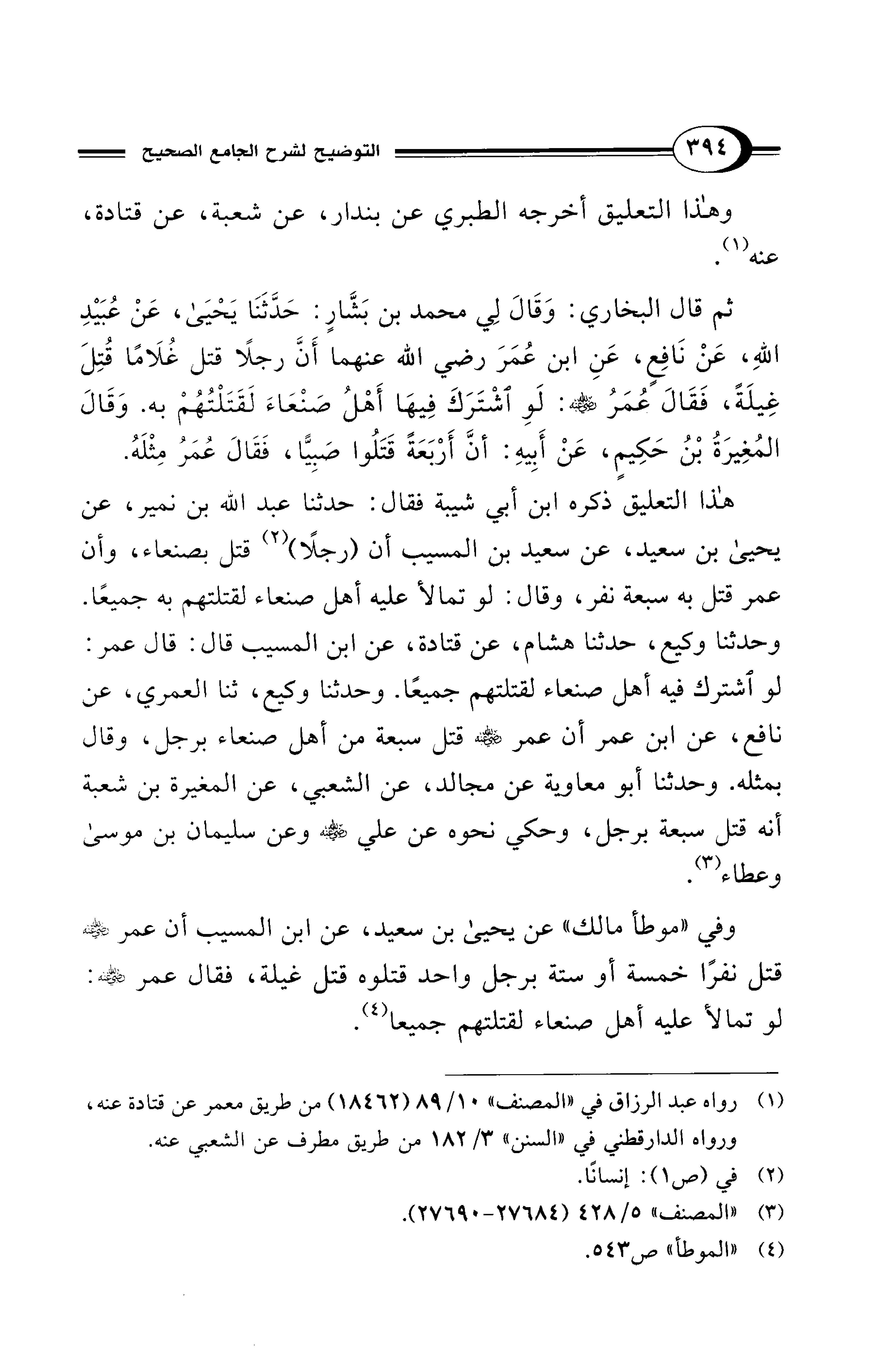ثم قال البخاري: وَقَالَ لِي محمد بن بَشَّارٍ: حَدّثَنَا يَحْيَى، عَنْ عُبَيْدِ اللهِ، عَنْ نَافِعٍ، عَنِ ابن عُمَرَ - رضي الله عنهما - أَنَّ رجلاً قتل غُلَامًا قُتِلَ غِيلَةً، فَقَالَ عُمَرُ - رضي الله عنه -: لَوِ اشْتَرَكَ فِيهَا أَهْلُ صَنْعَاءَ لَقَتَلْتُهُمْ به. وَقَالَ المُغِيرَةُ بْنُ حَكِيمٍ، عَنْ أَبِيهِ: أنَّ أَرْبَعَةً قَتَلُوا صَبِيًّا، فَقَالَ عُمَرُ مِثْلَهُ.