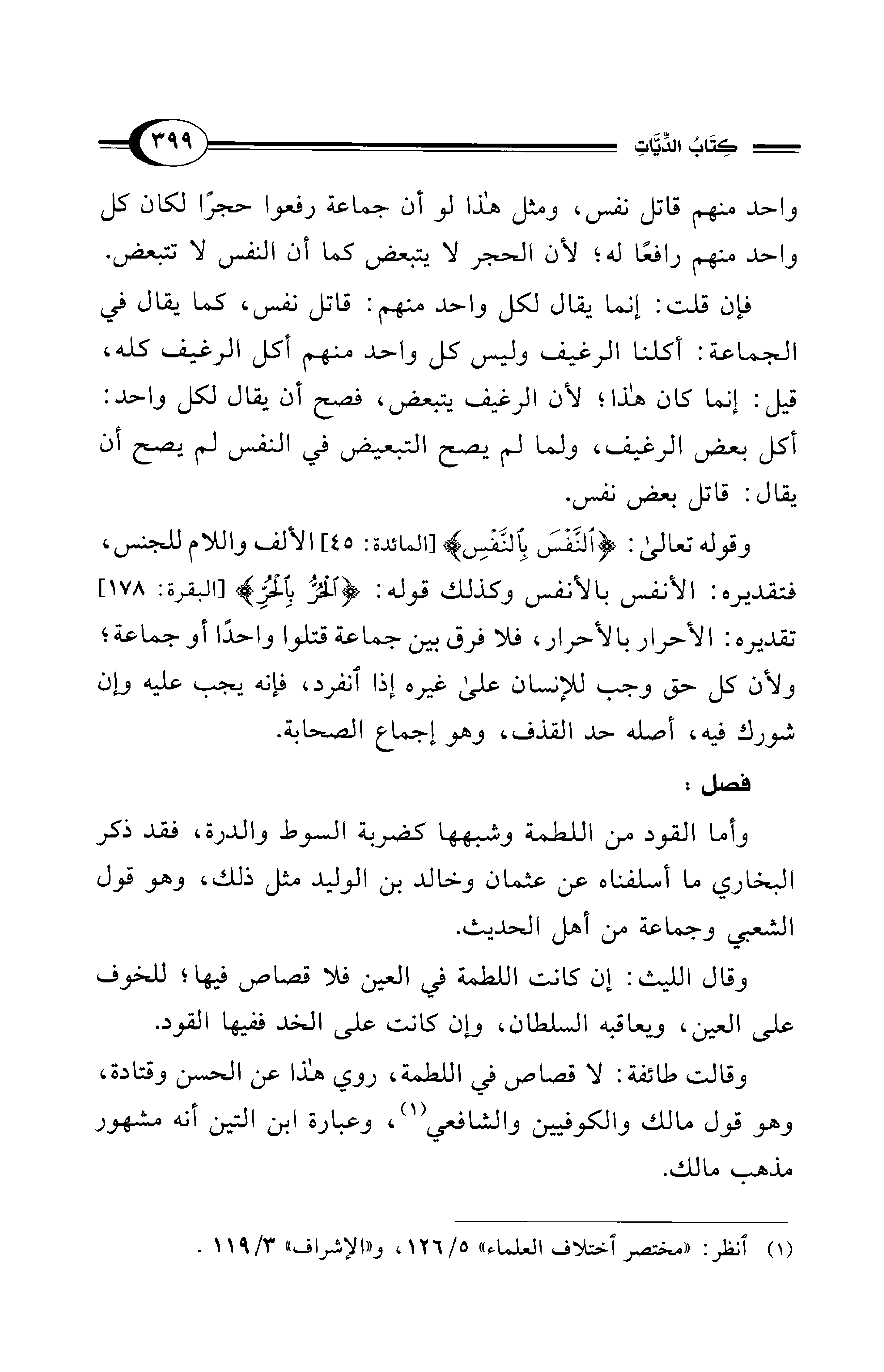 وقوله تعالى: {النَّفْسَ بِالنَّفْسِ} [المائدة: 45] الألف واللام للجنس، فتقديره: الأنفس بالأنفس وكذلك قوله: {الْحُرُّ بِالْحُرِّ} [البقرة: 178] تقديره: الأحرار بالأحرار، فلا فرق بين جماعة قتلوا واحدًا أو جماعة؛ ولأن كل حق وجب للإنسان على غيره إذا انفرد، فإنه يجب عليه وإن شورك فيه، أصله حد القذف، وهو إجماع الصحابة.