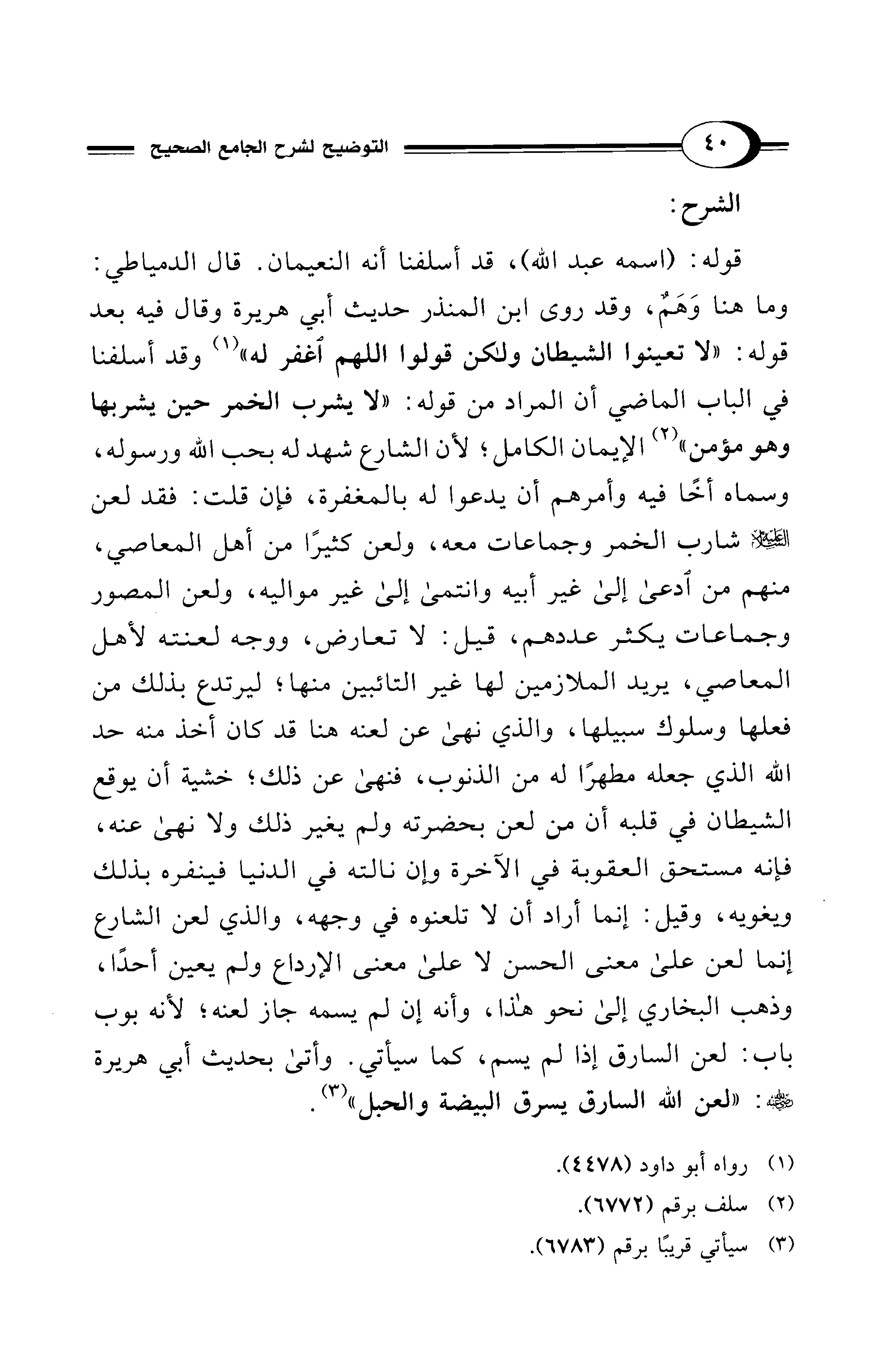 قوله: (اسمه عبد الله)، قد أسلفنا أنه النعيمان. قال الدمياطي: وما هنا وَهَمٌ، وقد روى ابن المنذر حديث أبي هريرة وقال فيه بعد قوله: "لا تعينوا الشيطان ولكن قولوا اللهم اغفر له" (¬1) وقد أسلفنا في الباب الماضي أن المراد من قوله: "لا يشرب الخمر حين يشربها وهو مؤمن" (¬2) الإيمان الكامل؛ لأن الشارع شهد له بحب الله ورسوله، وسماه أخًا فيه وأمرهم أن يدعوا له بالمغفرة، فإن قلت: فقد لعن - عليه السلام - شارب الخمر وجماعات معه، ولعن كثيرًا من أهل المعاصي، منهم من ادعى إلى غير أبيه وانتمى إلى غير مواليه، ولعن المصور وجماعات يكثر عددهم، قيل: لا تعارض، ووجه لعنته لأهل المعاصي، يريد الملازمين لها غير التائبين منها؛ ليرتدع بذلك من فعلها وسلوك سبيلها، والذي نهى عن لعنه هنا قد كان أخذ منه حد الله الذي جعله مطهرًا له من الذنوب، فنهى عن ذلك؛ خشية أن يوقع الشيطان في قلبه أن من لعن بحضرته ولم يغير ذلك ولا نهى عنه، فإنه مستحق العقوبة في الآخرة وإن نالته في الدنيا فينفره بذلك ويغويه، وقيل: إنما أراد أن لا تلعنوه في وجهه، والذي لعن الشارع إنما لعن على معنى الحسن لا على معنى الإرداع ولم يعين أحدًا، وذهب البخاري إلى نحو هذا، وأنه إن لم يسمه جاز لعنه؛ لأنه بوب باب: لعن السارق إذا لم يسم، كما سيأتي. وأتى بحديث أبي هريرة - رضي الله عنه -: "لعن الله السارق يسرق البيضة والحبل" (¬3).
