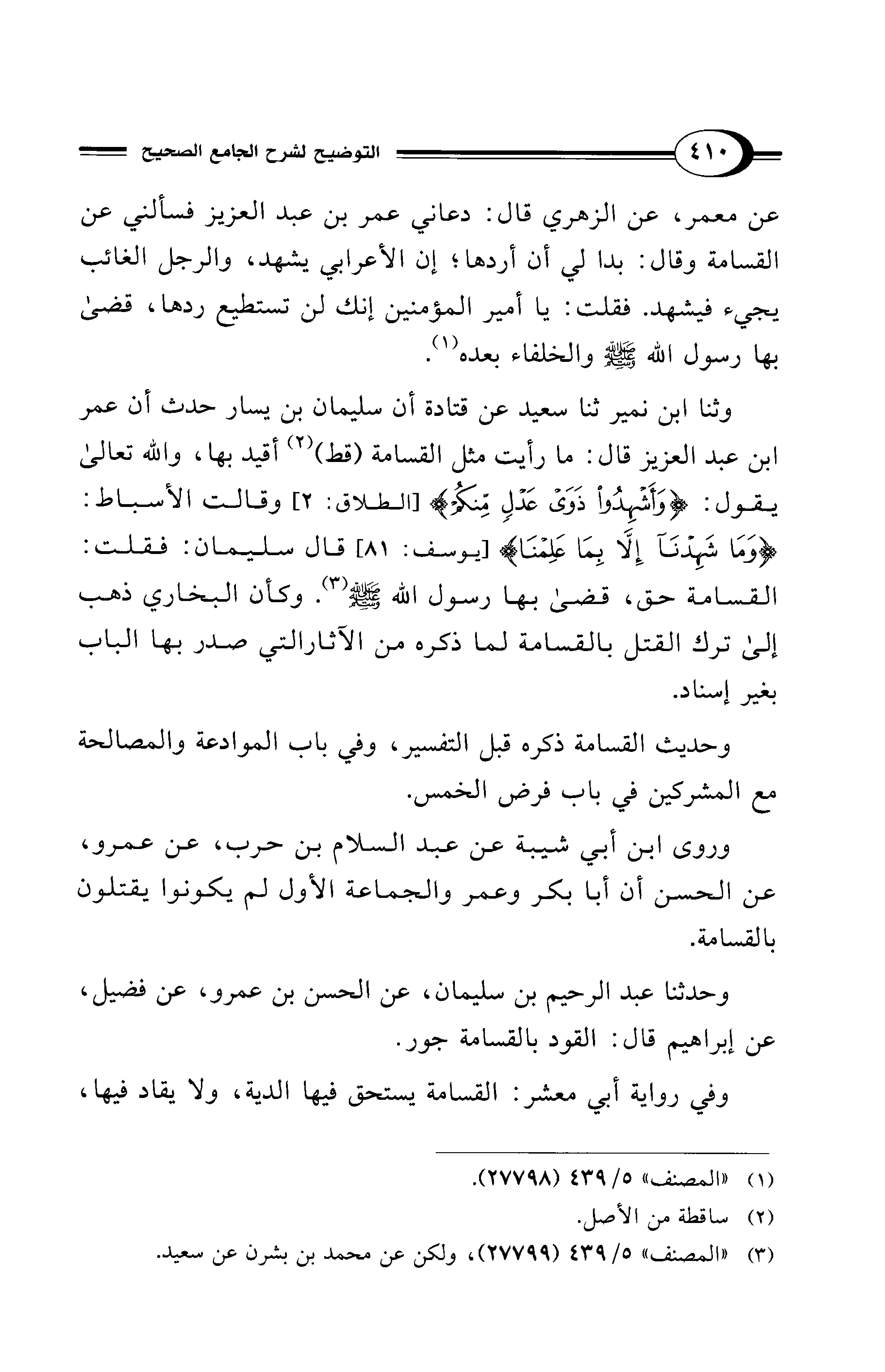 وثنا ابن نمير ثنا سعيد عن قتادة أن سليمان بن يسار حدث أن عمر ابن عبد العزيز قال: ما رأيت مثل القسامة (قط) (¬2) أقيد بها، والله تعالى يقول: {وَأَشْهِدُوا ذَوَيْ عَدْلٍ مِنْكُمْ} [الطلاق: 2] وقالت الأسباط: {وَمَا شَهِدْنَا إِلَّا بِمَا عَلِمْنَا} [يوسف: 81] قال سليمان: فقلت: القسامة حق، قضى بها رسول الله - صلى الله عليه وسلم - (¬3). وكأن البخاري ذهب إلى ترك القتل بالقسامة لما ذكره من الآثارالتي صدر بها الباب بغير إسناد.
