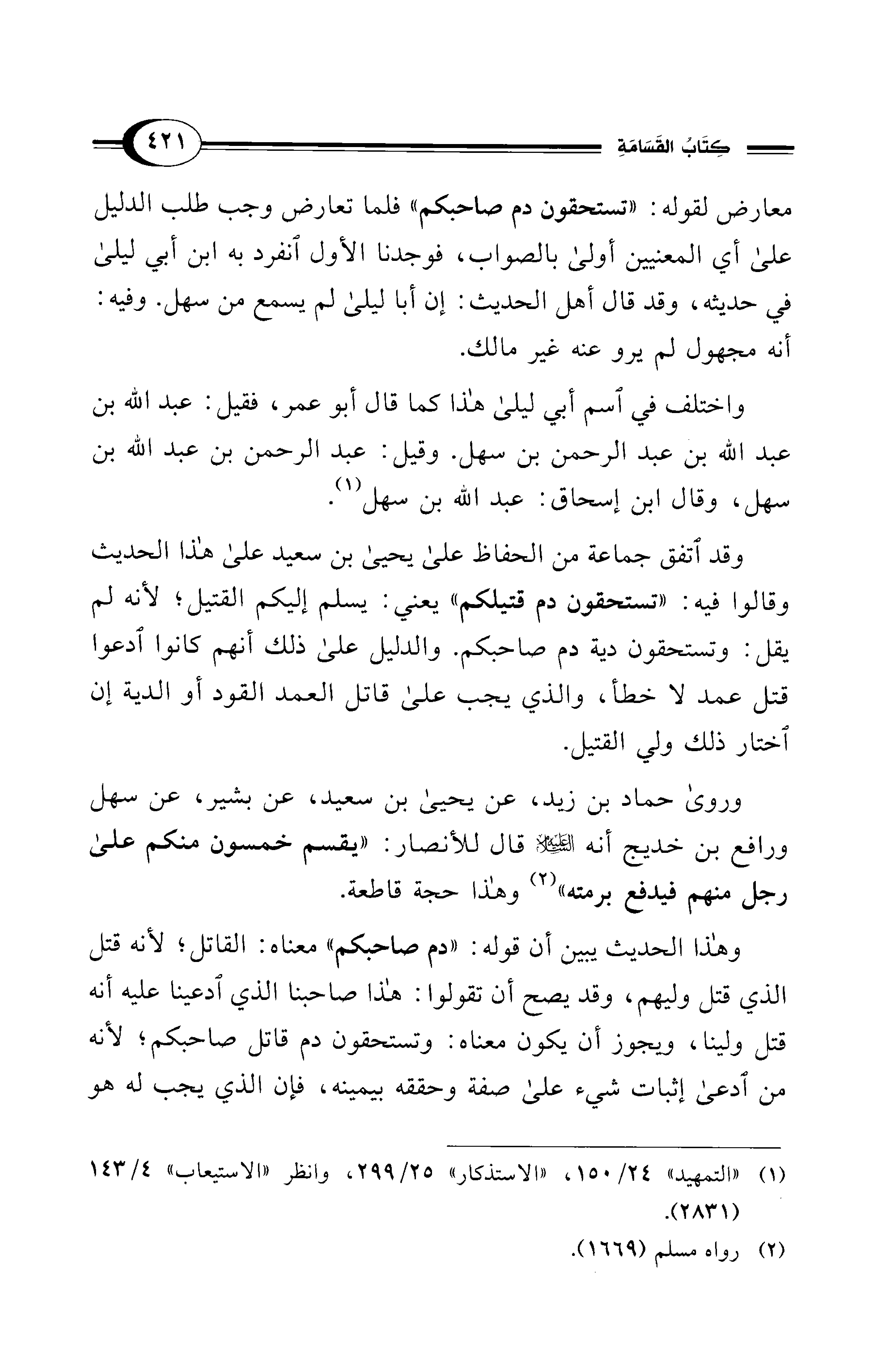 وقد اتفق جماعة من الحفاظ على يحيى بن سعيد على هذا الحديث وقالوا فيه: "تستحقون دم قتيلكم" يعني: يسلم إليكم القتيل؛ لأنه لم يقل: وتستحقون دية دم صاحبكم. والدليل على ذلك أنهم كانوا ادعوا قتل عمد لا خطأ، والذي يجب على قاتل العمد القود أو الدية إن اختار ذلك ولي القتيل.