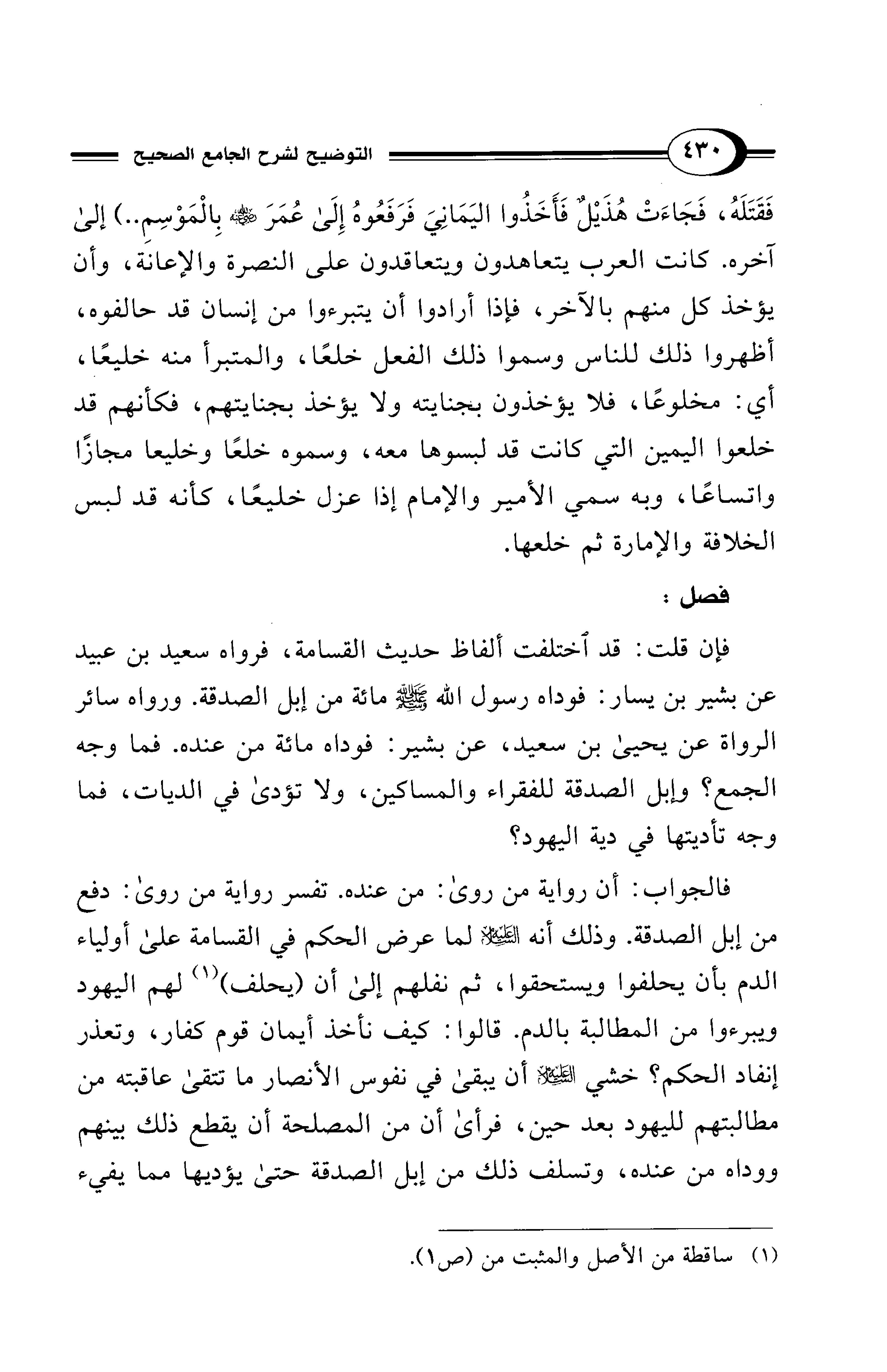 فإن قلت: قد اختلفت ألفاظ حديث القسامة، فرواه سعيد بن عبيد عن بشير بن يسار: فوداه رسول الله - صلى الله عليه وسلم - مائة من إبل الصدقة. ورواه سائر الرواة عن يحيى بن سعيد، عن بشير: فوداه مائة من عنده. فما وجه الجمع؟ وإبل الصدقة للفقراء والمساكين، ولا تؤدى في الديات، فما وجه تأديتها في دية اليهود؟