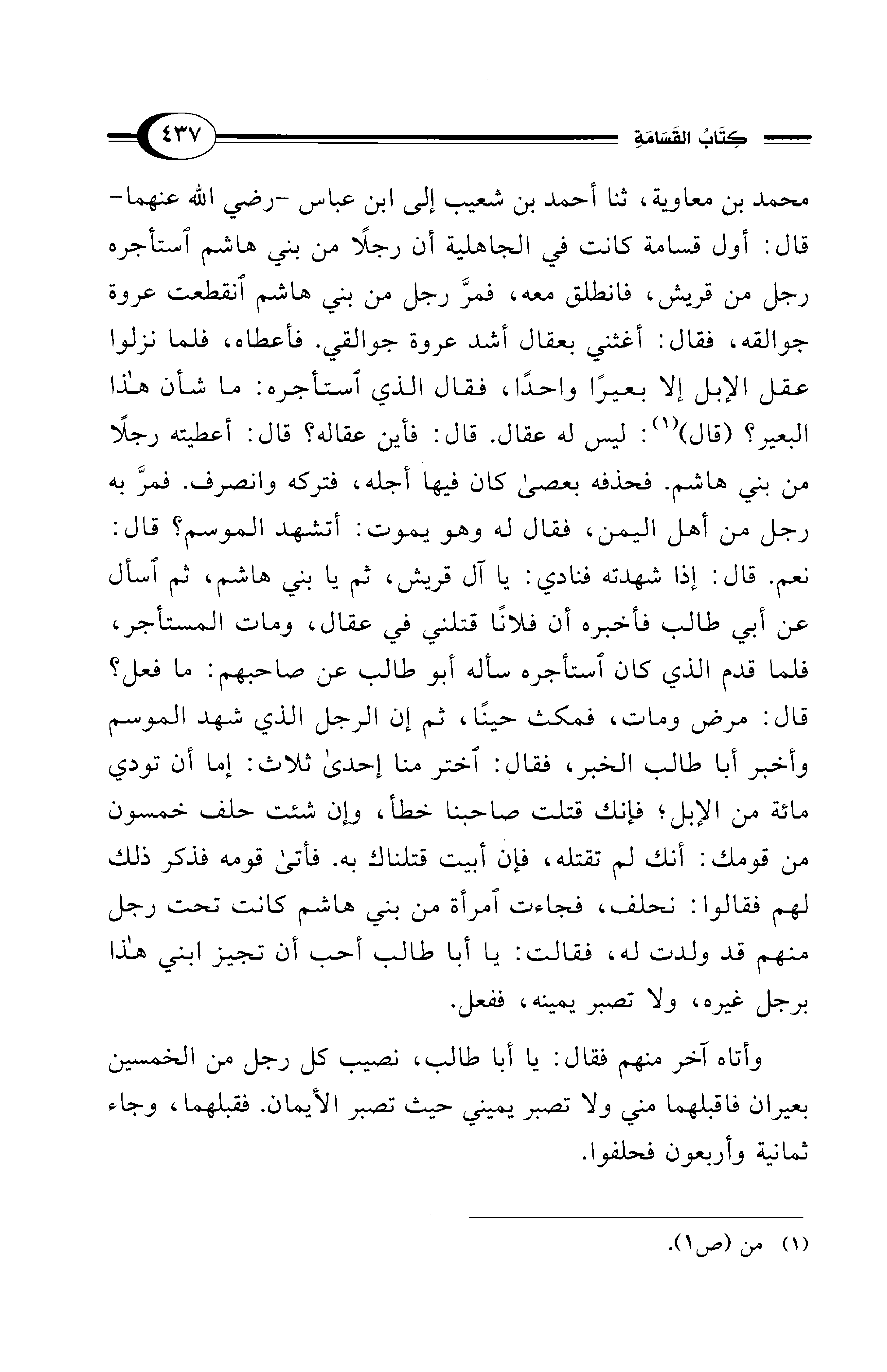 محمد بن معاوية، ثنا أحمد بن شعيب إلى ابن عباس - رضي الله عنهما - قال: أول قسامة كانت في الجاهلية أن رجلاً من بني هاشم استأجره رجل من قريش، فانطلق معه، فمرَّ رجل من بني هاشم انقطعت عروة جوالقه، فقال: أغثني بعقال أشد عروة جوالقي. فأعطاه، فلما نزلوا عقل الإبل إلا بعيرًا واحدًا، فقال الذي استأجره: ما شأن هذا البعير؟ (قال) (¬1): ليس له عقال. قال: فأين عقاله؟ قال: أعطيته رجلاً من بني هاشم. فحذفه بعصى كان فيها أجله، فتركه وانصرف. فمرَّ به رجل من أهل اليمن، فقال له وهو يموت: أتشهد الموسم؟ قال: نعم. قال: إذا شهدته فنادي: يا آل قريش، ثم يابني هاشم، ثم اسأل عن أبي طالب فأخبره أن فلانًا قتلني في عقال، ومات المستأجر، فلما قدم الذي كان استأجره سأله أبو طالب عن صاحبهم: ما فعل؟ قال: مرض ومات، فمكث حينًا، ثم إن الرجل الذي شهد الموسم وأخبر أبا طالب الخبر، فقال: اختر منا إحدى ثلاث: إما أن تودي مائة من الإبل؛ فإنك قتلت صاحبنا خطأ، وإن شئت حلف خمسون من قومك: أنك لم تقتله، فإن أبيت قتلناك به. فأتى قومه فذكر ذلك لهم فقالوا: نحلف، فجاءت امرأة من بني هاشم كانت تحت رجل منهم قد ولدت له، فقالت: يا أبا طالب أحب أن تجيز ابني هذا برجل غيره، ولا تصبر يمينه، ففعل.