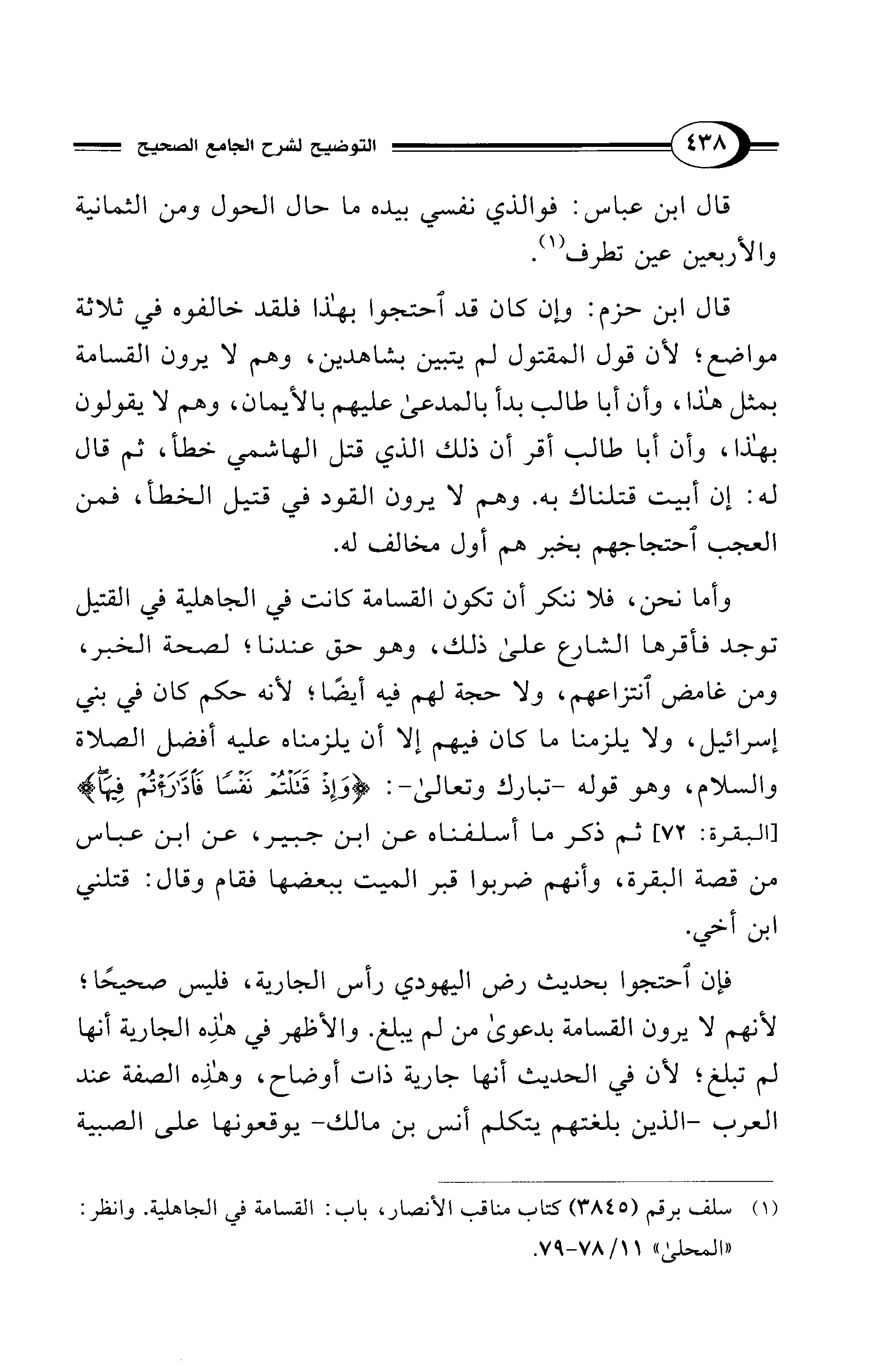 وأما نحن، فلا ننكر أن تكون القسامة كانت في الجاهلية في القتيل توجد فأقرها الشارع على ذلك، وهو حق عندنا؛ لصحة الخبر، ومن غامض انتزاعهم، ولا حجة لهم فيه أيضًا؛ لأنه حكم كان في بني إسرائيل، ولا يلزمنا ما كان فيهم إلا أن يلزمناه - عليه أفضل الصلاة والسلام -، وهو قوله -تبارك وتعالى-: {وَإِذْ قَتَلْتُمْ نَفْسًا فَادَّارَأْتُمْ فِيهَا} [البقرة: 72] ثم ذكر ما أسلفناه عن ابن جبير، عن ابن عباس من قصة البقرة، وأنهم ضربوا قبر الميت ببعضها فقام وقال: قتلني ابن أخي.