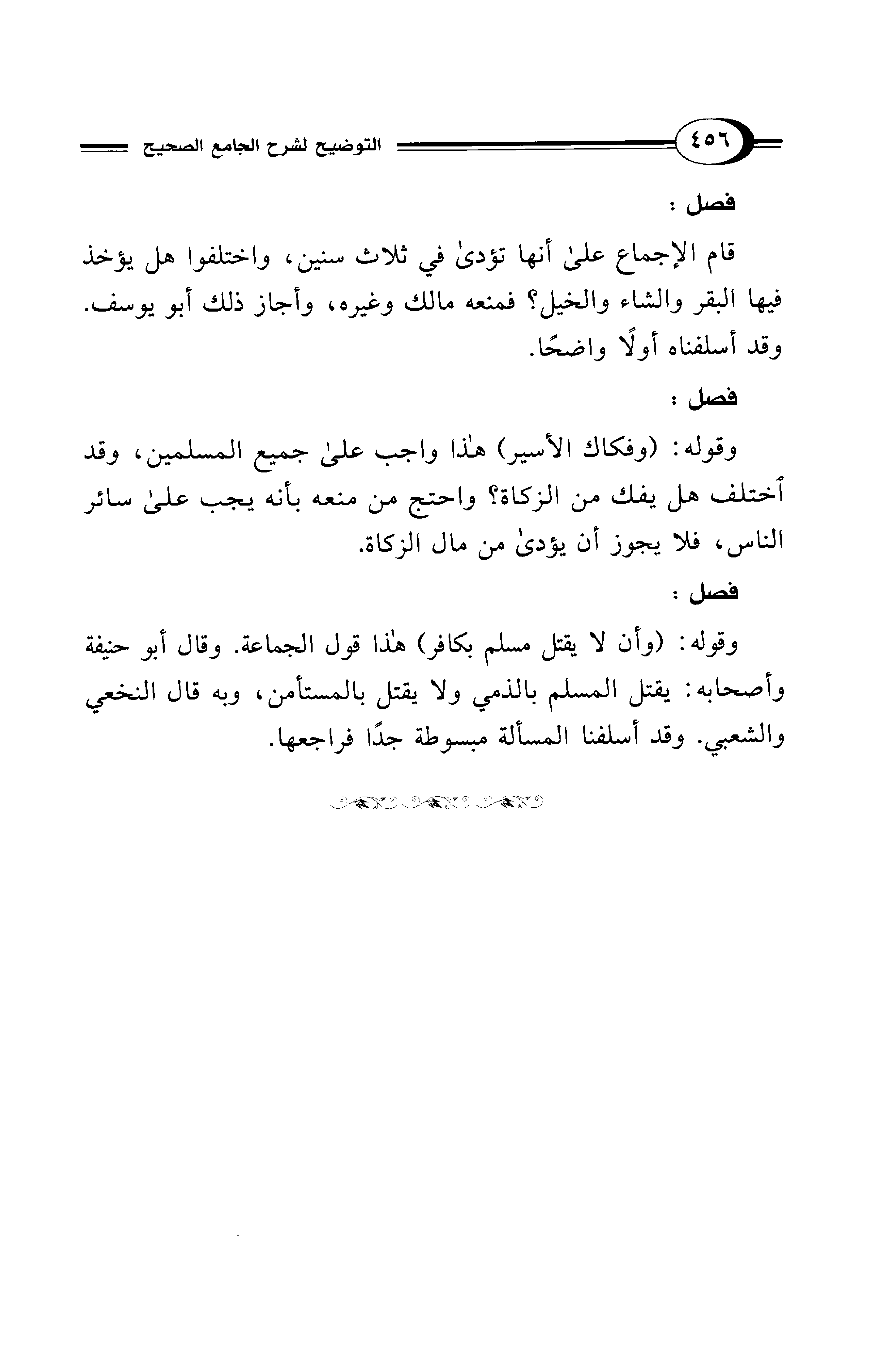 وقوله: (وفكاك الأسير) هذا واجب على جميع المسلمين، وقد اختلف هل يفك من الزكاة؟ واحتج من منعه بأنه يجب على سائر الناس، فلا يجوز أن يؤدى من مال الزكاة.