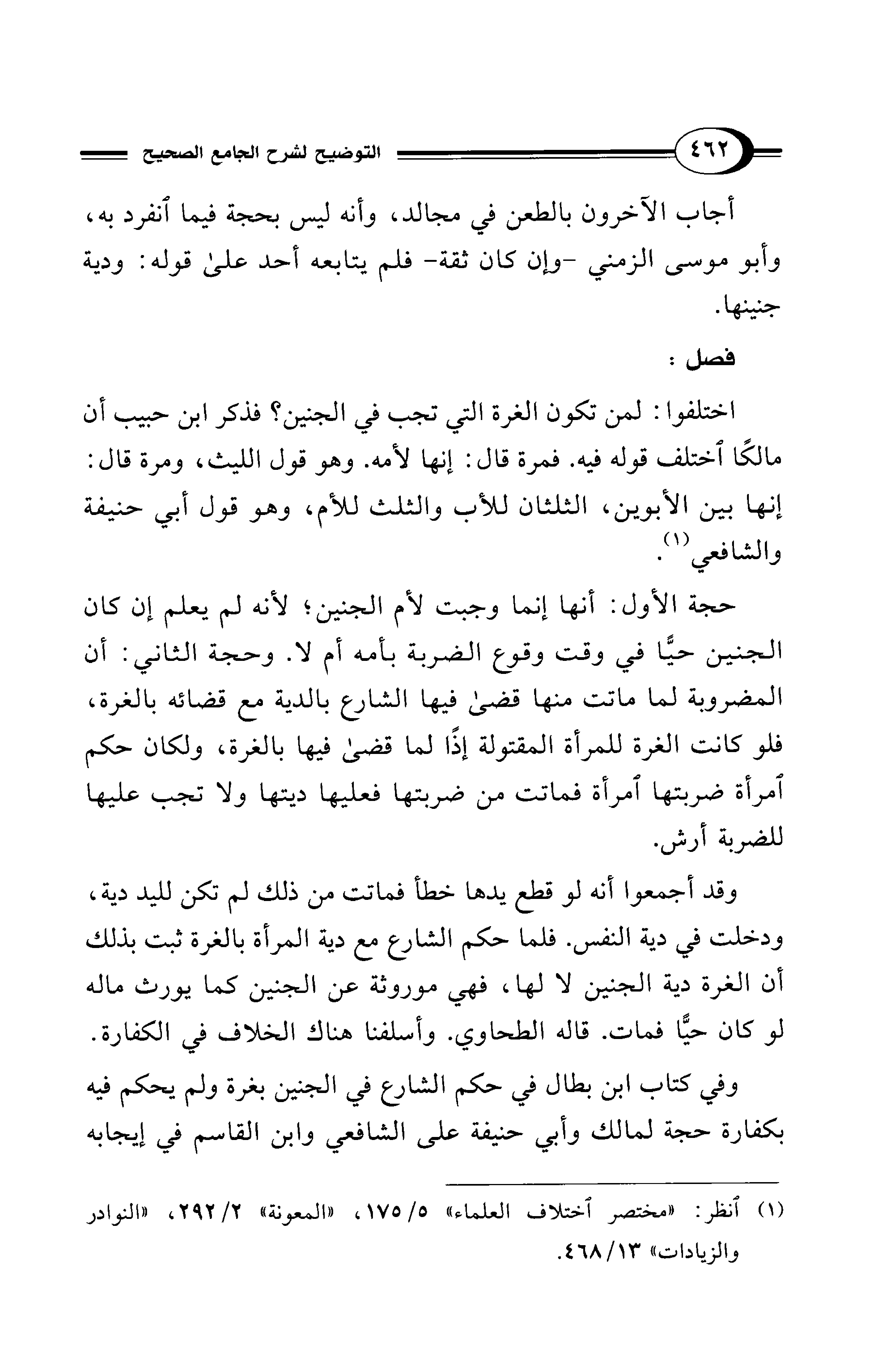 حجة الأول: أنها إنما وجبت لأم الجنين؛ لأنه لم يعلم إن كان الجنين حيًّا في وقت وقوع الضربة بأمه أم لا. وحجة الثاني: أن المضروبة لما ماتت منها قضى فيها الشارع بالدية مع قضائه بالغرة، فلو كانت الغرة للمرأة المقتولة إذًا لما قضى فيها بالغرة، ولكان حكم امرأة ضربتها امرأة فماتت من ضربتها فعليها ديتها ولا تجب عليها للضربة أرش.