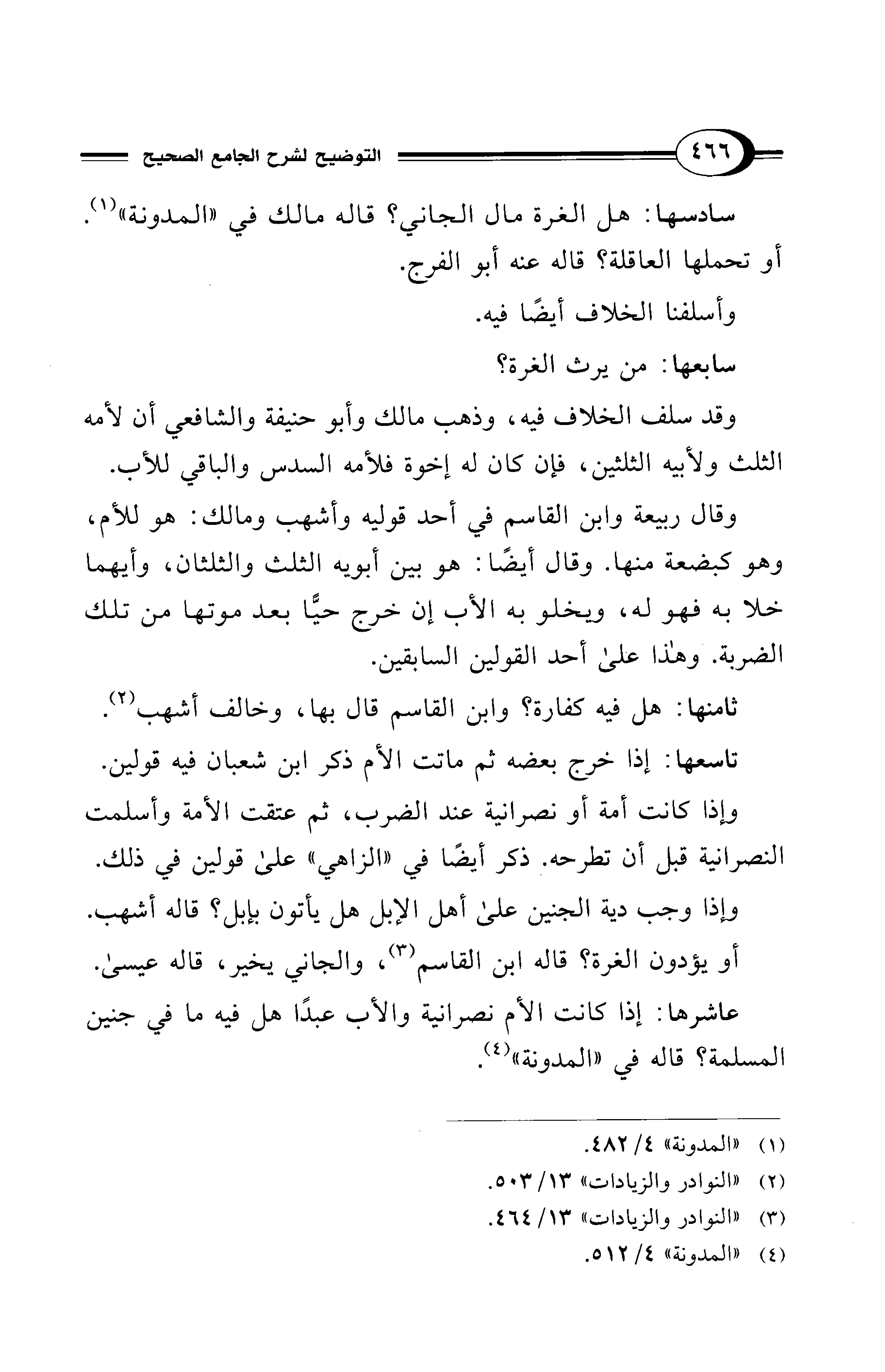 عاشرها: إذا كانت الأم نصرانية والأب عبدًا هل فيه ما في جنين المسلمة؟ قاله في "المدونة" (¬4).