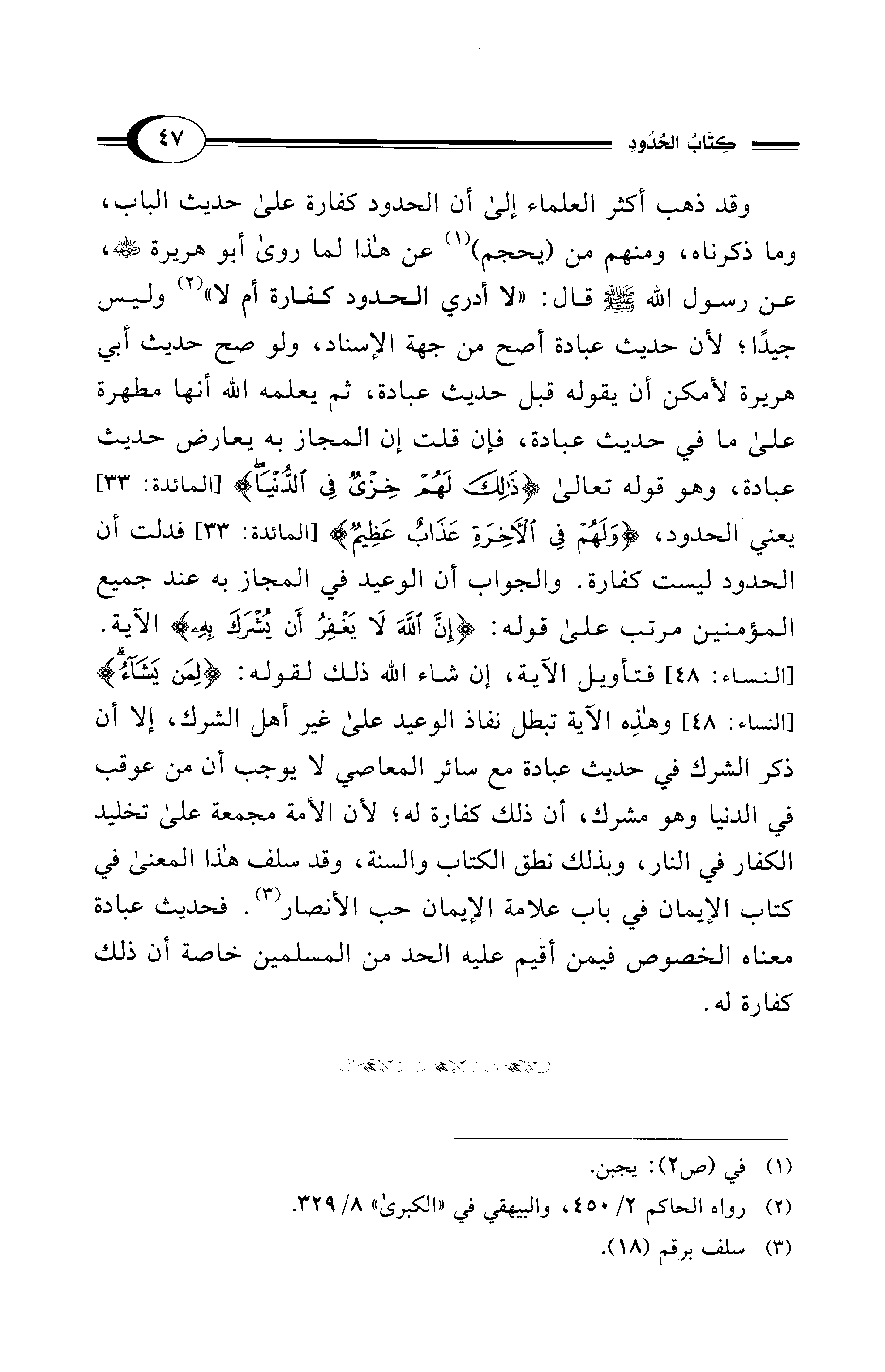 وقد ذهب أكثر العلماء إلى أن الحدود كفارة على حديث الباب، وما ذكرناه، ومنهم من (يحجم) (¬1) عن هذا لما روى أبو هريرة - رضي الله عنه -، عن رسول الله - صلى الله عليه وسلم - قال: "لا أدري الحدود كفارة أم لا" (¬2) وليس جيدًا؛ لأن حديث عبادة أصح من جهة الإسناد، ولو صح حديث أبي هريرة لأمكن أن يقوله قبل حديث عبادة، ثم يعلمه الله أنها مطهرة على ما في حديث عبادة، فإن قلت إن المجاز به يعارض حديث عبادة، وهو قوله تعالى {ذَلِكَ لَهُمْ خِزْيٌ فِي الدُّنْيَا} [المائدة: 33] يعني الحدود، {وَلَهُمْ فِي الْآخِرَةِ عَذَابٌ عَظِيمٌ} [المائدة: 33] فدلت أن الحدود ليست كفارة. والجواب أن الوعيد في المجاز به عند جميع المؤمنين مرتب على قوله: {إِنَّ اللهَ لَا يَغْفِرُ أَنْ يُشْرَكَ بِهِ} الآية. [النساء: 48] فتأويل الآية، إن شاء الله ذلك لقوله: {لِمَنْ يَشَاءُ} [النساء: 48] وهذِه الآية تبطل نفاذ الوعيد على غير أهل الشرك، إلا أن ذكر الشرك في حديث عبادة مع سائر المعاصي لا يوجب أن من عوقب في الدنيا وهو مشرك، أن ذلك كفارة له؛ لأن الأمة مجمعة على تخليد الكفار في النار، وبذلك نطق الكتاب والسنة، وقد سلف هذا المعنى في كتاب الإيمان في باب علامة الإيمان حب الأنصار (¬3). فحديث عبادة معناه الخصوص فيمن أقيم عليه الحد من المسلمين خاصة أن ذلك كفارة له.