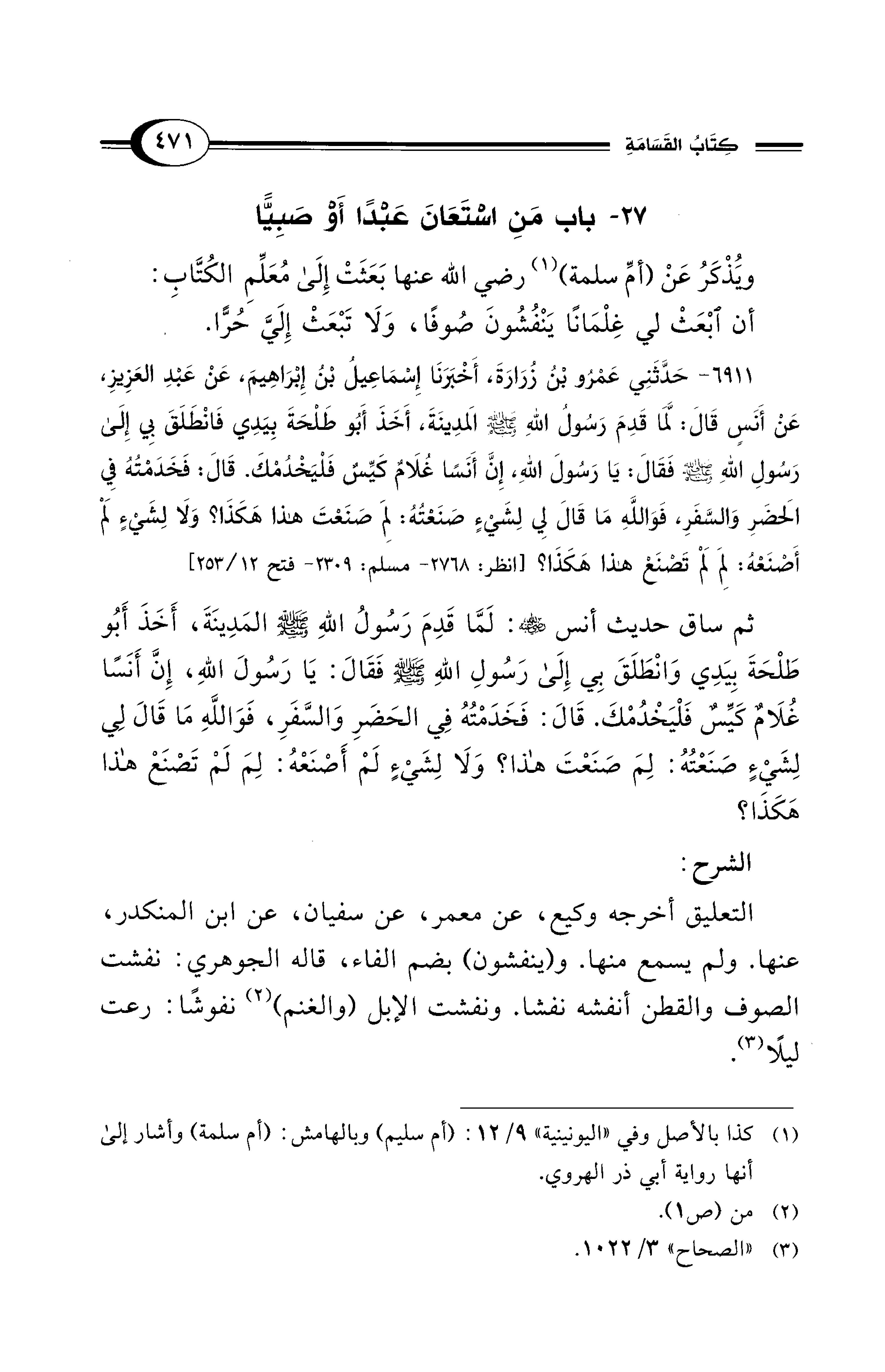 وَيُذْكَرُ أَنَّ (أُمَّ سُلَمة) (¬1) - رضي الله عنها - بَعَثَتْ إِلَى مُعَلِّمِ الكُتَّابِ: أن ابْعَثْ لَي غِلْمَانًا يَنْفُشُونَ صُوفًا، وَلاَ تَبْعَثْ إِلَيَّ حُرًّا.