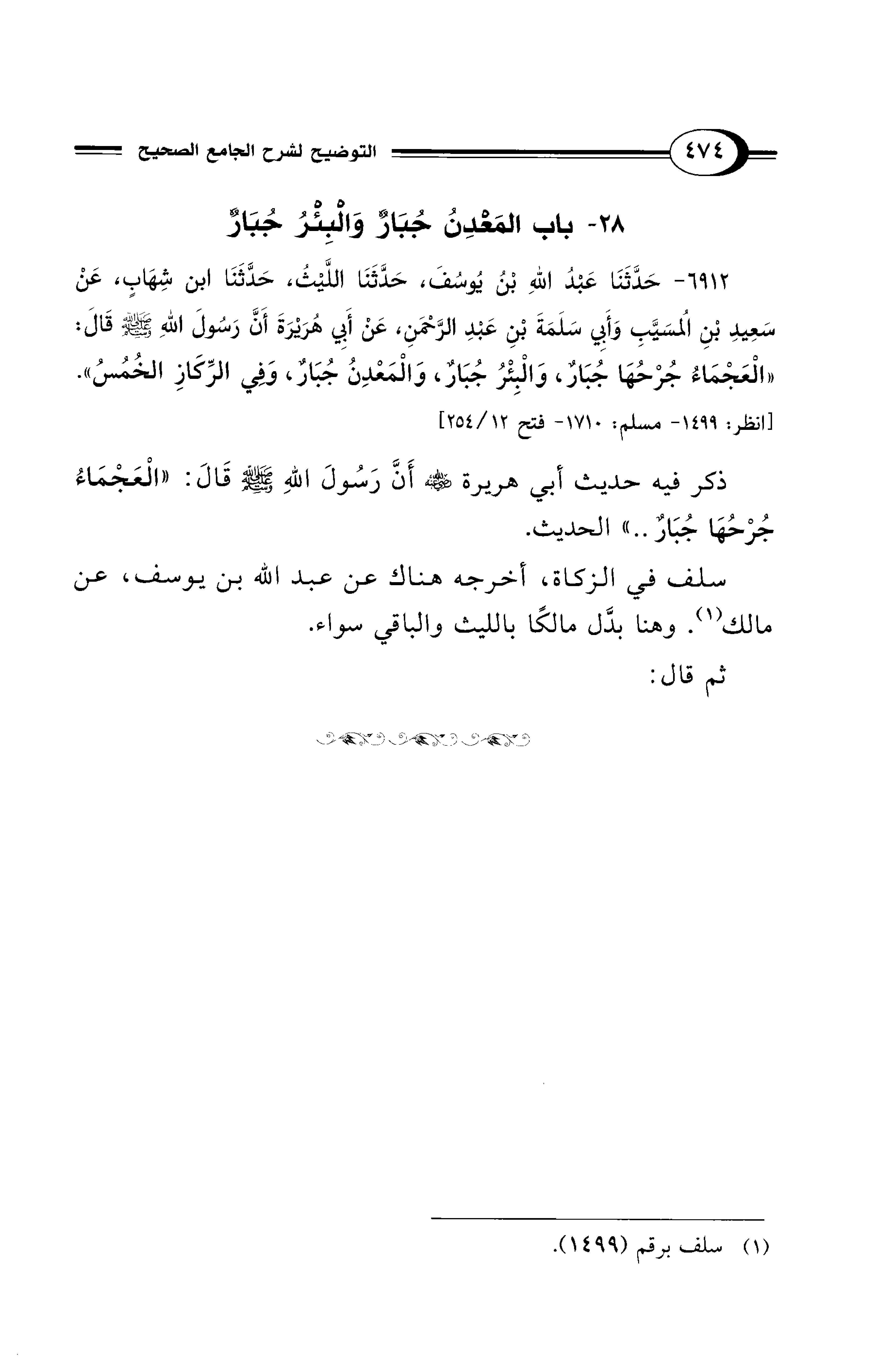 ذكر فيه حديث أبي هريرة - رضي الله عنه - أَنَّ رَسُولَ اللهِ - صلى الله عليه وسلم - قَالَ: "الْعَجْمَاءُ جُرْحُهَا جُبَارٌ .. " الحديث.