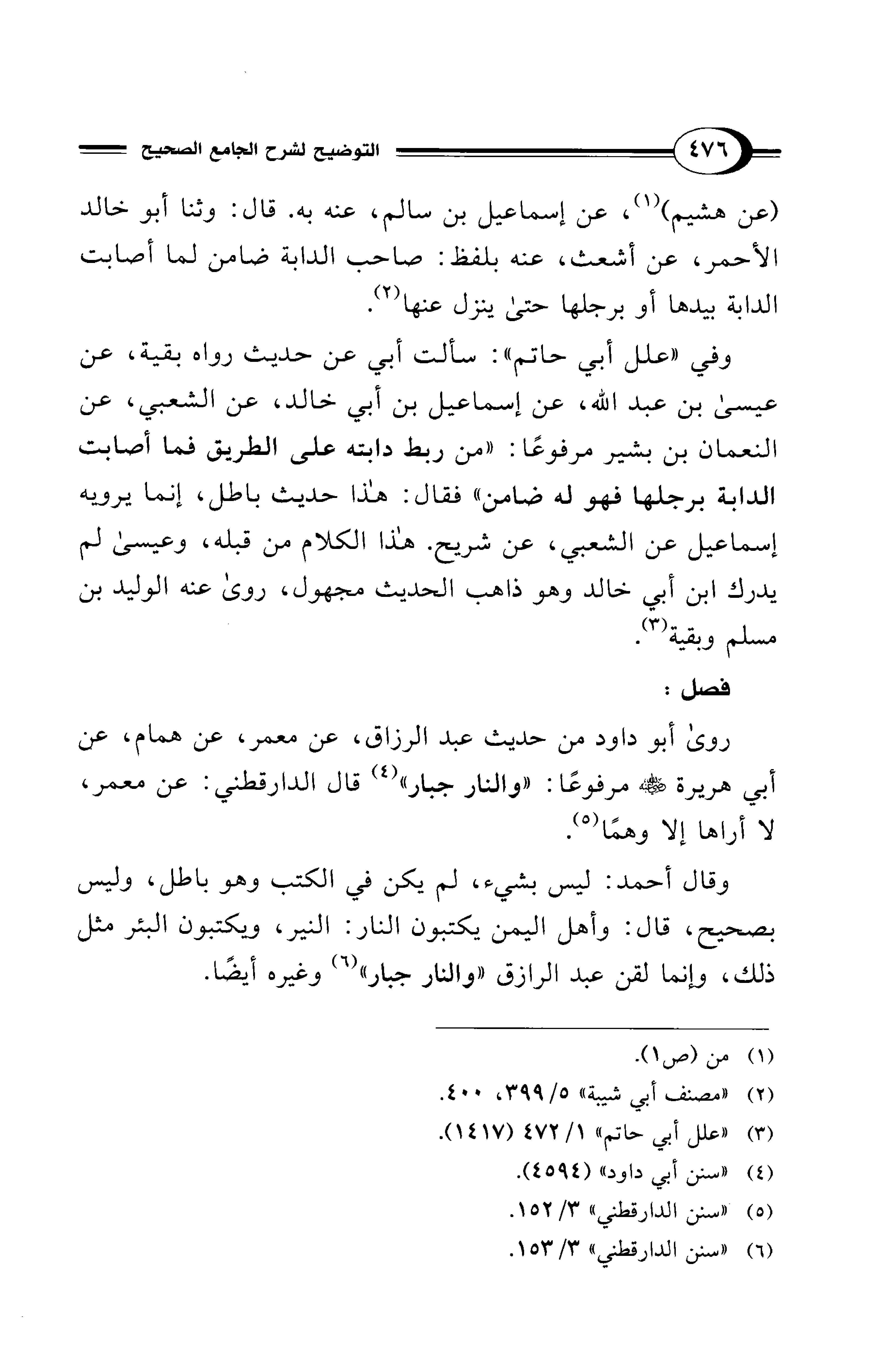 (عن هشيم) (¬1)، عن إسماعيل بن سالم، عنه به. قال: وثنا أبو خالد الأحمر، عن أشعث، عنه بلفظ: صاحب الدابة ضامن لما أصابت الدابة بيدها أو برجلها حتى ينزل عنها (¬2).