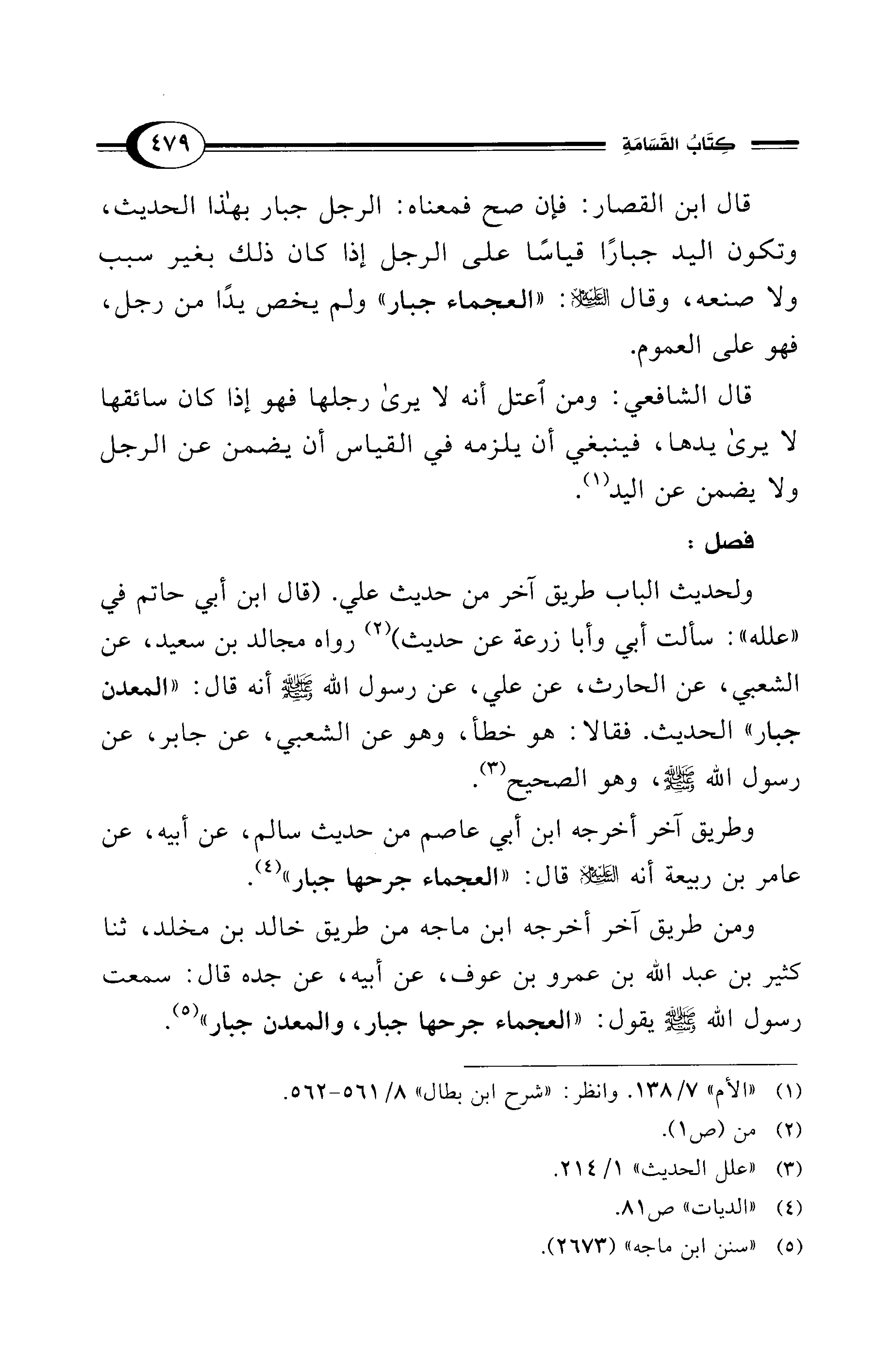 ومن طريق آخر أخرجه ابن ماجه من طريق خالد بن مخلد، ثنا كثير بن عبد الله بن عمرو بن عوف، عن أبيه، عن جده قال: سمعت رسول الله - صلى الله عليه وسلم - يقول: "العجماء جرحها جبار، والمعدن جبار" (¬5).