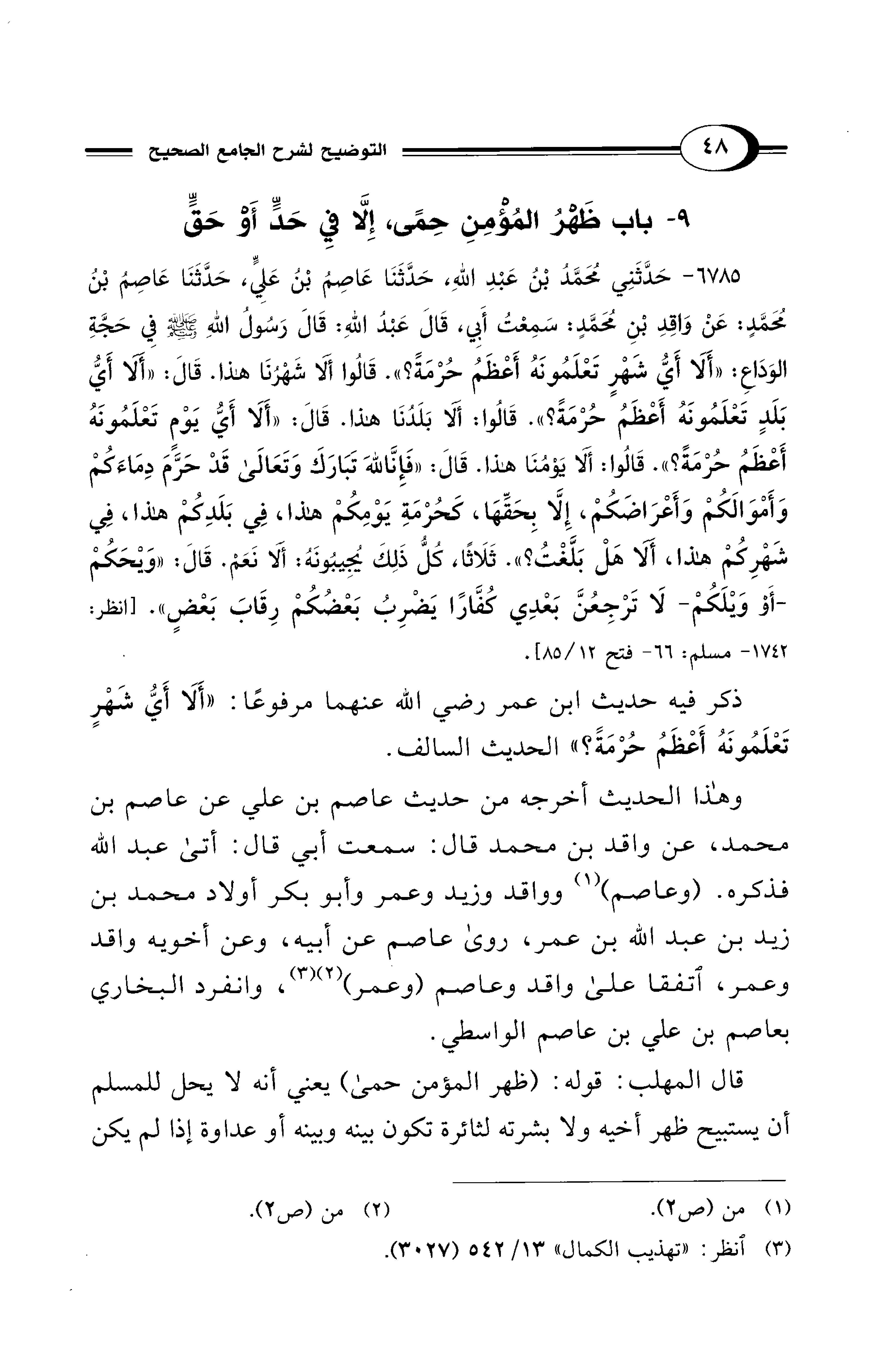 6785 - حَدَّثَنِي مُحَمَّدُ بْنُ عَبْدِ اللهِ حَدَّثَنَا عَاصِمُ بْنُ عَلِيٍّ، حَدَّثَنَا عَاصِمُ بْنُ مُحَمَّدٍ: عَنْ وَاقِدِ بْنِ مُحَمَّدٍ: سَمِعْتُ أَبِي، قَالَ عَبْدُ اللهِ: قَالَ رَسُولُ اللهِ - صلى الله عليه وسلم - فِي حَجَّةِ الوَدَاعِ: «أَلاَ أَيُّ شَهْرٍ تَعْلَمُونَهُ أَعْظَمُ حُرْمَةً؟». قَالُوا أَلاَ شَهْرُنَا هَذَا. قَالَ: «أَلاَ أَيُّ بَلَدٍ تَعْلَمُونَهُ أَعْظَمُ حُرْمَةً؟».قَالُوا: أَلاَ بَلَدُنَا هَذَا. قَالَ: «أَلاَ أَيُّ يَوْمٍ تَعْلَمُونَهُ أَعْظَمُ حُرْمَةً؟». قَالُوا: أَلاَ يَوْمُنَا هَذَا. قَالَ: «فَإِنَّ اللهَ تَبَارَكَ وَتَعَالَى قَدْ حَرَّمَ دِمَاءَكُمْ وَأَمْوَالَكُمْ وَأَعْرَاضَكُمْ، إِلاَّ بِحَقِّهَا، كَحُرْمَةِ يَوْمِكُمْ هَذَا، فِي بَلَدِكُمْ هَذَا، فِي شَهْرِكُمْ هَذَا، أَلاَ هَلْ بَلَّغْتُ؟». ثَلاَثًا كُلُّ ذَلِكَ يُجِيبُونَهُ: أَلاَ نَعَمْ. قَالَ: «وَيْحَكُمْ
