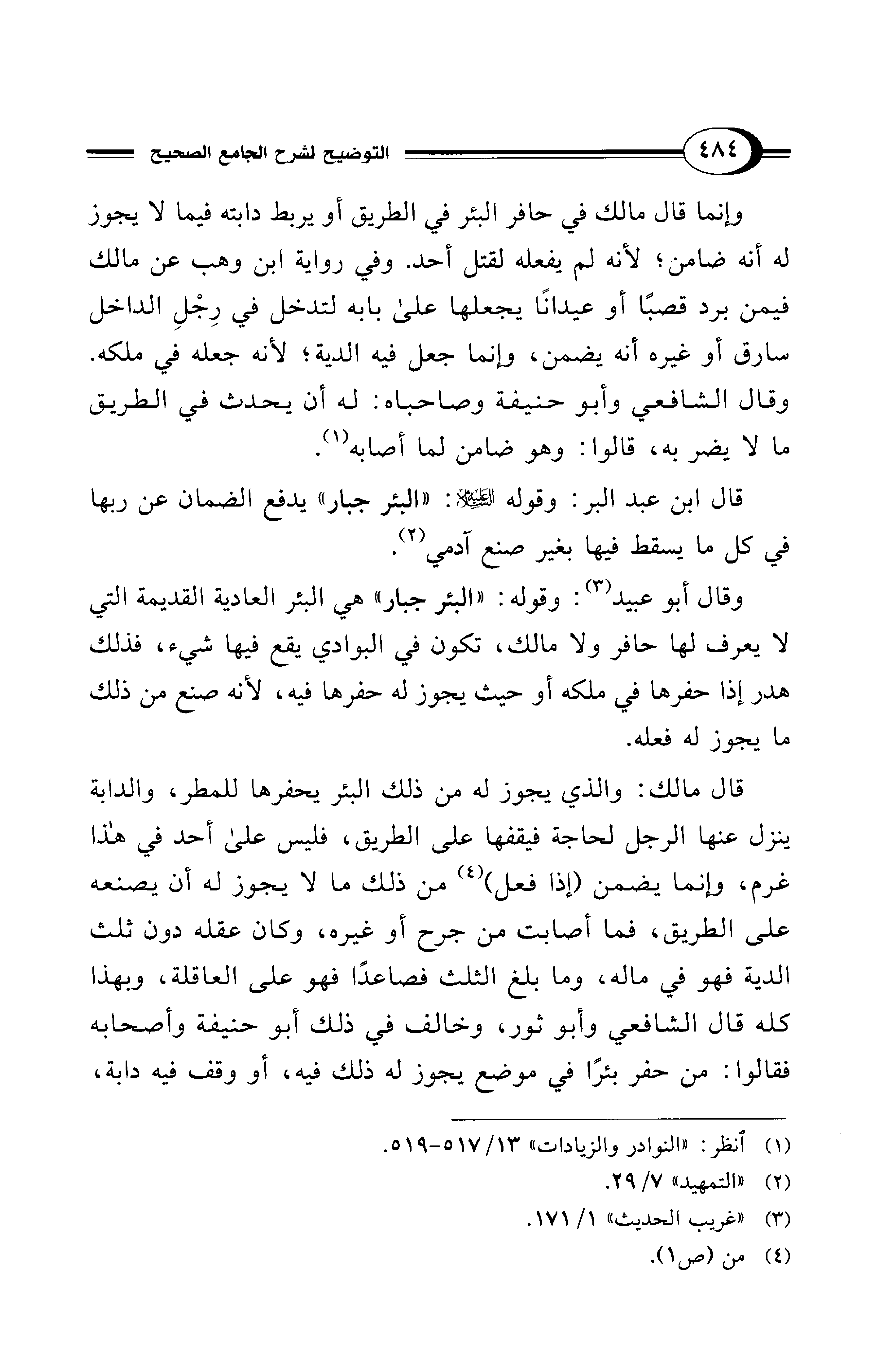 وإنما قال مالك في حافر البئر في الطريق أو يربط دابته فيما لا يجوز له أنه ضامن؛ لأنه لم يفعله لقتل أحد. وفي رواية ابن وهب عن مالك فيمن برد قصبًا أو عيدانًا يجعلها على بابه لتدخل في رِجْلِ الداخل سارق أو غيره أنه يضمن، وإنما جعل فيه الدية؛ لأنه جعله في ملكه. وقال الشافعي وأبو حنيفة وصاحباه: له أن يحدث في الطريق ما لا يضر به، قالوا: وهو ضامن لما أصابه (¬1).