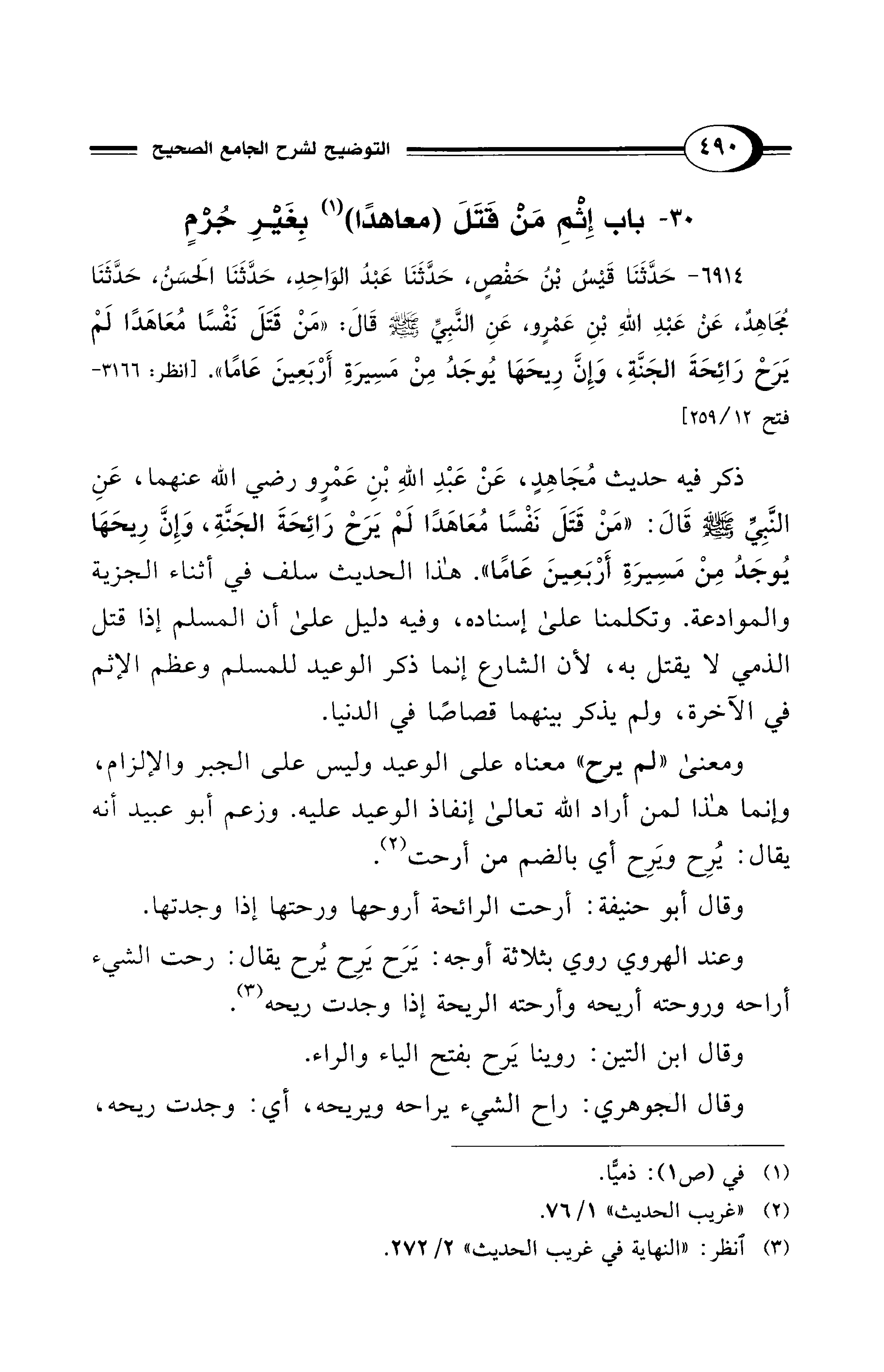 ذكر فيه حديث مُجَاهِدٍ، عَنْ عَبْدِ اللهِ بْنِ عَمْرٍو - رضي الله عنهما -، عَنِ النَّبِيِّ - صلى الله عليه وسلم - قَالَ: "مَنْ قَتَلَ نَفْسًا مُعَاهَدًا لَم يَرَحْ رَائِحَةَ الجَنَّةِ، وَإِنَّ رِيحَهَا يُوجَدُ مِنْ مَسِيرَةِ أَرْبَعِينَ عَامًا". هذا الحديث سلف في أثناء الجزية والموادعة. وتكلمنا على إسناده، وفيه دليل على أن المسلم إذا قتل الذمي لا يقتل به؛ لأن الشارع إنما ذكر الوعيد للمسلم وعظم الإثم في الآخرة، ولم يذكر بينهما قصاصًا في الدنيا.