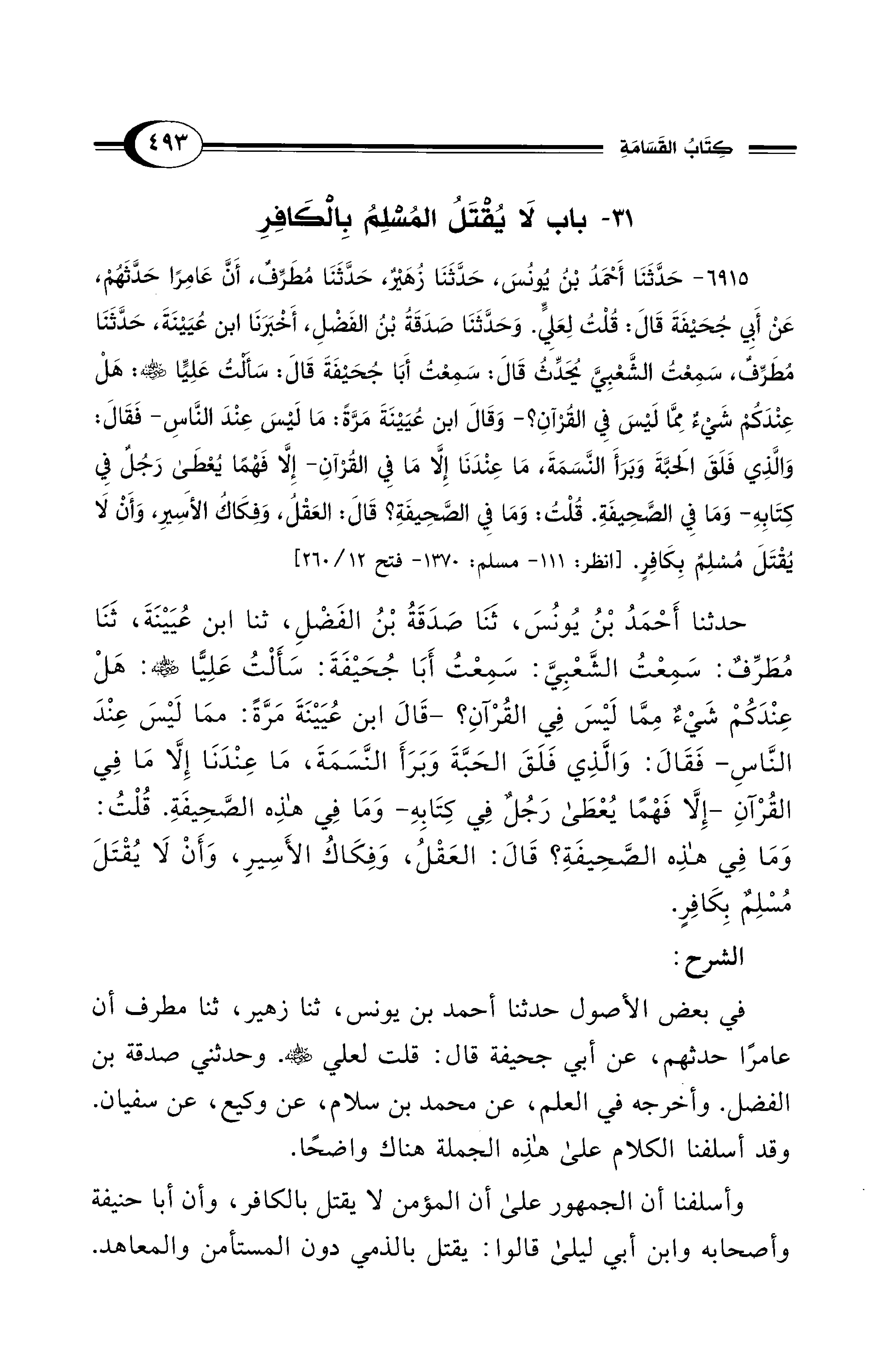 حدثنا أَحْمَدُ بْنُ يُونُسَ، ثَنَا صَدَقَةُ بْنُ الفَضْلِ، ثنا ابن عُيَيْنَةَ، ثَنَا مُطَرِّفٌ: سَمِعْتُ الشَّعْبِيَّ: سَمِعْتُ أَبَا جُحَيْفَةَ: سَأَلْتُ عَلِيًّا - رضي الله عنه -: هَلْ عِنْدَكُمْ شَيء مِمَّا لَيْسَ في القُرْاَن؟ -قَالَ ابن عُيَيْنَةَ مَرَّةً: ممَا لَيْسَ عِنْدَ النَّاسِ- فَقَالَ: وَالَّذِي فَلَقَ الحَبَّةَ وَبَرَأَ النَّسَمَةَ، مَا عِنْدَنَا إِلَّا مَا فِي القُرْآنِ -إِلَّا فَهْمًا يُعْطَي رَجُل في كِتَابِهِ- وَمَا فِي هذِه الصَّحِيفَةِ. قُلْتُ: وَمَا فِي هذِه الصَّحِيفَةِ؟ قَالَ: العَقْلُ، وَفِكَاكُ الأَسِيرِ، وَأَنْ لَا يُقْتَلَ مُسْلِمٌ بِكَافِرٍ.