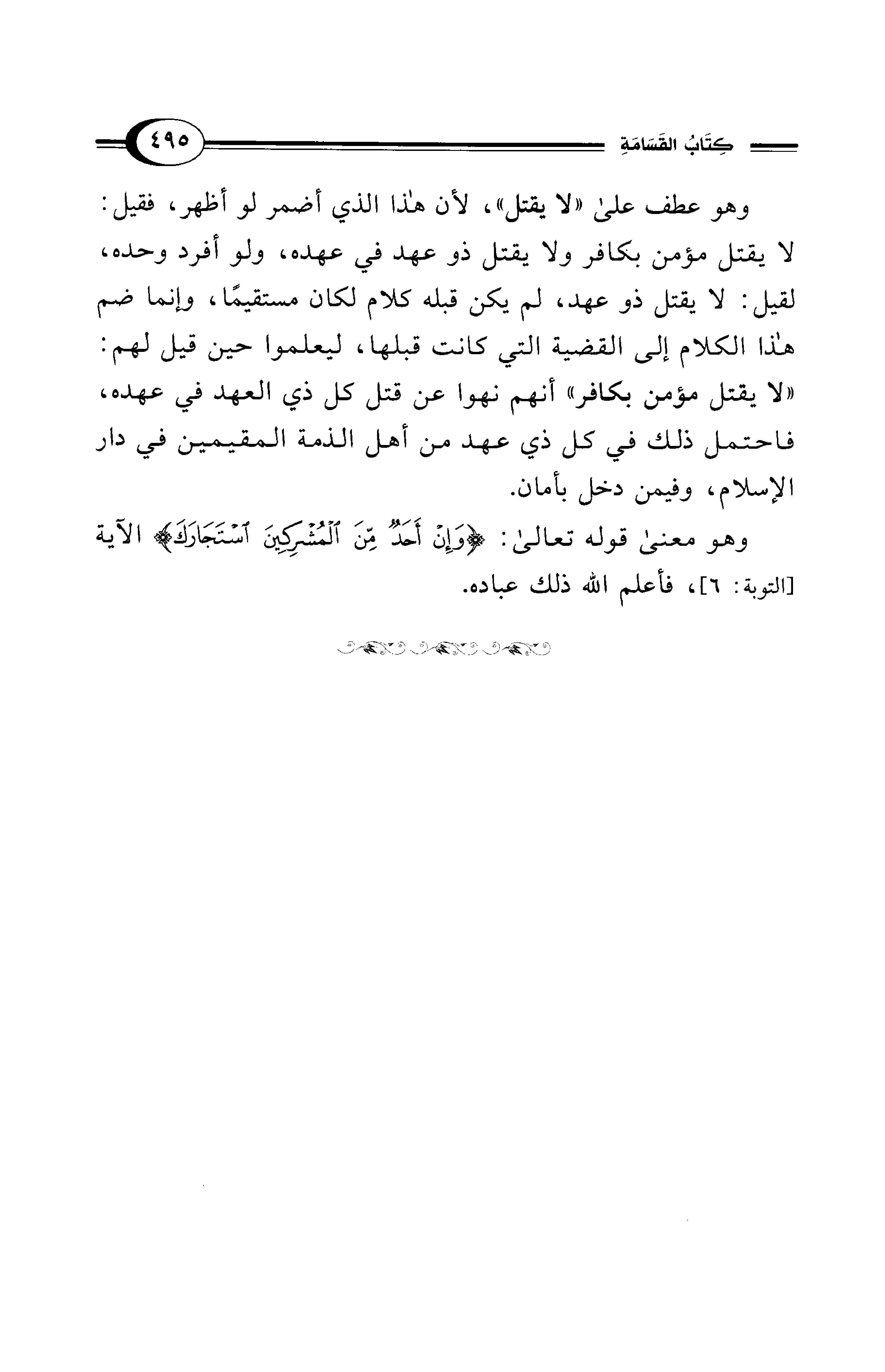 وهو عطف على "لا يقتل"، لأن هذا الذي أضمر لو أظهر، فقيل: لا يقتل مؤمن بكافر ولا يقتل ذو عهد في عهده، ولو أفرد وحده، لقيل: لا يقتل ذو عهد، لم يكن قبله كلام لكان مستقيمًا، وإنما ضم هذا الكلام إلى القضية التي كانت قبلها، ليعلموا حين قيل لهم: "لا يقتل مؤمن بكافر" أنهم نهوا عن قتل كل ذي العهد في عهده، فاحتمل ذلك في كل ذي عهد من أهل الذمة المقيمين في دار الإسلام، وفيمن دخل بأمان.