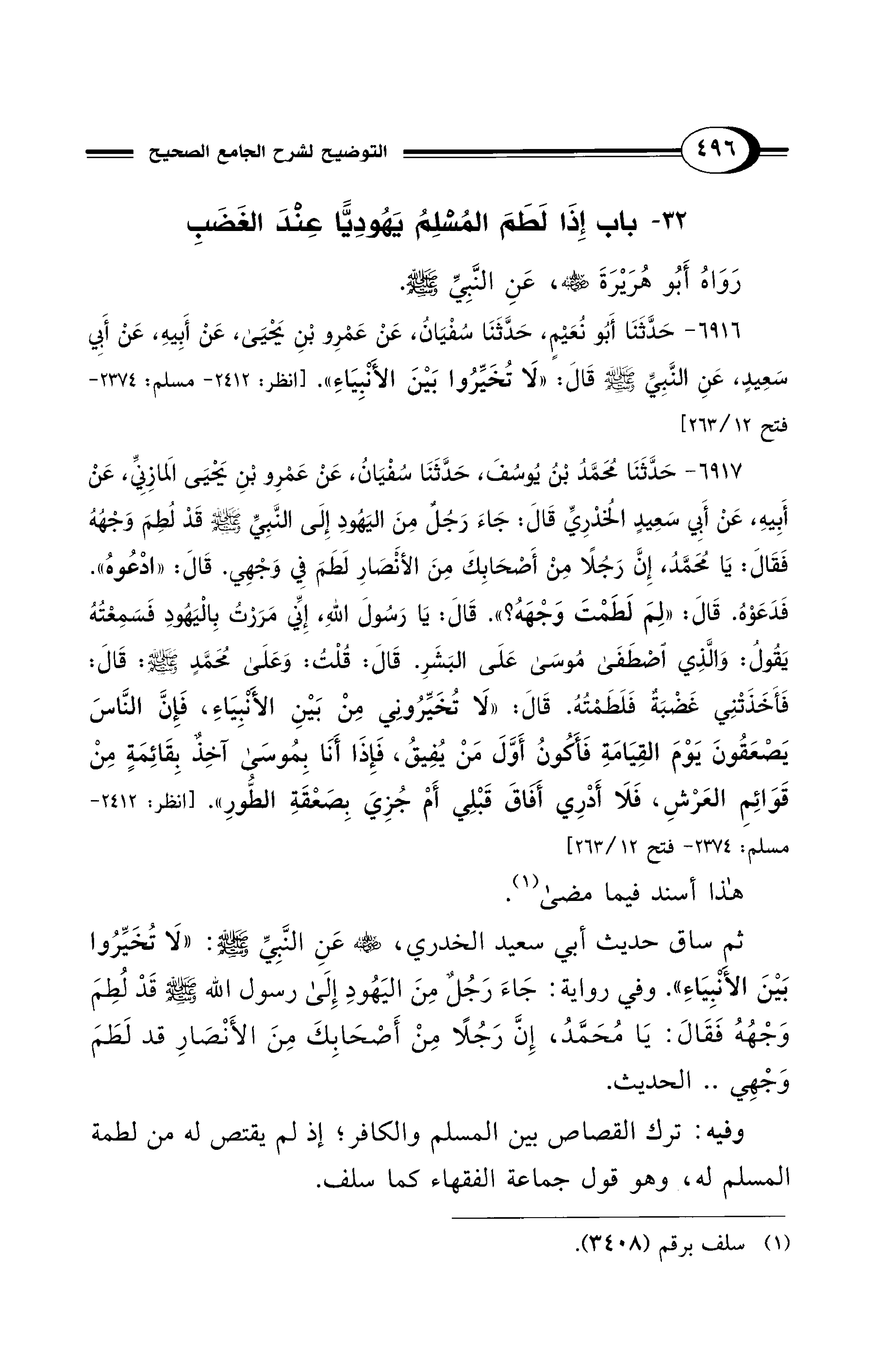 ثم ساق حديث أبي سعيد الخدري - رضي الله عنه -, عَنِ النَّبِيِّ - صلى الله عليه وسلم -: "لَا تُخَيِّرُوا بَيْنَ الأنبِيَاءِ". وفي رواية: جَاءَ رَجُلٌ مِنَ اليَهُودِ إِلَى رسول الله - صلى الله عليه وسلم - قدْ لُطِمَ وَجْهُهُ فَقَالَ: يَا مُحَمَّدُ، إِنَّ رَجُلًا مِنْ أَصْحَابِكَ مِنَ الأَنْصَارِ قد لَطَمَ وَجْهِي .. الحديث.