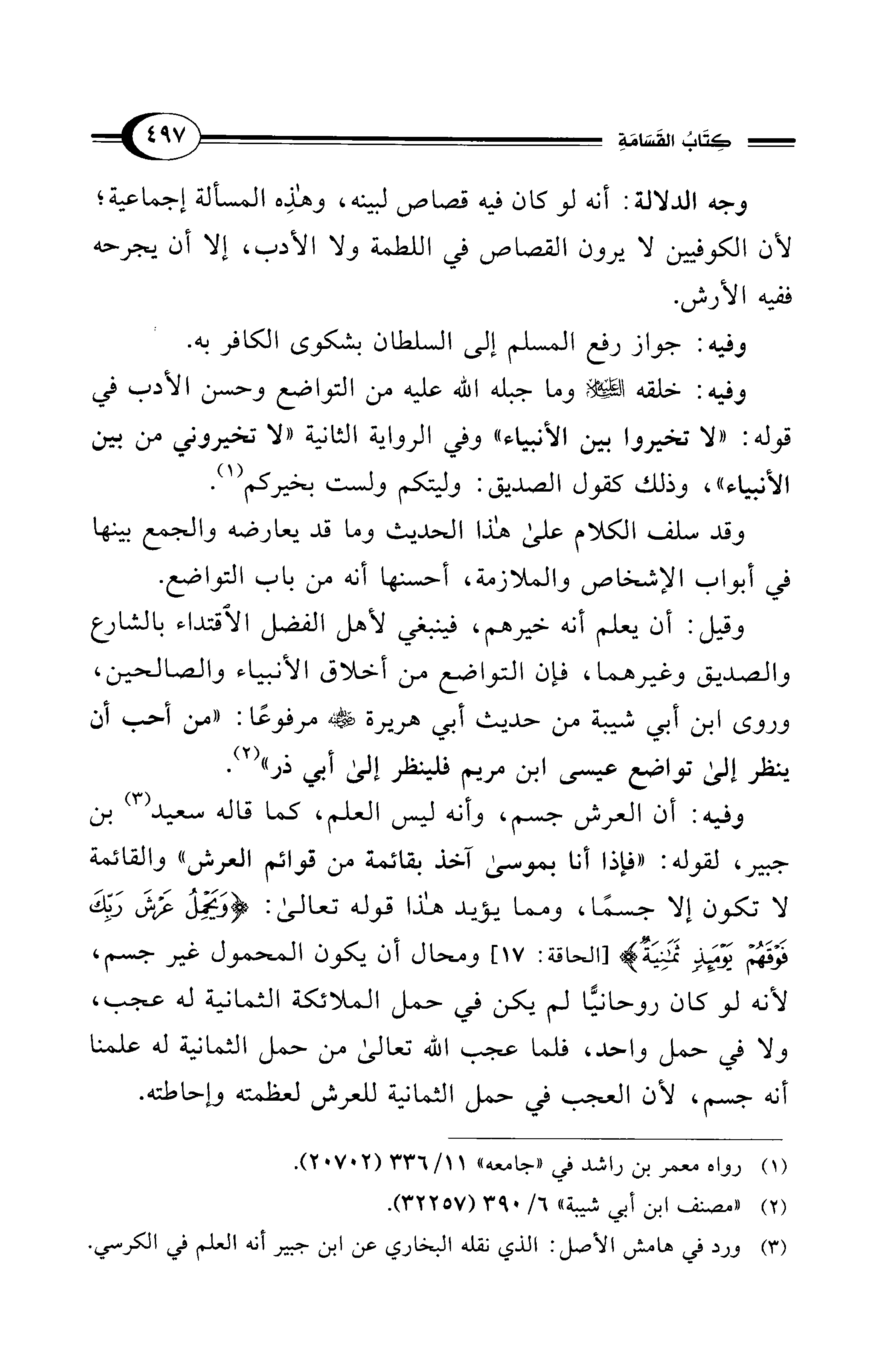 وفيه: أن العرش جسم، وأنه ليس العلم، كما قاله سعيد (¬3) بن جبير، لقوله: "فإذا أنا بموسى آخذ بقائمة من قوائم العرش" والقائمة لا تكون إلا جسمًا، ومما يؤيد هذا قوله تعالى: {وَيَحْمِلُ عَرْشَ رَبِّكَ فَوْقَهُمْ يَوْمَئِذٍ ثَمَانِيَةٌ} [الحاقة: 17] ومحال أن يكون المحمول غير جسم، لأنه لو كان روحانيًّا لم يكن في حمل الملائكة الثمانية له عجب، ولا في حمل واحد، فلما عجب الله تعالى من حمل الثمانية له علمنا أنه جسم؛ لأن العجب في حمل الثمانية للعرش لعظمته وإحاطته.