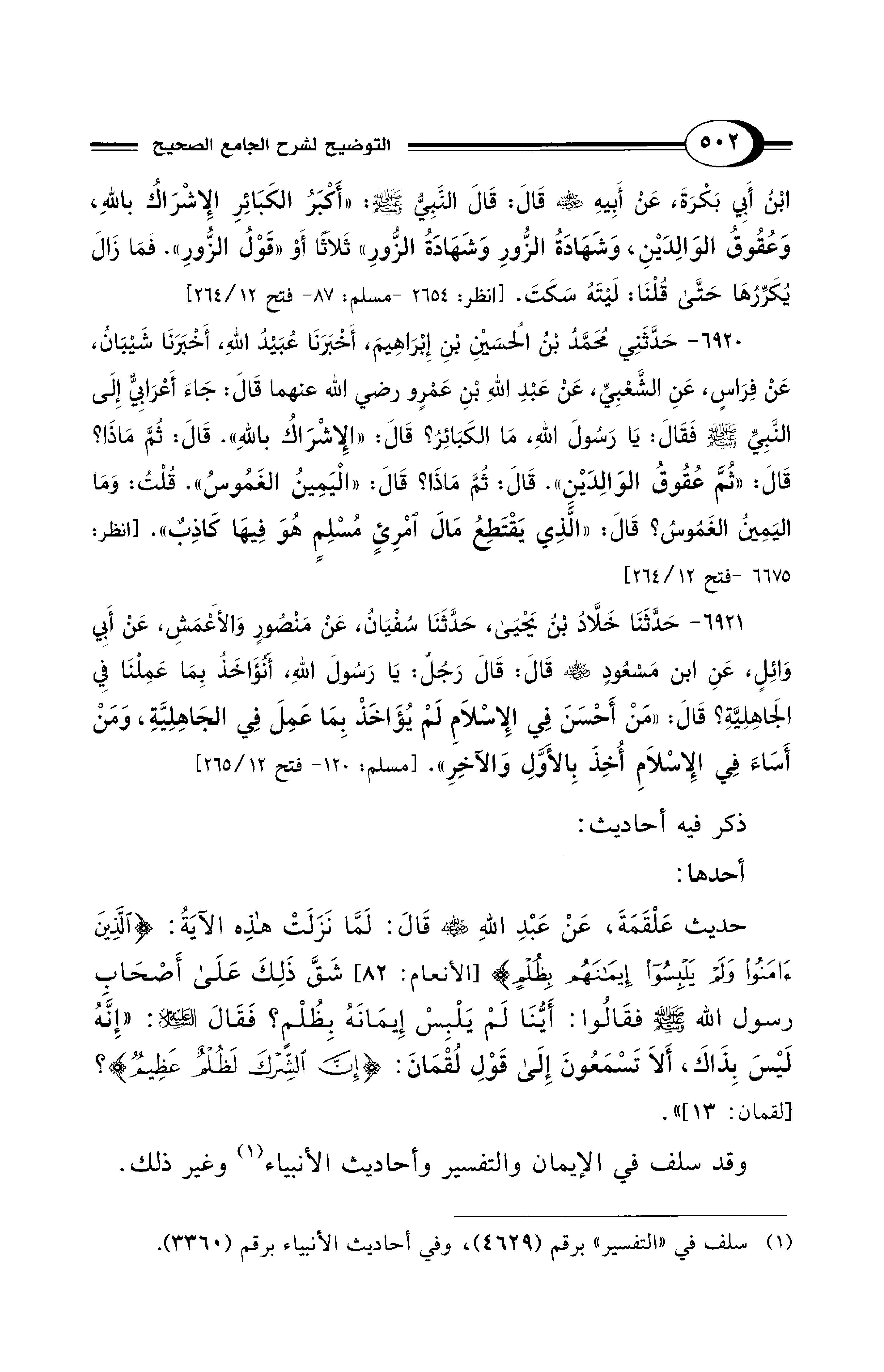 حديث عَلْقَمَةَ، عَنْ عَبْدِ اللهِ - رضي الله عنه - قَالَ: لَمَّا نَزَلَتْ هذِه الآيَةُ: {الَّذِينَ آمَنُوا وَلَمْ يَلْبِسُوا إِيمَانَهُمْ بِظُلْمٍ} [الأنعام: 82] شَقَّ ذَلِكَ عَلَى أَصْحَابِ رسول الله - صلى الله عليه وسلم - فقَالُوا: أَيُّنَا لَمْ يَلْبِسْ إِيمَانَهُ بِظُلْمٍ؟ فَقَالَ - عليه السلام -: "إِنَّهُ لَيْسَ بِذَاكَ، أَلاَ تَسْمَعُونَ إِلَى قَوْلِ لُقْمَانَ: {إِنَّ الشِّرْكَ لَظُلْمٌ عَظِيمٌ}؟ [لقمان: 13] ".
