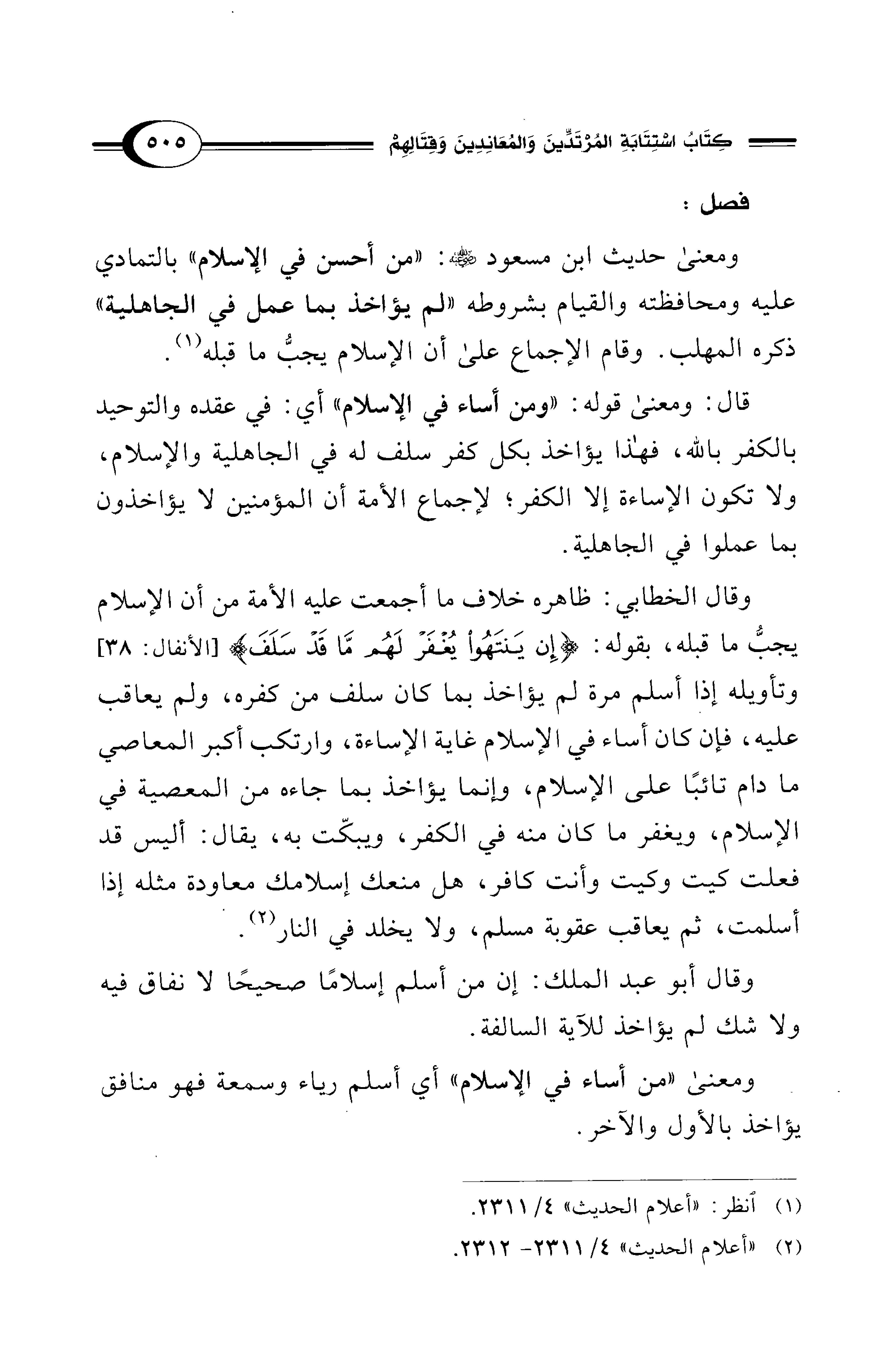 قال: ومعنى قوله: "ومن أساء في الإسلام" أي: في عقده والتوحيد بالكفر بالله، فهذا يؤاخذ بكل كفر سلف له في الجاهلية والإسلام، ولا تكون الإساءة إلا الكفر؛ لإجماع الأمة أن المؤمنين لا يؤاخذون بما عملوا في الجاهلية.