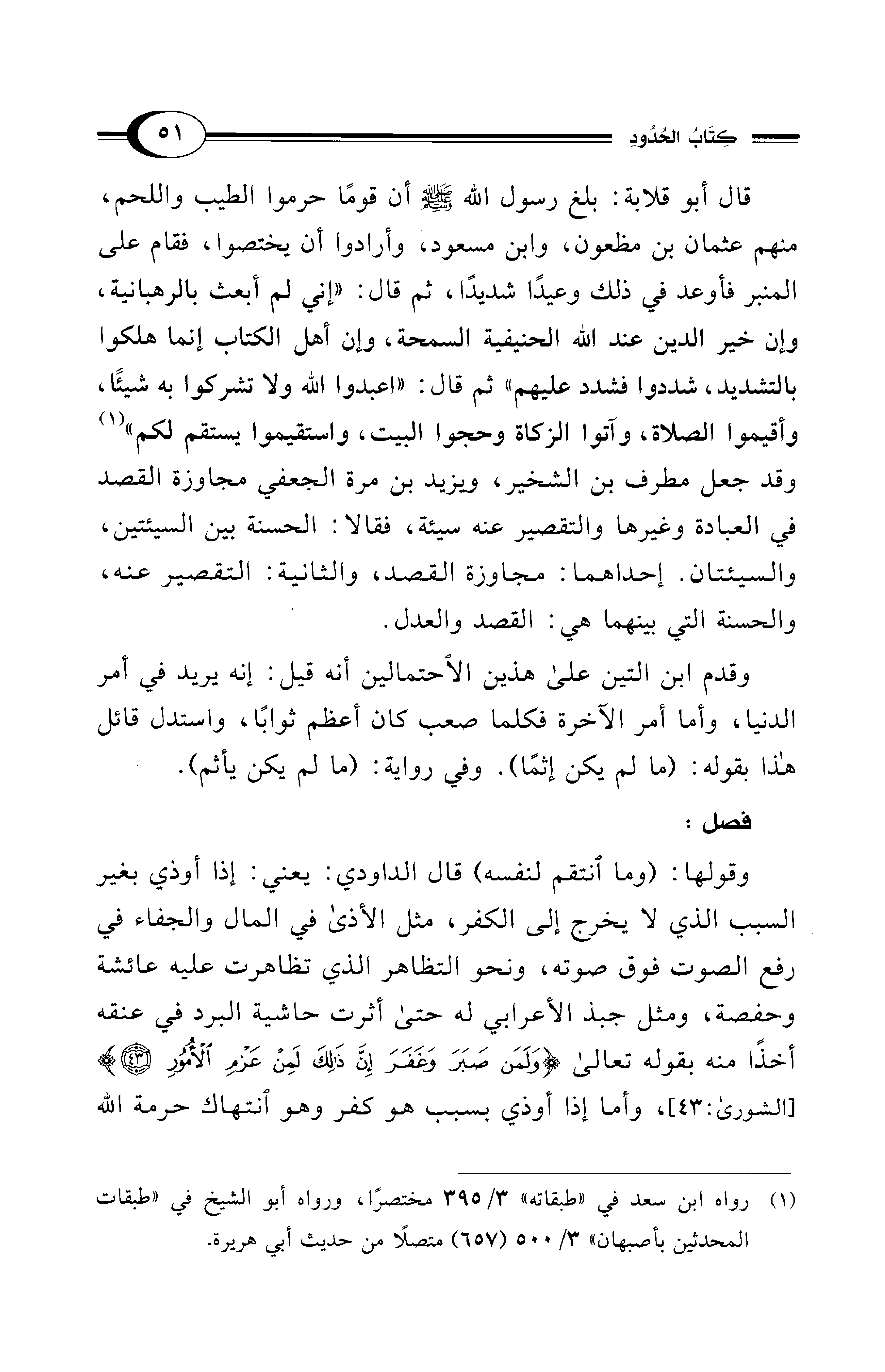 قال أبو قلابة: بلغ رسول الله - صلى الله عليه وسلم - أن قومًا حرموا الطيب واللحم، منهم عثمان بن مظعون، وابن مسعود، وأرادوا أن يختصوا، فقام على المنبر فأوعد في ذلك وعيدًا شديدًا، ثم قال: "إني لم أبعث بالرهبانية، وإن خير الدين عند الله الحنيفية السمحة، وإن أهل الكتاب إنما هلكوا بالتشديد، شددوا فشدد عليهم" ثم قال: "اعبدوا الله ولا تشركوا به شيئًا، وأقيموا الصلاة، وآتوا الزكاة وحجوا البيت، واستقيموا يستقم لكم" (¬1) وقد جعل مطرف بن الشخير، ويزيد بن مرة الجعفي مجاوزة القصد في العبادة وغيرها والتقصير عنه سيئة، فقالا: الحسنة بين السيئتين، والسيئتان. إحداهما: مجاوزة القصد، والثانية: التقصير عنه، والحسنة التي بينهما هي: القصد والعدل.