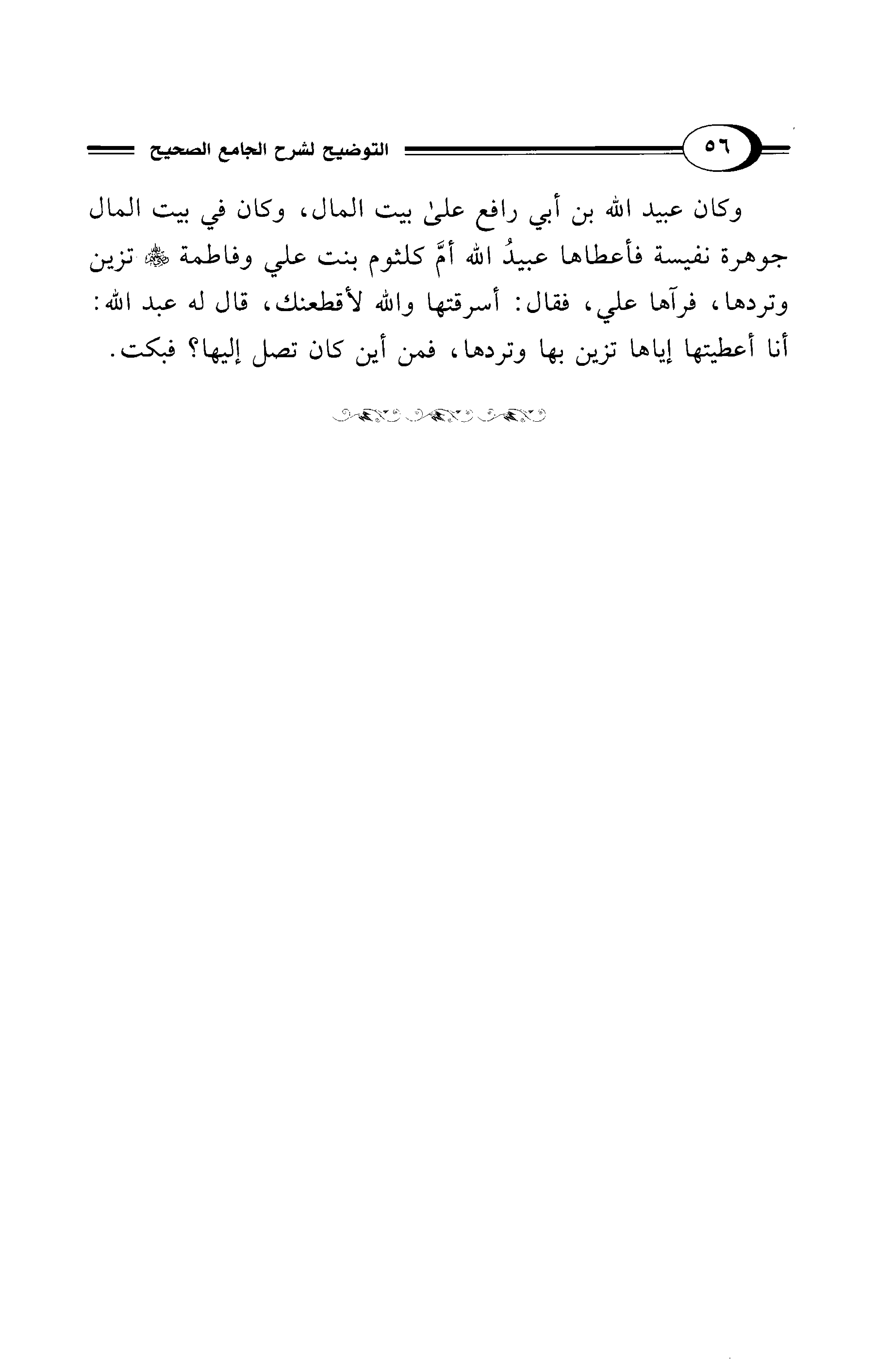 وكان عبيد الله بن أبي رافع على بيت المال، وكان في بيت المال جوهرة نفيسة فأعطاها عبيدُ الله أمَّ كلثوم بنت علي وفاطمة - رضي الله عنه - تزين وتردها، فرآها علي، فقال: أسرقتها والله لأقطعنك، قال له عبد الله: أنا أعطيتها إياها تزين بها وتردها، فمن أين كان تصل إليها؟ فبكت.