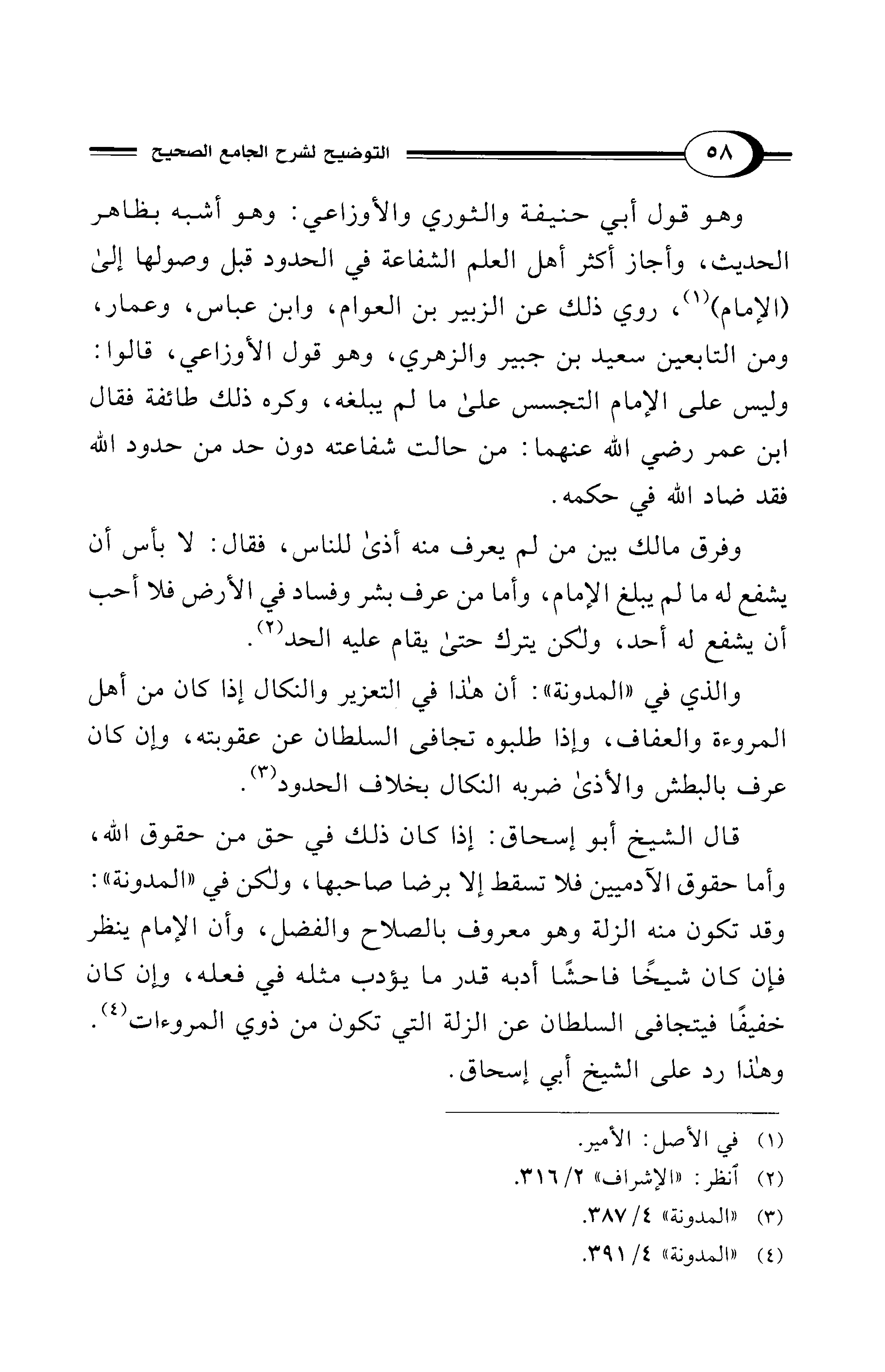 وهو قول أبي حنيفة والثوري والأوزاعي: وهو أشبه بظاهر الحديث، وأجاز أكثر أهل العلم الشفاعة في الحدود قبل وصولها إلى (الإمام) (¬1)، روي ذلك عن الزبير بن العوام، وابن عباس، وعمار، ومن التابعين سعيد بن جبير والزهري، وهو قول الأوزاعي، قالوا: وليس على الإمام التجسس على ما لم يبلغه، وكره ذلك طائفة فقال ابن عمر - رضي الله عنهما -: من حالت شفاعته دون حد من حدود الله فقد ضاد الله في حكمه.