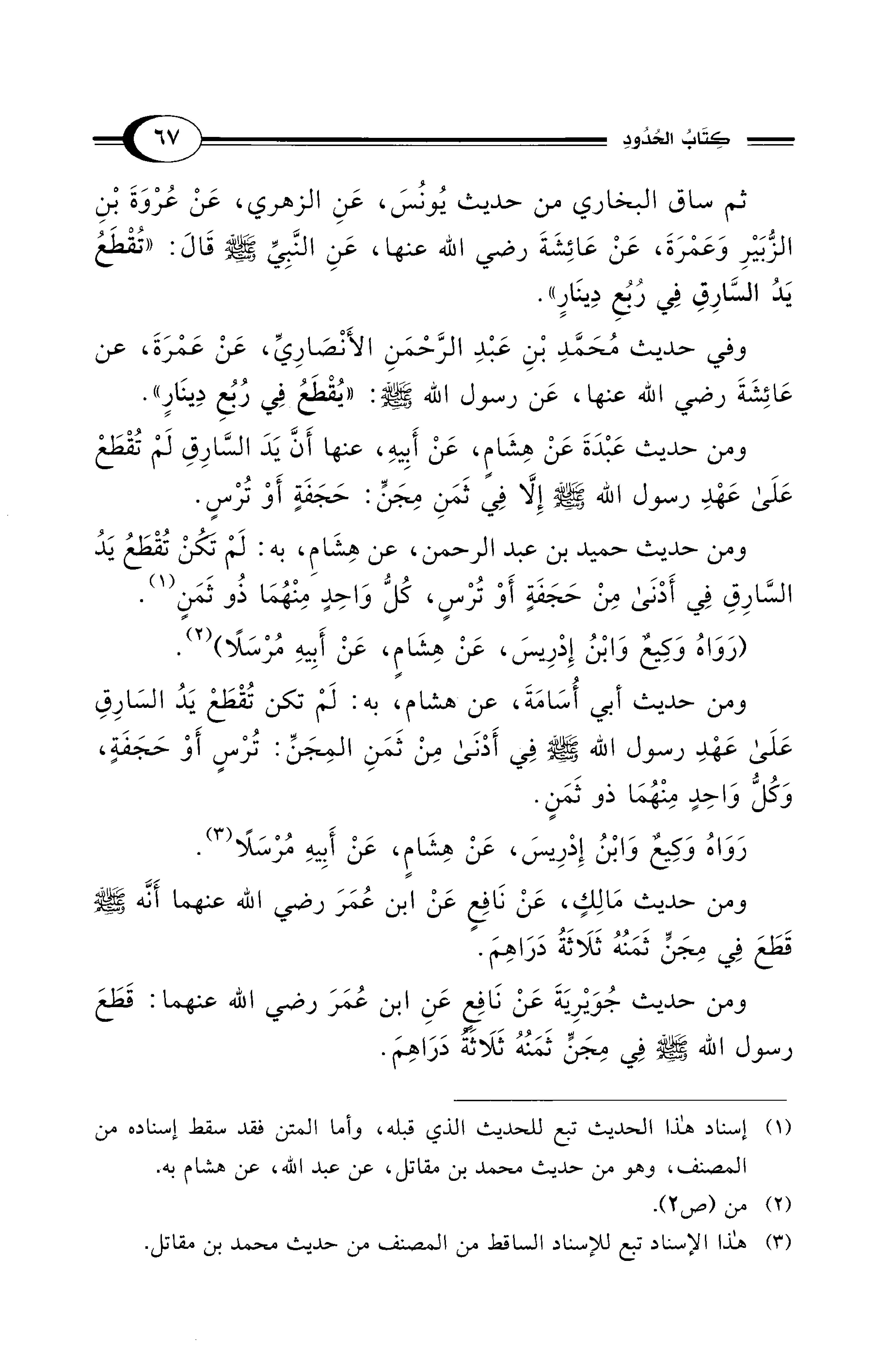 ومن حديث أبي أُسَامَةَ، عن هشام، به: لَمْ تكن تُقْطَعْ يَدُ السَارِقِ عَلَى عَهْدِ رسول الله - صلى الله عليه وسلم - فِي أَدْنَى مِنْ ثَمَنِ المِجَنِّ: تُرْسٍ أَوْ حَجَفَةٍ، وَكُلُّ وَاحِدٍ مِنْهُمَا ذو ثَمَنٍ.