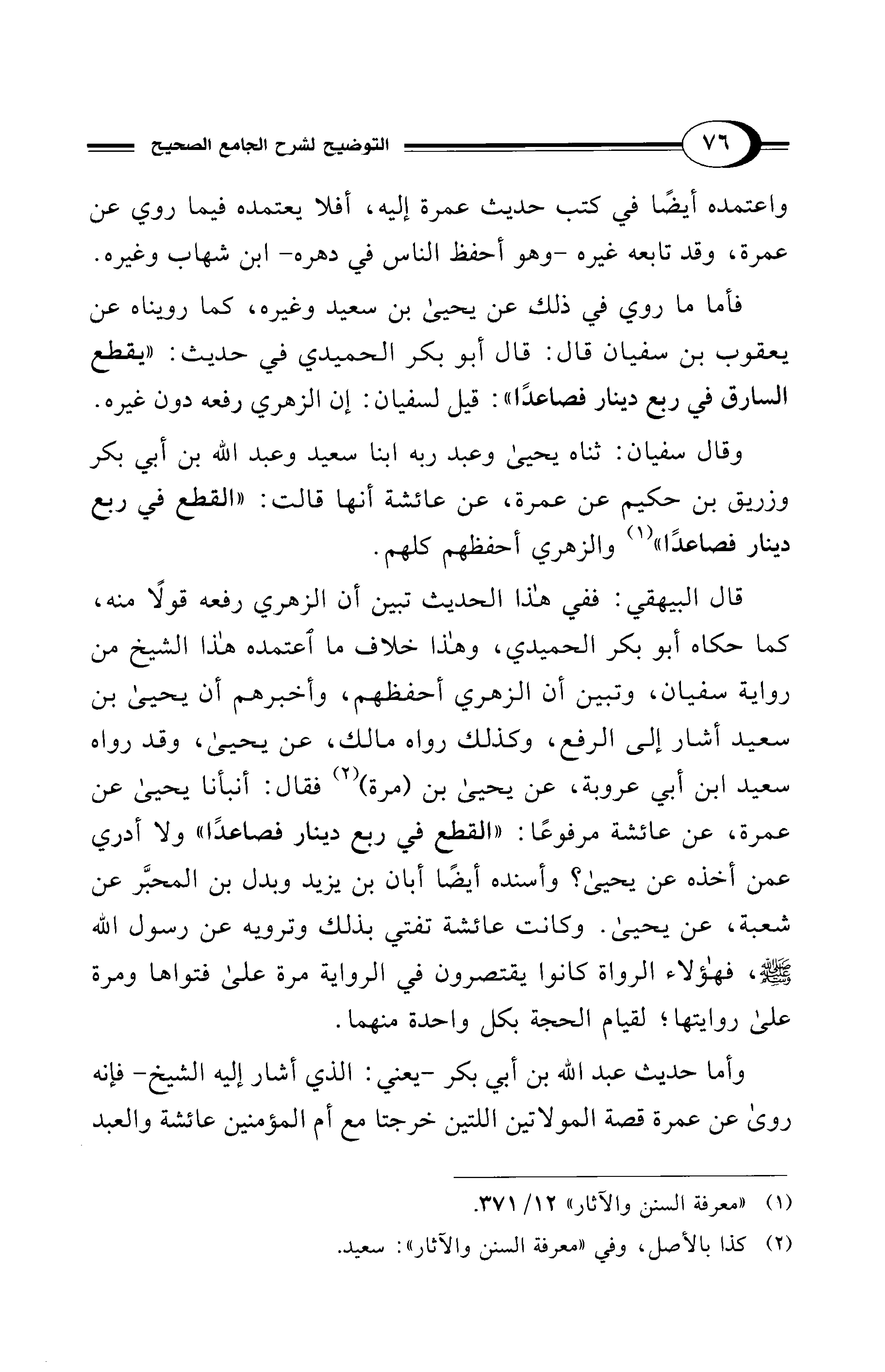 قال البيهقي: ففي هذا الحديث تبين أن الزهري رفعه قولًا منه، كما حكاه أبو بكر الحميدي، وهذا خلاف ما اعتمده هذا الشيخ من رواية سفيان، وتبين أن الزهري أحفظهم، وأخبرهم أن يحيى بن سعيد أشار إلى الرفع، وكذلك رواه مالك، عن يحيى، وقد رواه سعيد ابن أبي عروبة، عن يحيى بن (مرة) (¬2) فقال: أنبأنا يحيى عن عمرة، عن عائشة مرفوعًا: "القطع في ربع دينار فصاعدًا" ولا أدري عمن أخذه عن يحيى؟ وأسنده أيضًا أبان بن يزيد وبدل بن المحبَّر عن شعبة، عن يحيى. وكانت عائشة تفتي بذلك وترويه عن رسول الله - صلى الله عليه وسلم -، فهؤلاء الرواة كانوا يقتصرون في الرواية مرة على فتواها ومرة على روايتها؛ لقيام الحجة بكل واحدة منهما.