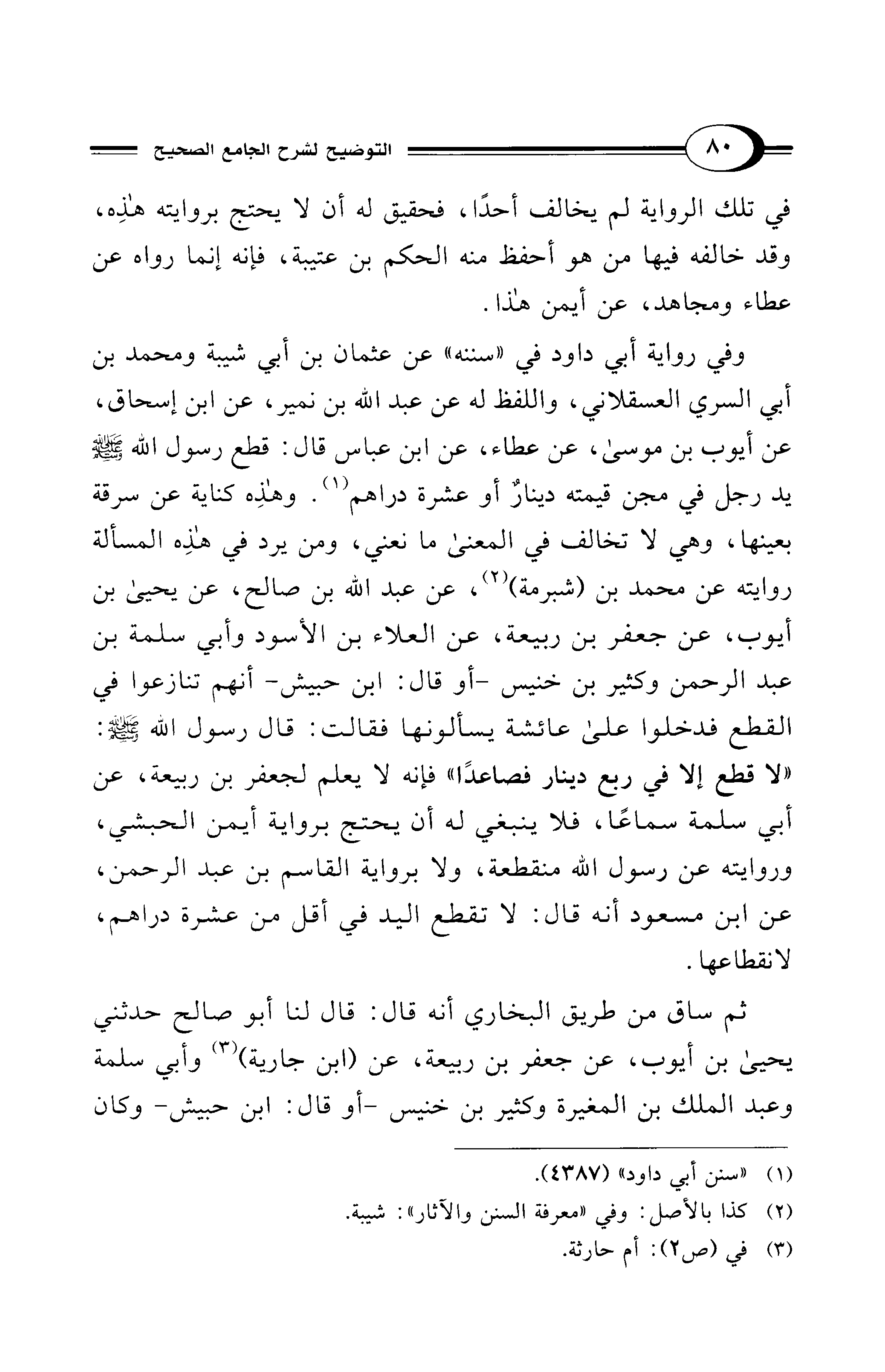 وفي رواية أبي داود في "سننه" عن عثمان بن أبي شيبة ومحمد بن أبي السري العسقلاني، واللفظ له عن عبد الله بن نمير، عن ابن إسحاق، عن أيوب بن موسى، عن عطاء، عن ابن عباس قال: قطع رسول الله - صلى الله عليه وسلم - يد رجل في مجن قيمته دينارٌ أو عشرة دراهم (¬1). وهذِه كناية عن سرقة بعينها، وهي لا تخالف في المعنى ما نعني، ومن يرد في هذِه المسألة روايته عن محمد بن (شبرمة) (¬2)، عن عبد الله بن صالح، عن يحيى بن أيوب، عن جعفر بن ربيعة، عن العلاء بن الأسود وأبي سلمة بن عبد الرحمن وكثير بن خنيس -أو قال: ابن حبيش- أنهم تنازعوا في القطع فدخلوا على عائشة يسألونها فقالت: قال رسول الله - صلى الله عليه وسلم -: "لا قطع إلا في ربع دينار فصاعدًا" فإنه لا يعلم لجعفر بن ربيعة، عن أبي سلمة سماعًا، فلا ينبغي له أن يحتج برواية أيمن الحبشي، وروايته عن رسول الله منقطعة، ولا برواية القاسم بن عبد الرحمن، عن ابن مسعود أنه قال: لا تقطع اليد في أقل من عشرة دراهم، لانقطاعها.