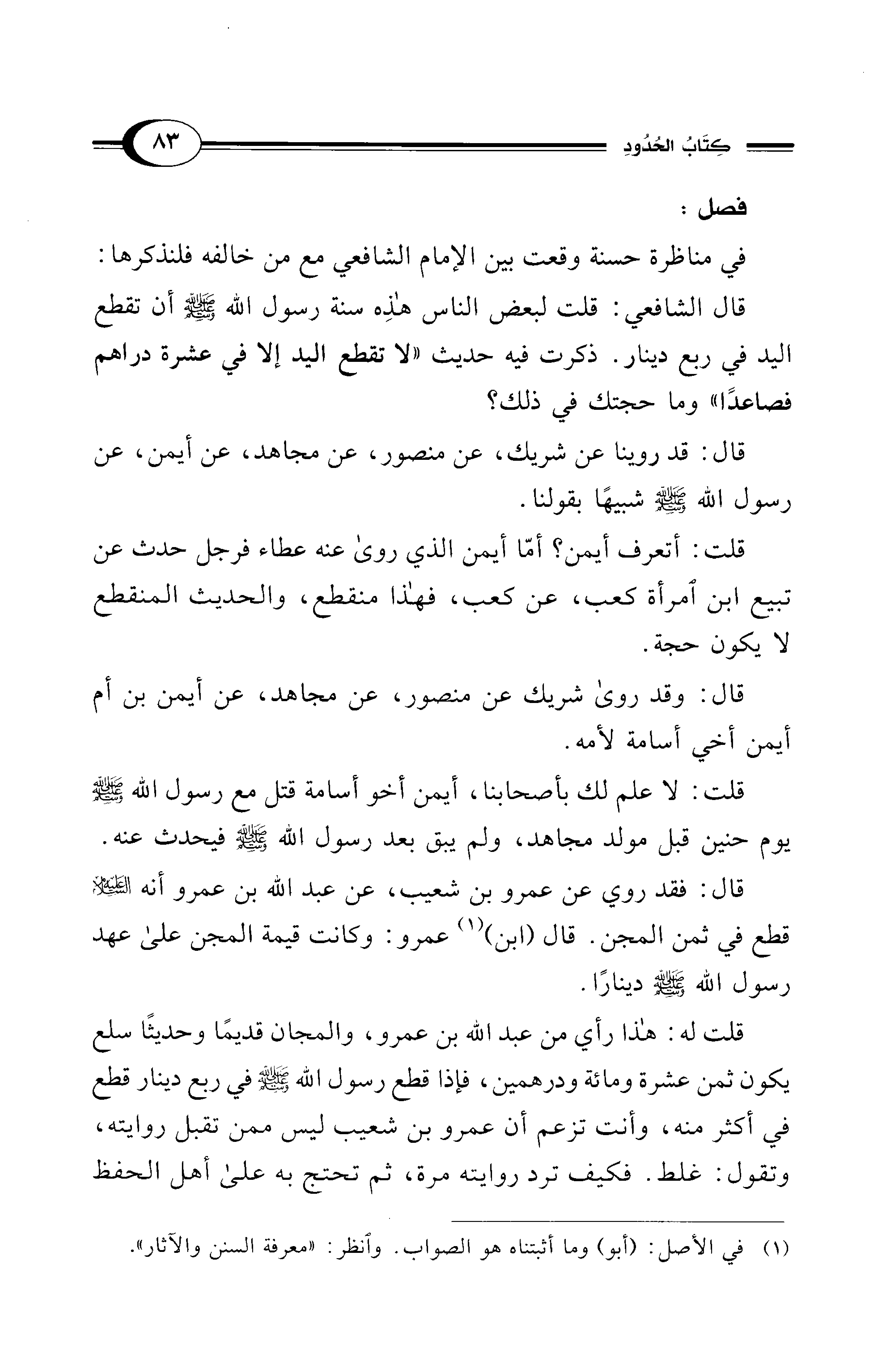 قال الشافعي: قلت لبعض الناس هذِه سنة رسول الله - صلى الله عليه وسلم - أن تقطع اليد في ربع دينار. ذكرت فيه حديث "لا تقطع اليد إلا في عشرة دراهم فصاعدًا" وما حجتك في ذلك؟