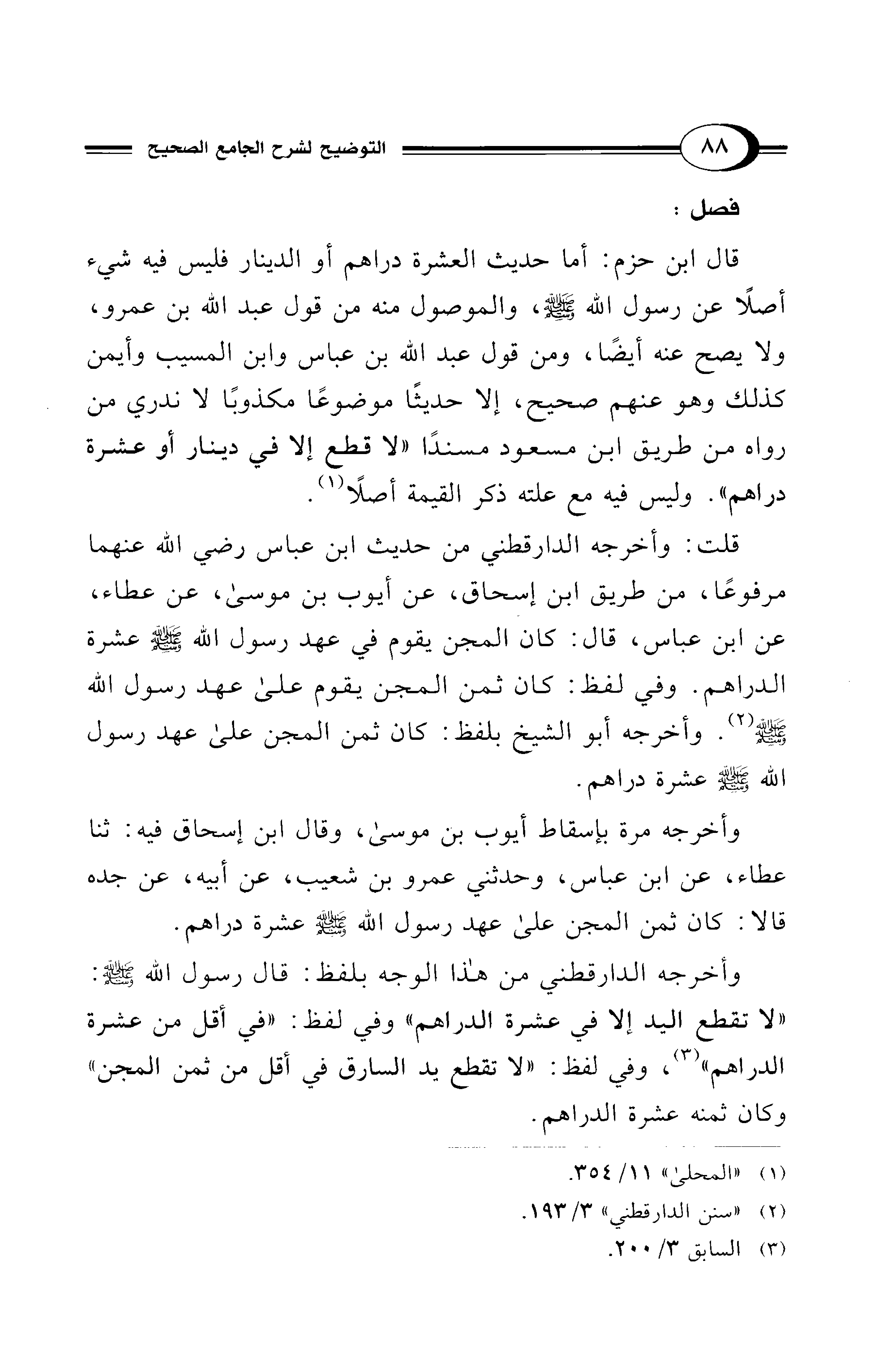 قال ابن حزم: أما حديث العشرة دراهم أو الدينار فليس فيه شيء أصلاً عن رسول الله - صلى الله عليه وسلم -، والموصول منه من قول عبد الله بن عمرو، ولا يصح عنه أيضًا، ومن قول عبد الله بن عباس وابن المسيب وأيمن كذلك وهو عنهم صحيح، إلا حديثًا موضوعًا مكذوبًا لا ندري من رواه من طريق ابن مسعود مسندًا "لا قطع إلا في دينار أو عشرة دراهم". وليس فيه مع علته ذكر القيمة أصلاً (¬1).